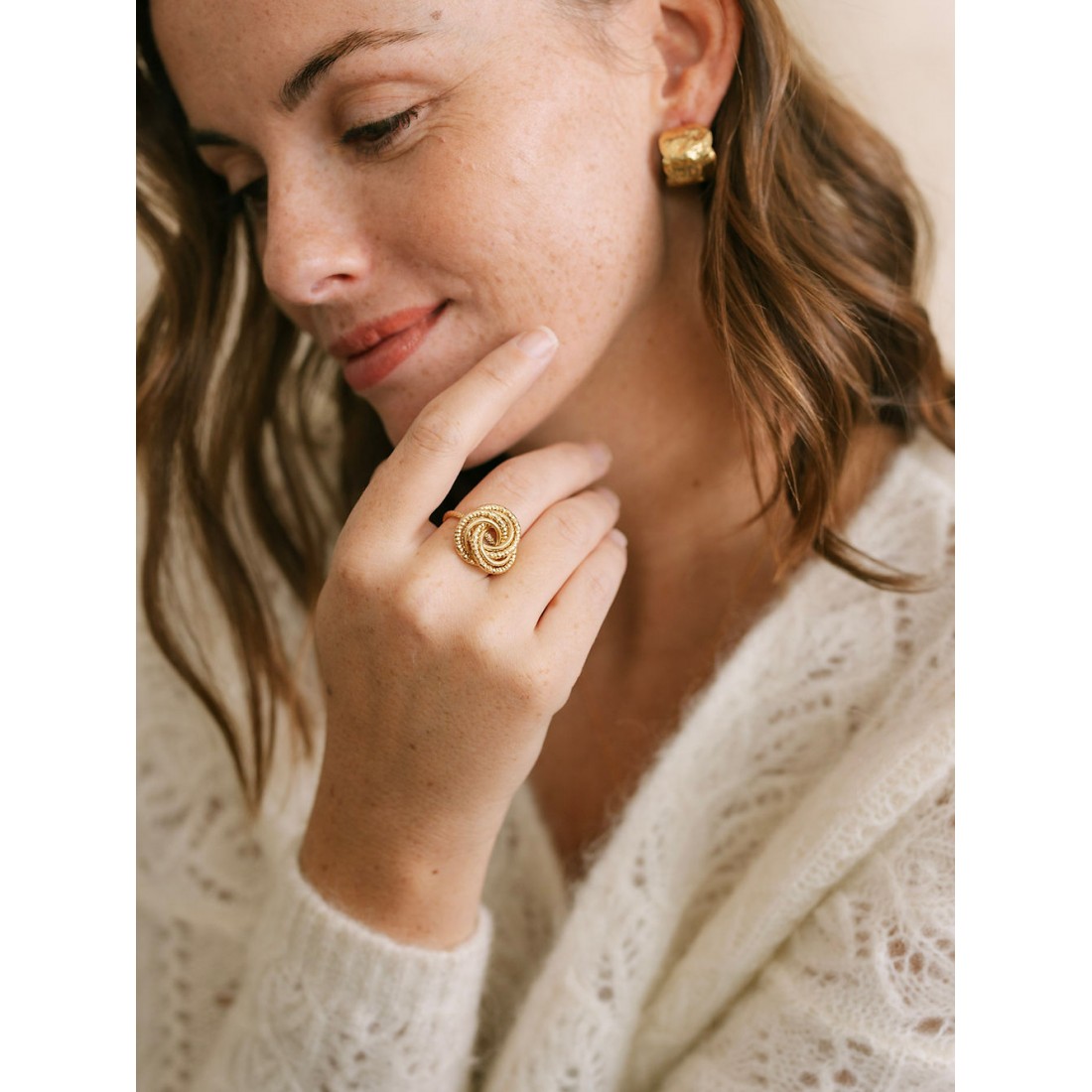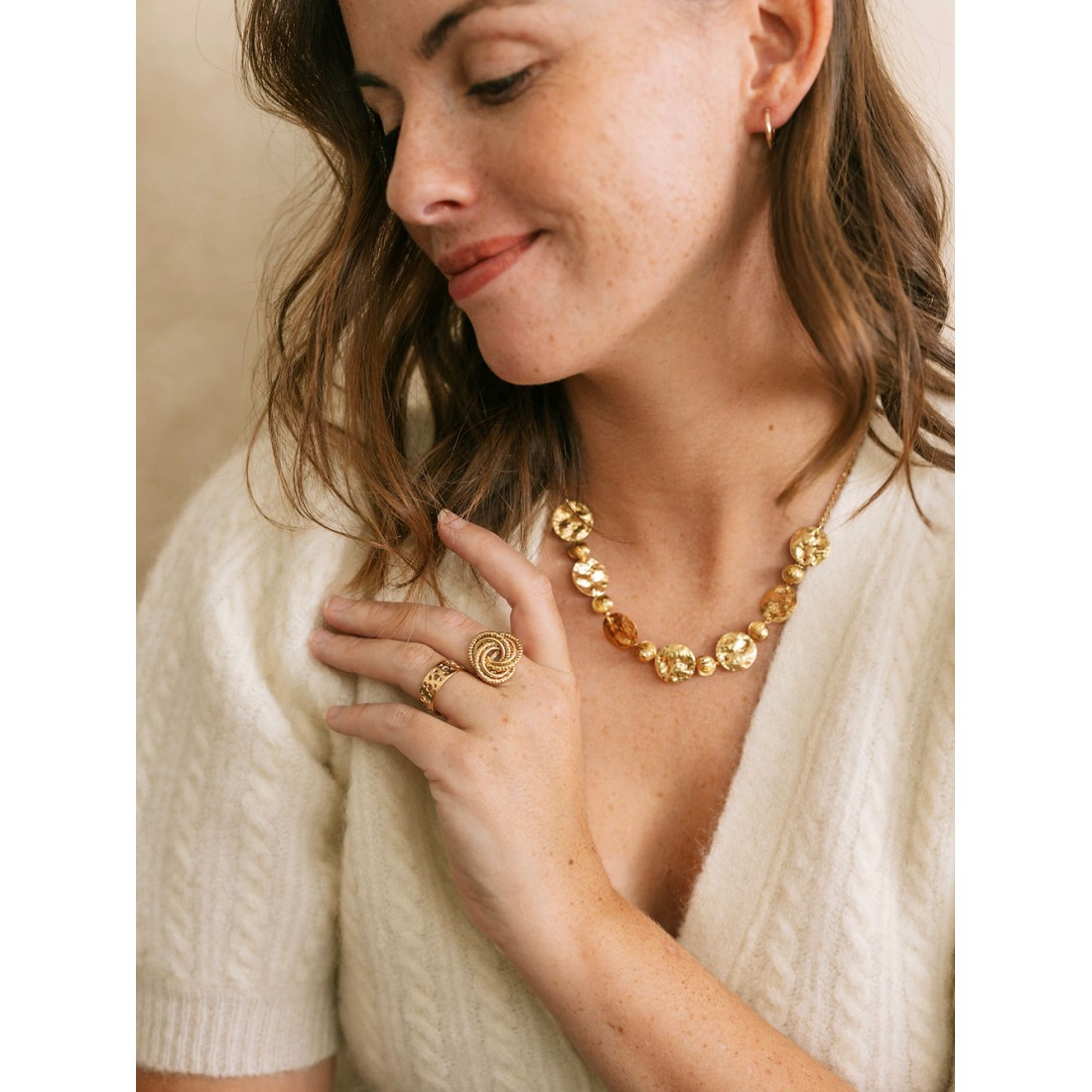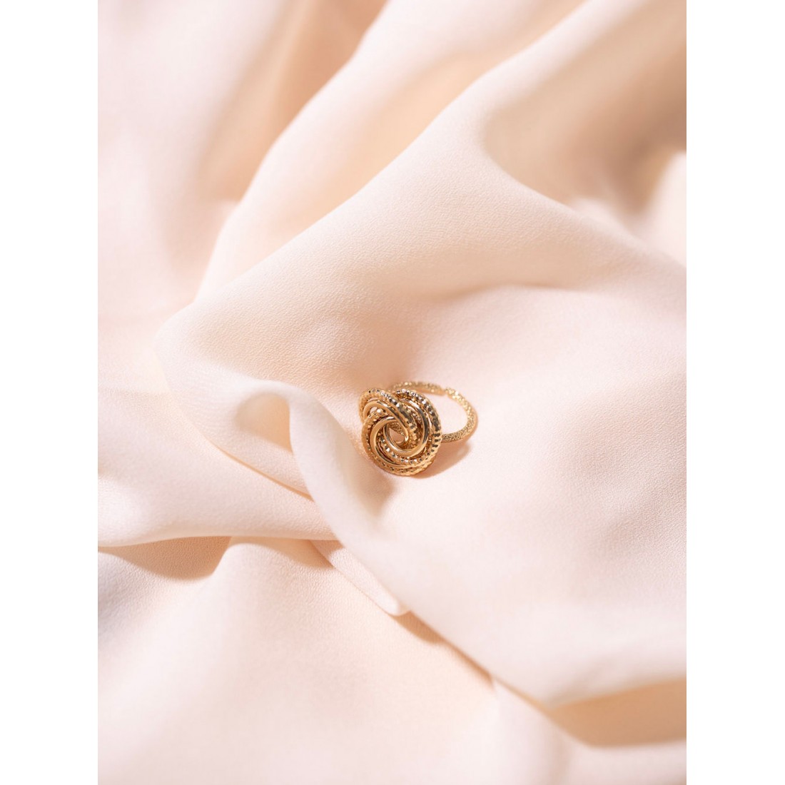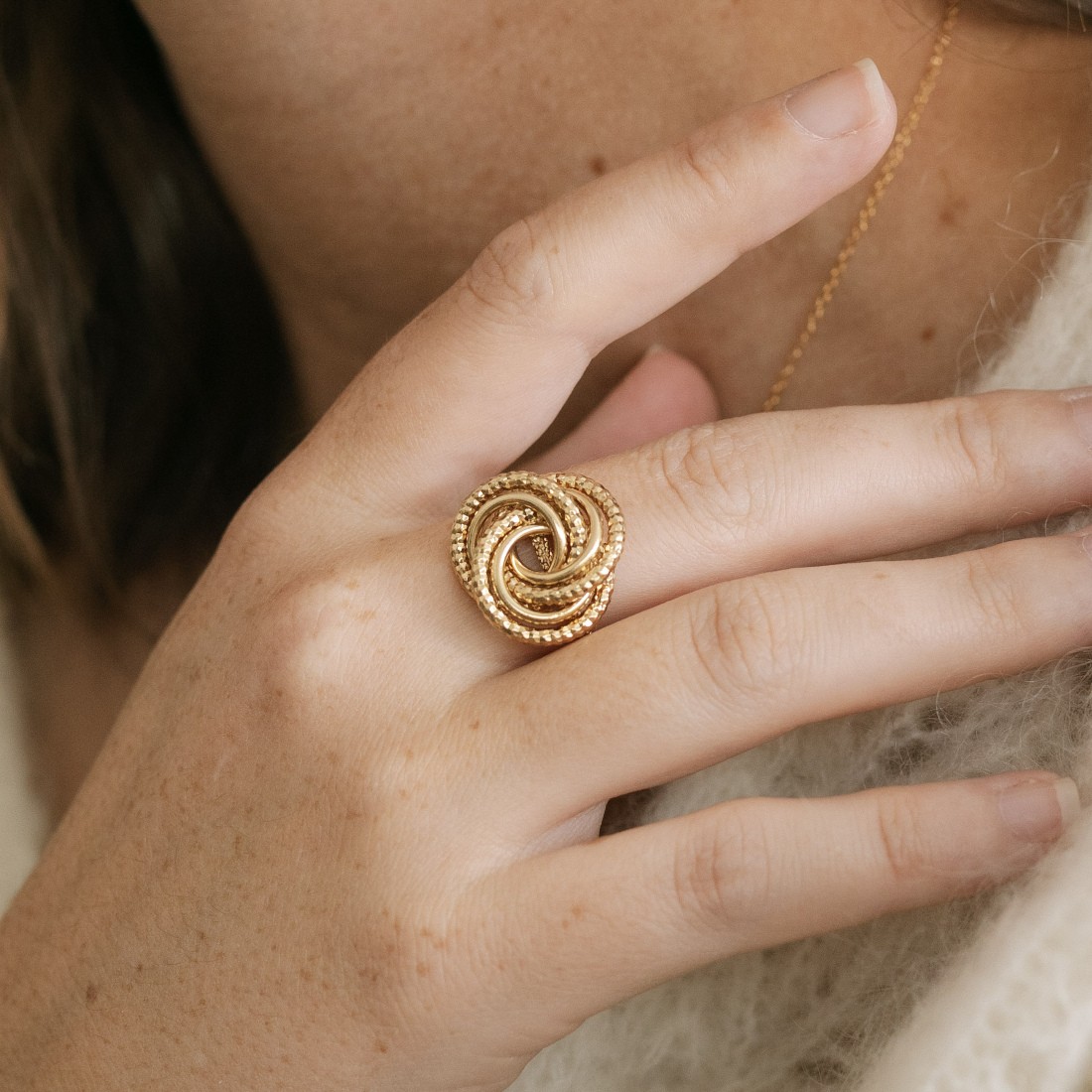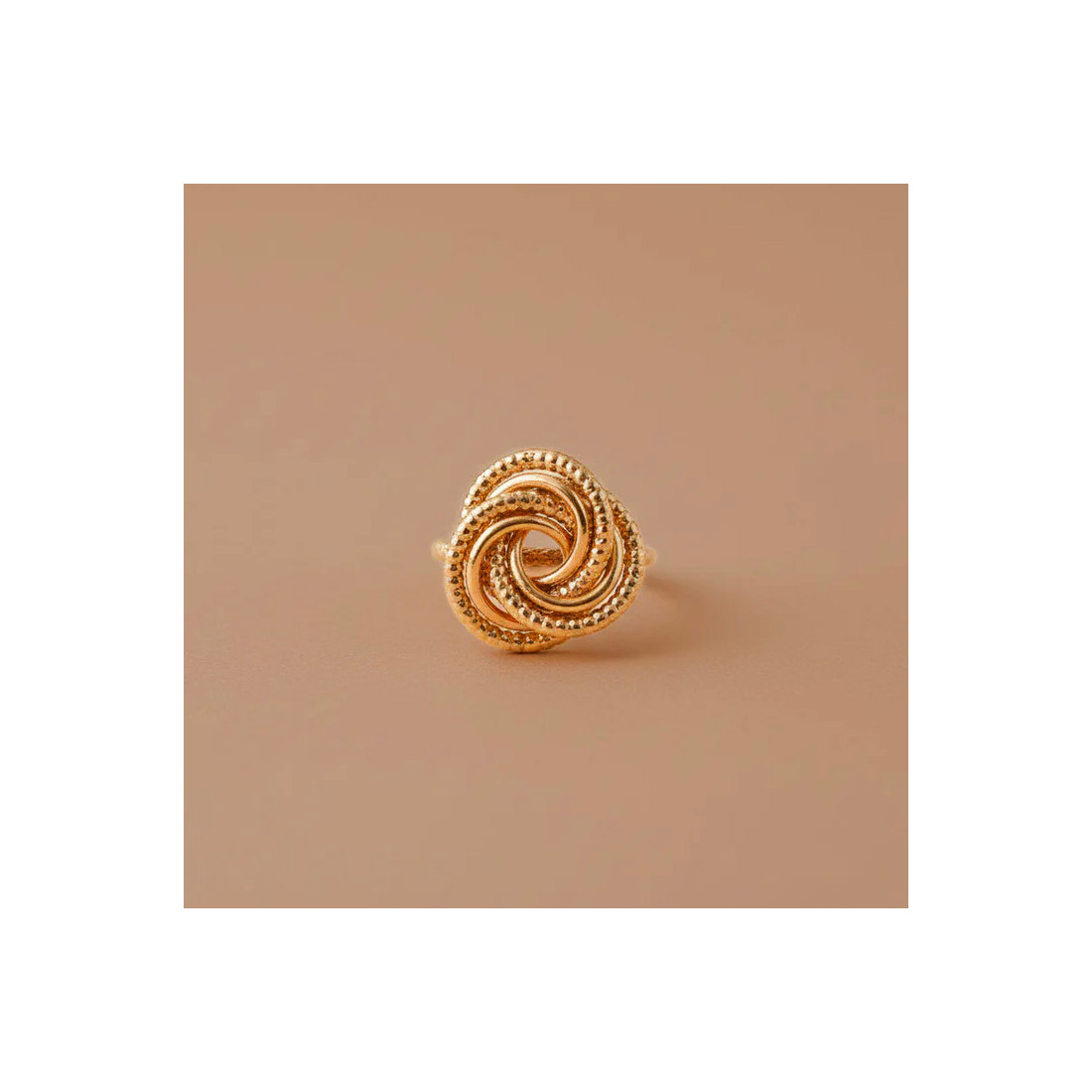 Jolie bague dorée à l'or fin 24 carats composée de plusieurs anneaux texturés et entrelacés symbolisant l'union et l'attachement.