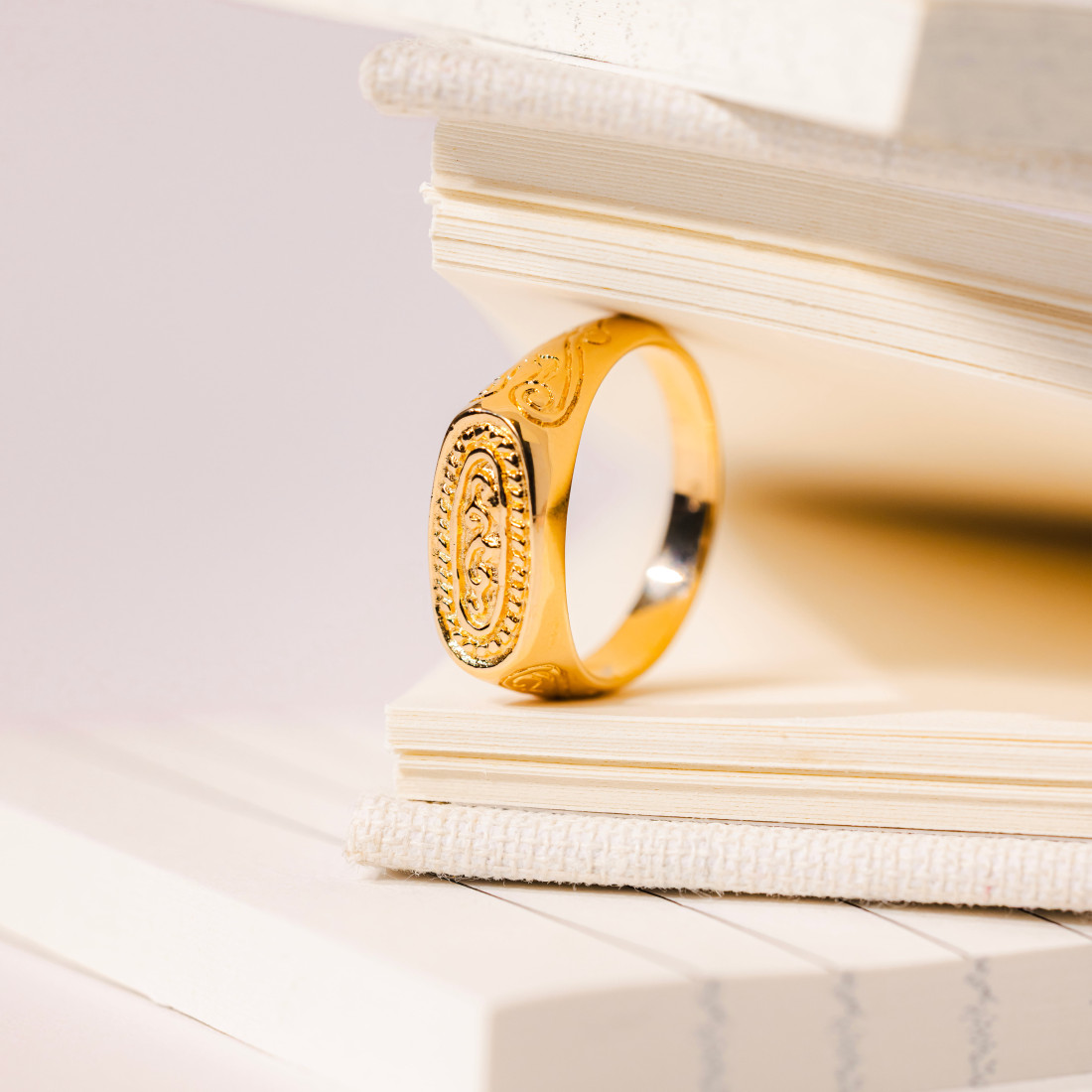On adore cette bague qui revisite la traditionnelle chevalière avec un souffle contemporain. Cette bague en plaqué or 3 microns offre un jeu de gravures délicates qui s'inspire du charme des bijoux anciens tout en ayant un look résolument moderne. Grâce à sa très belle épaisseur d'or (3 microns), elle ne s'oxyde pas, et résiste à l'eau et au temps !
