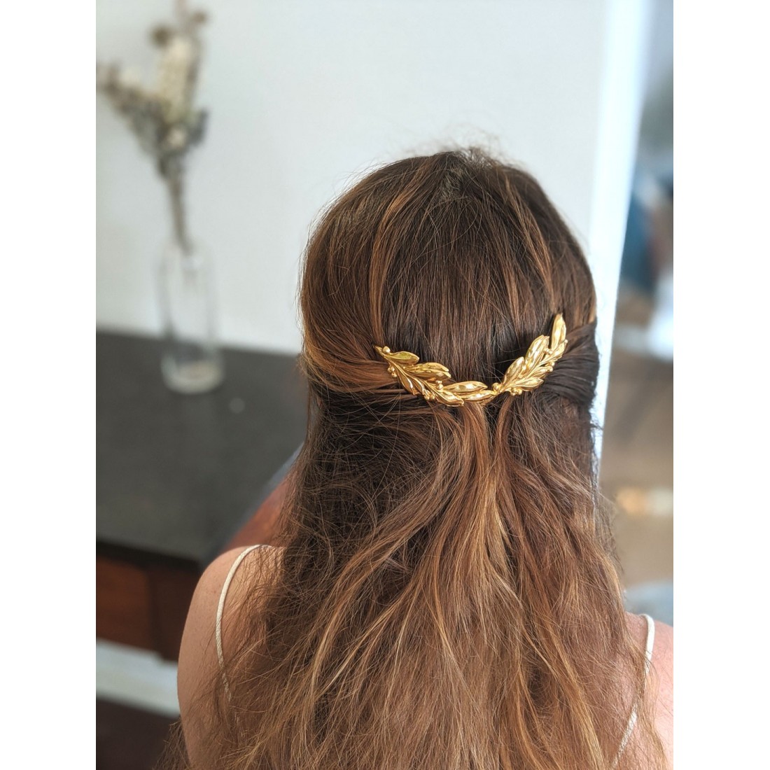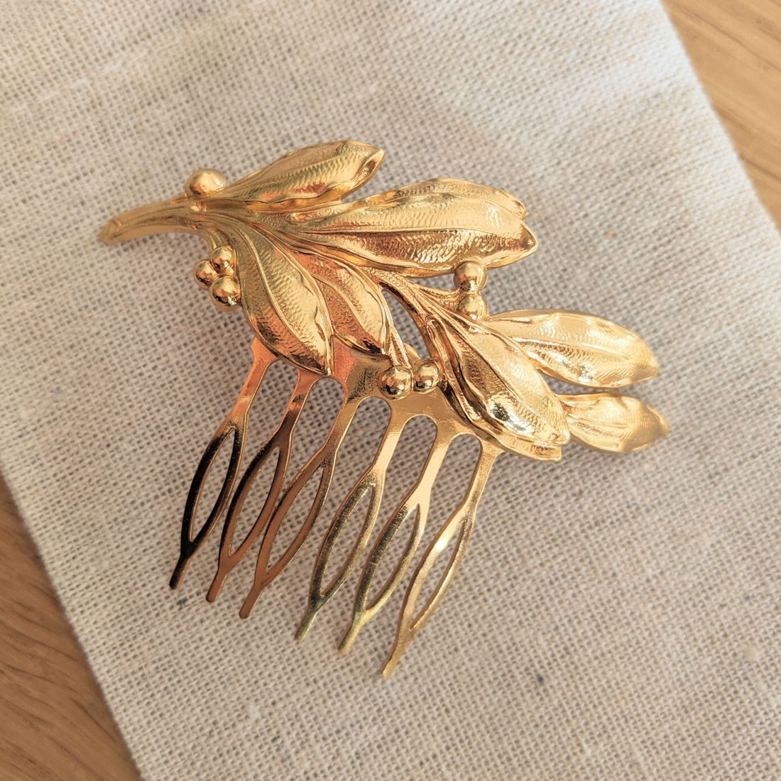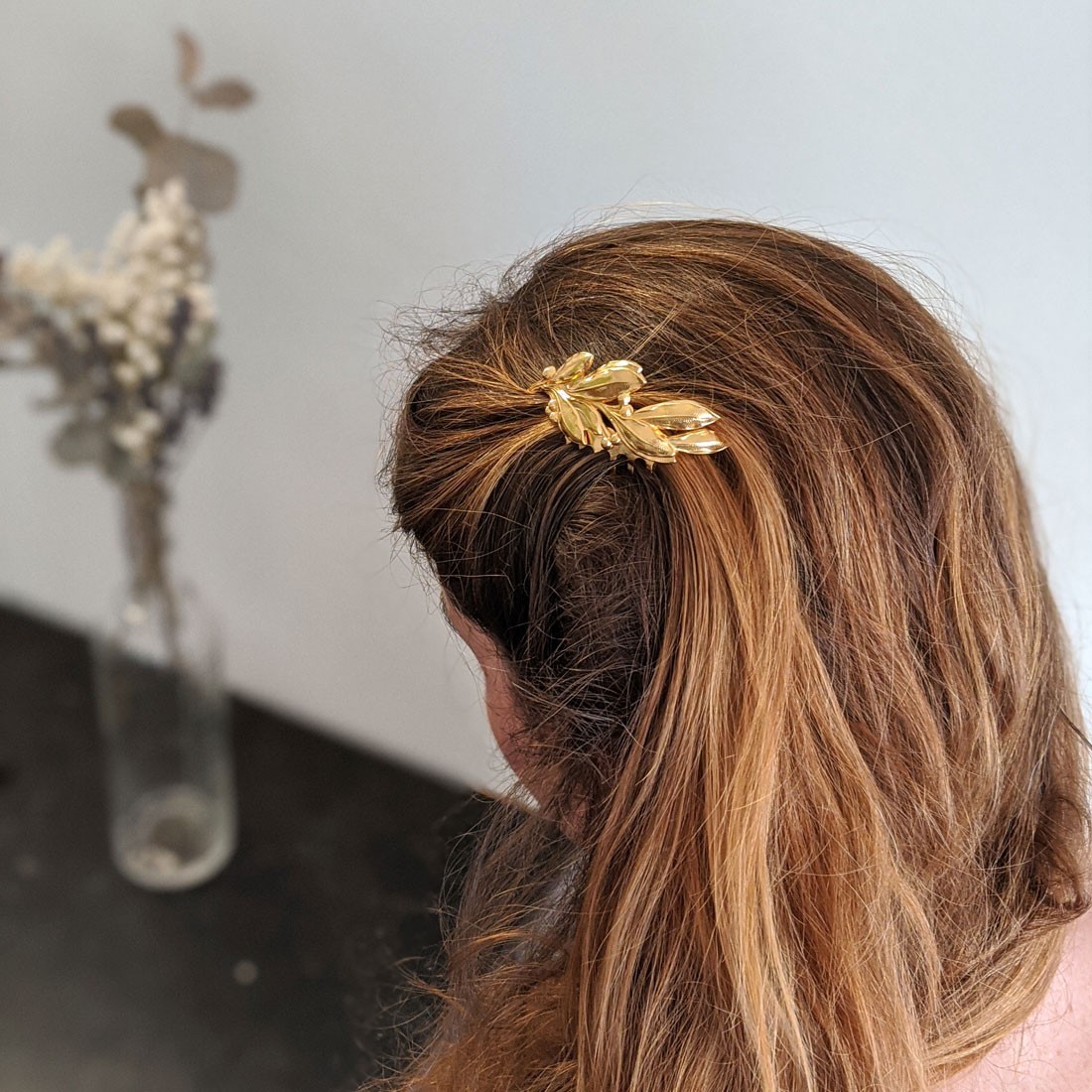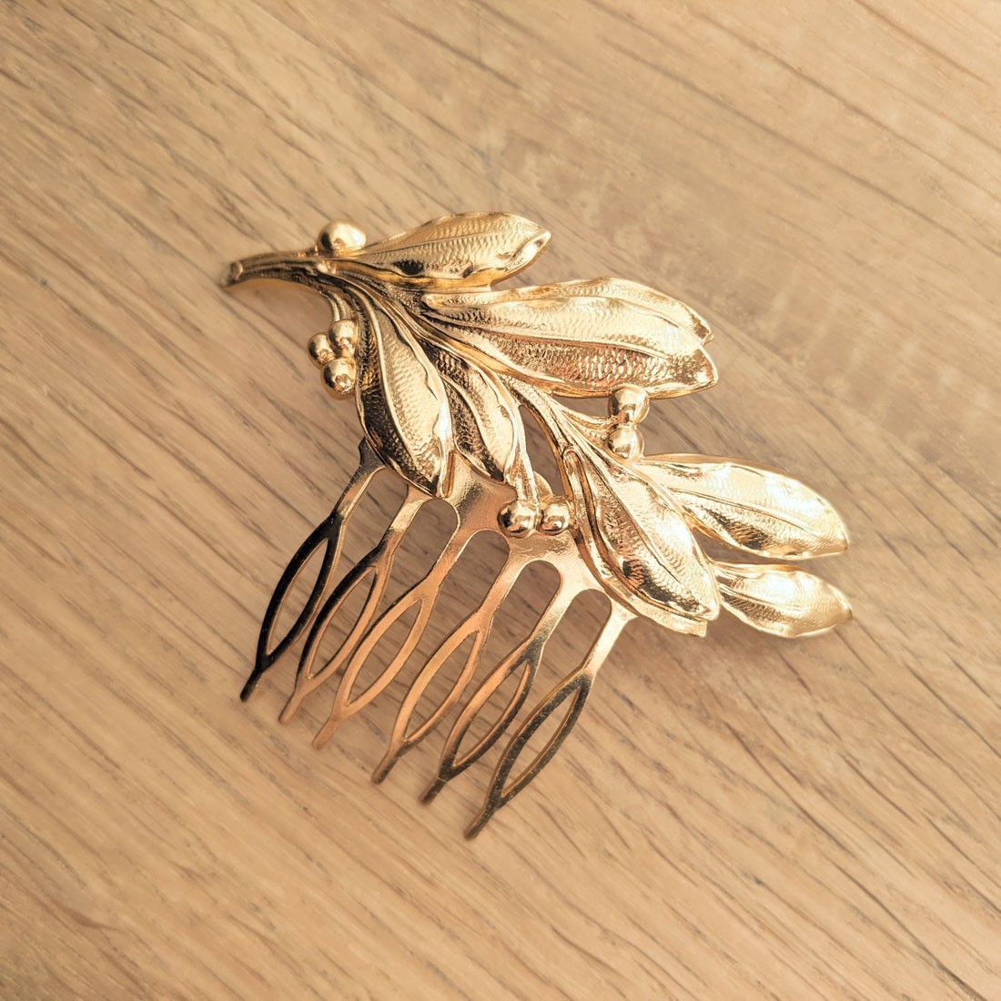 Coup de cœur pour ce peigne doré à l'or fin et entièrement made in France. Orné d'un rameau d'olivier doré, ce joli peigne illuminera d'une touche végétale un chignon de mariée, ou retiendra quelques mèches pour une coiffure bohème réussie.
