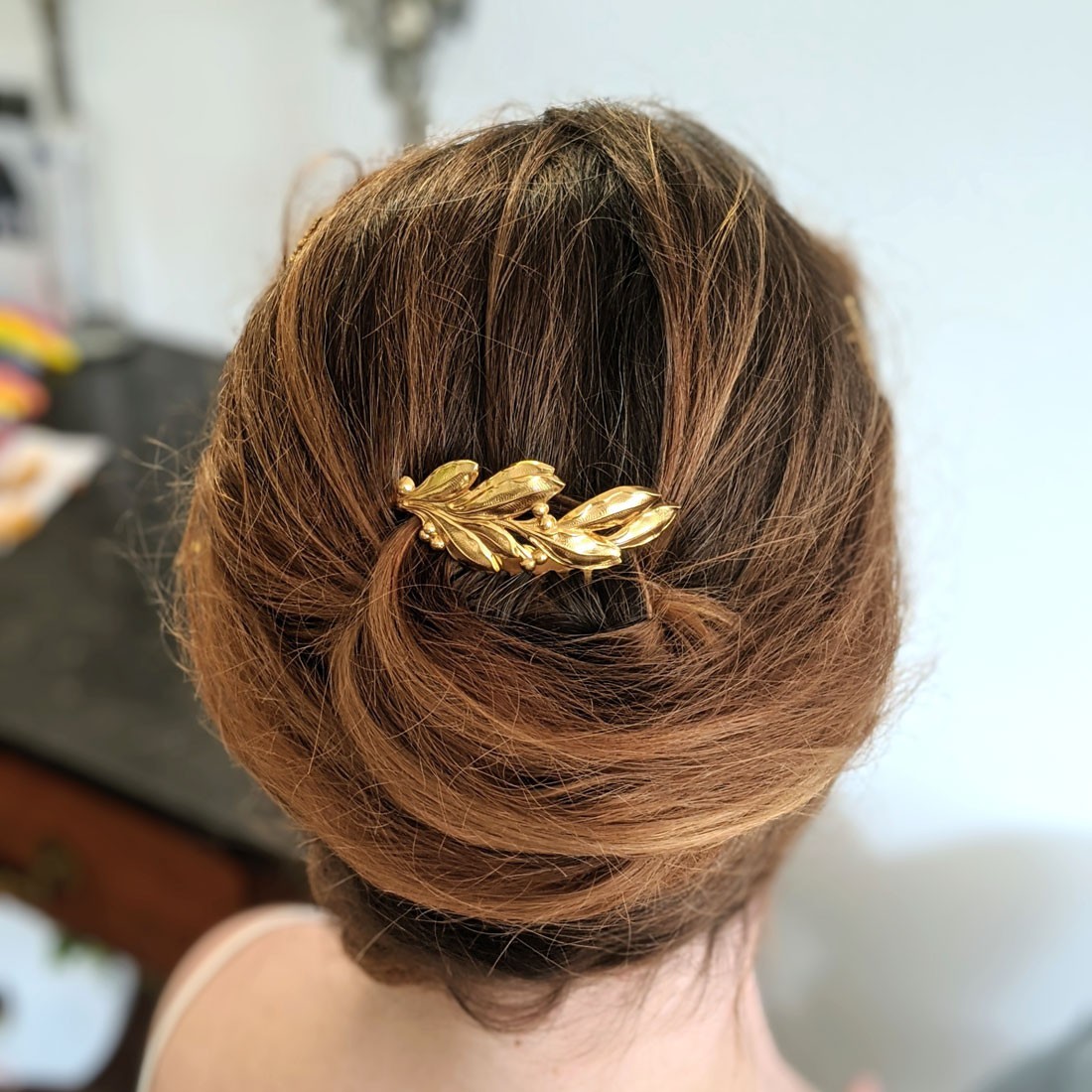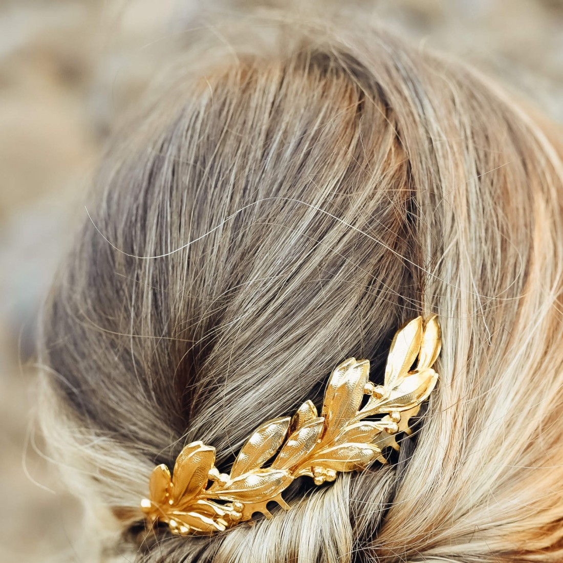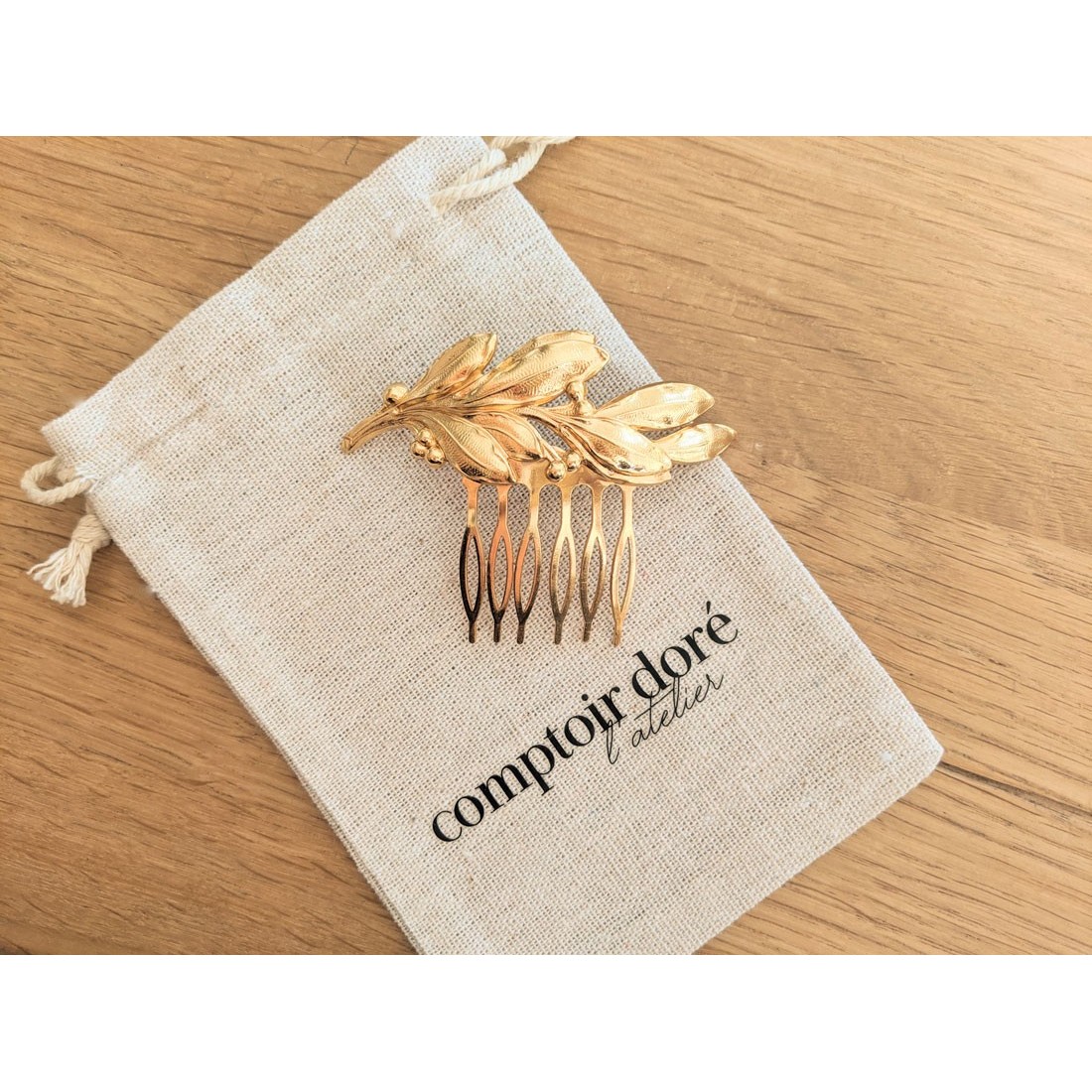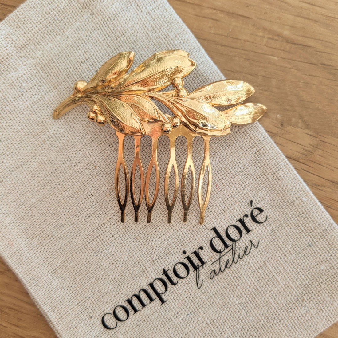 Coup de cœur pour ce peigne doré à l'or fin et entièrement made in France. Orné d'un rameau d'olivier doré, ce joli peigne illuminera d'une touche végétale un chignon de mariée, ou retiendra quelques mèches pour une coiffure bohème réussie.