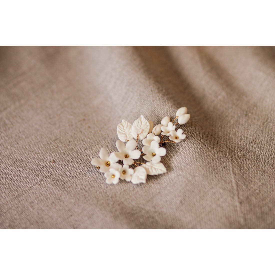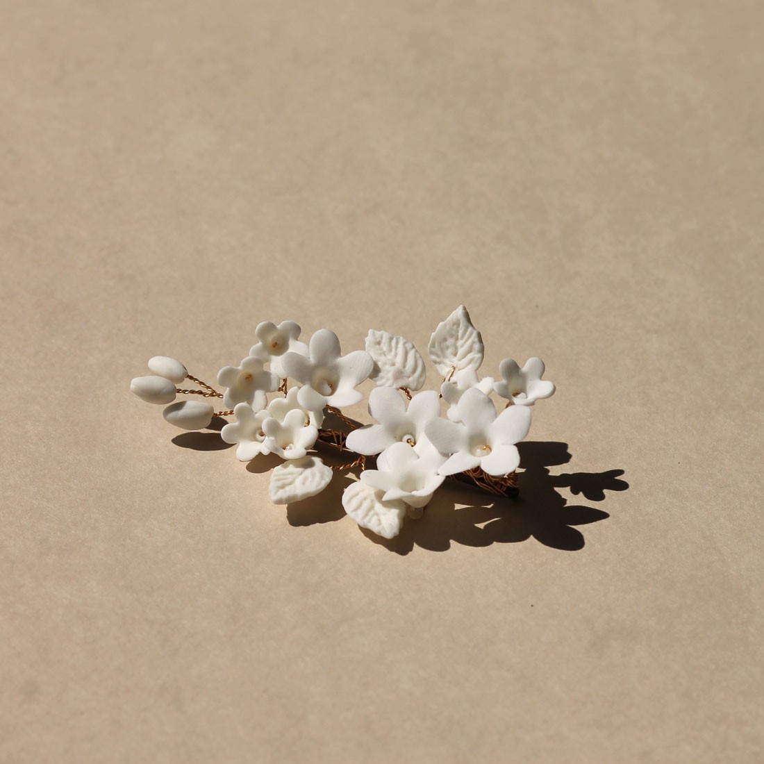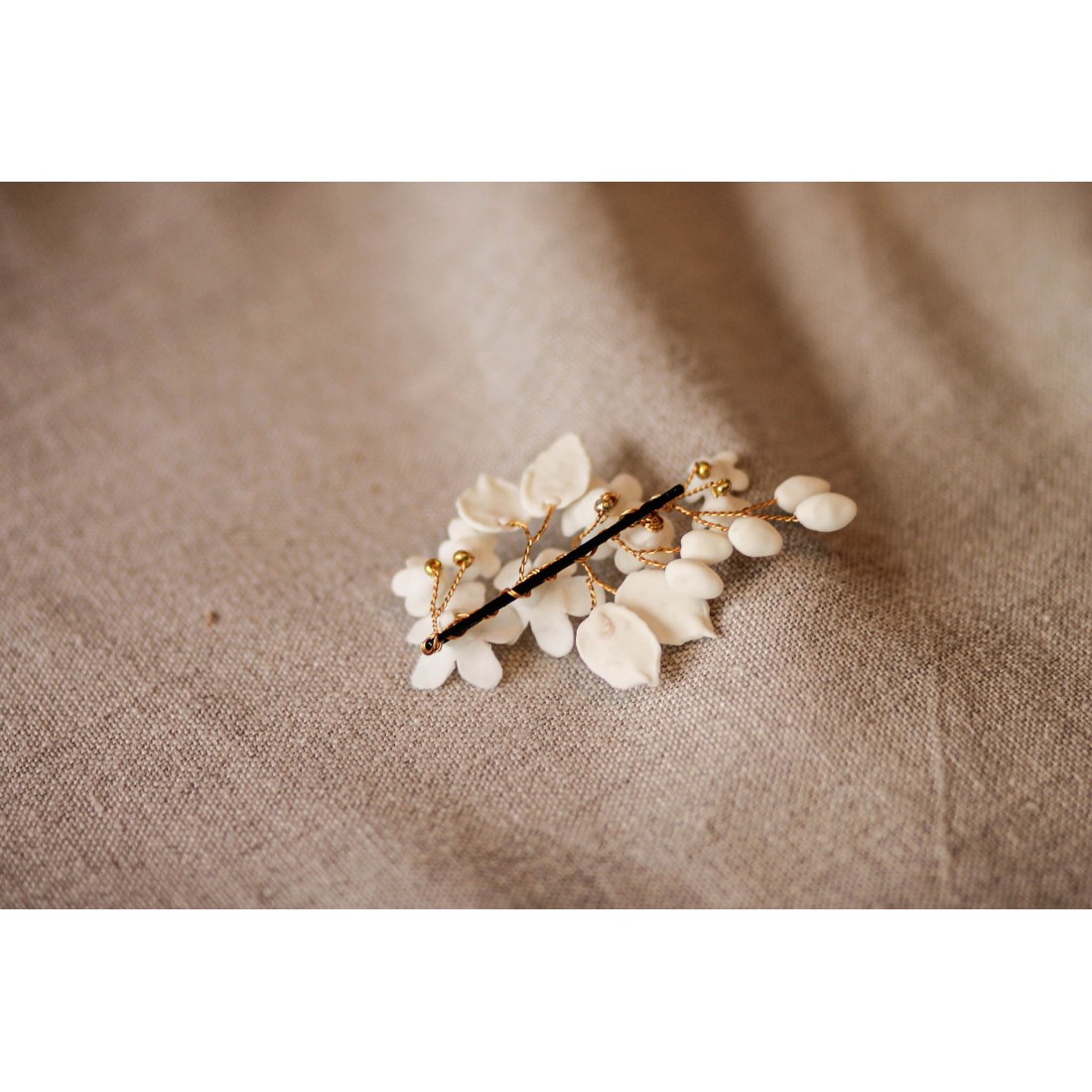 Jolie pince ornée de fleurs, feuilles et bourgeons en porcelaine froide, entièrement façonnée à la main. Une création signée Les Perles de la Bastide - Coraly T Bijoux.
