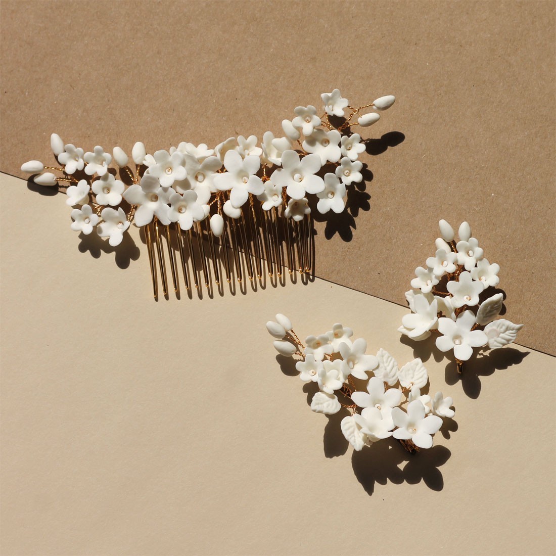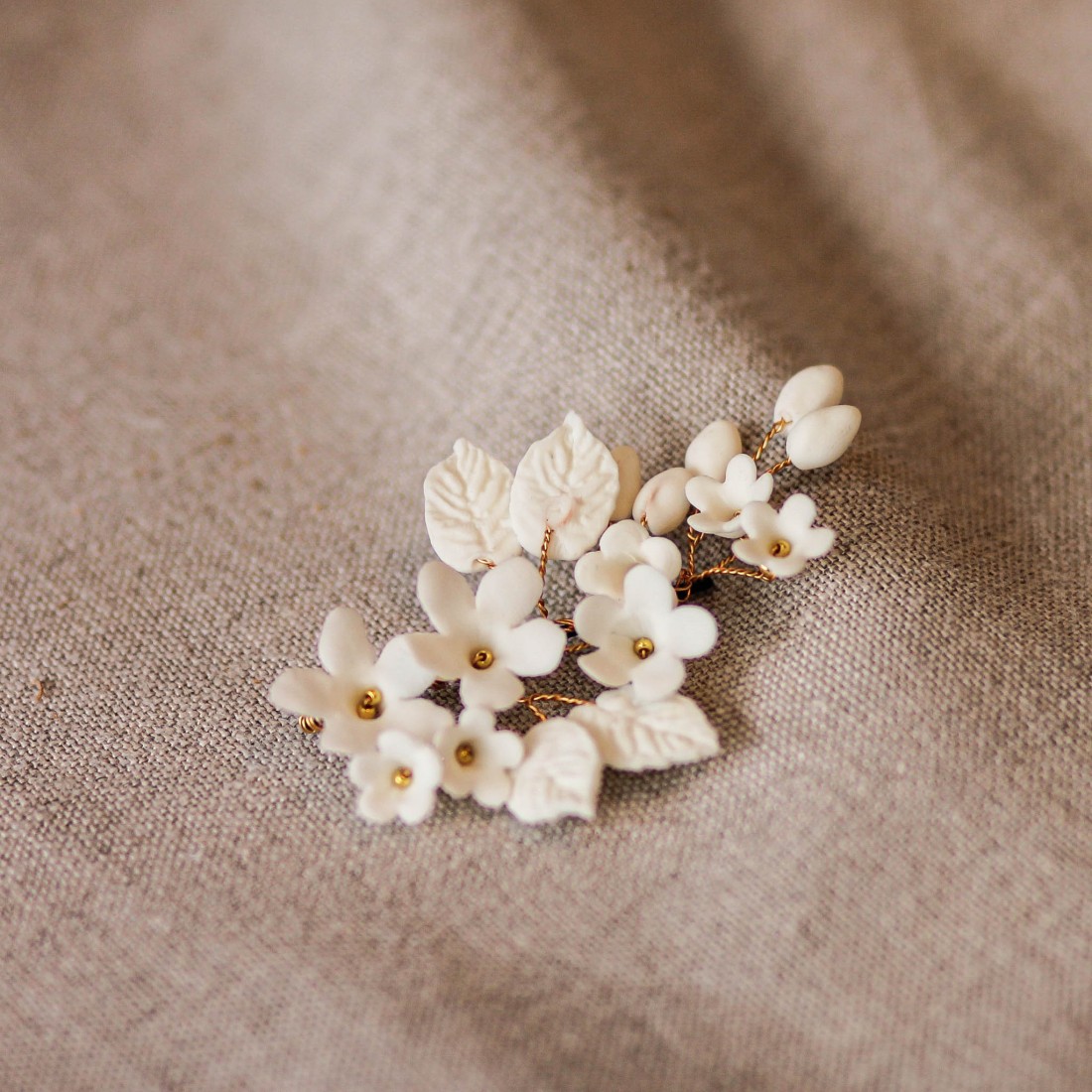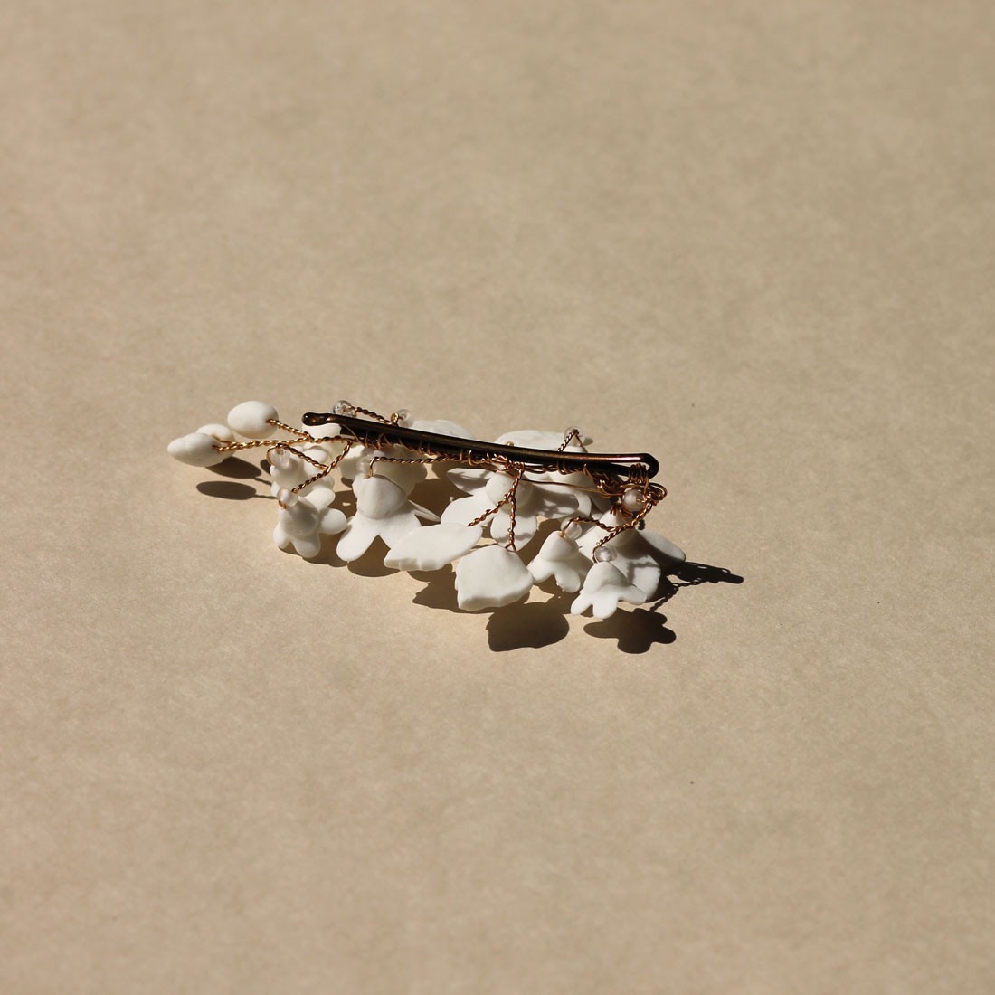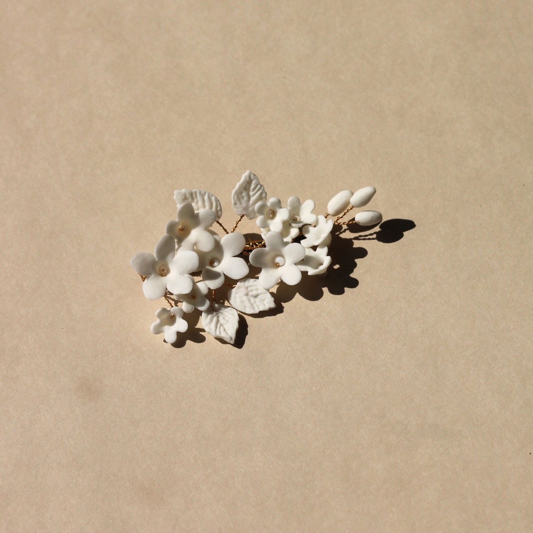 Jolie pince ornée de fleurs, feuilles et bourgeons en porcelaine froide, entièrement façonnée à la main. Une création signée Les Perles de la Bastide - Coraly T Bijoux.