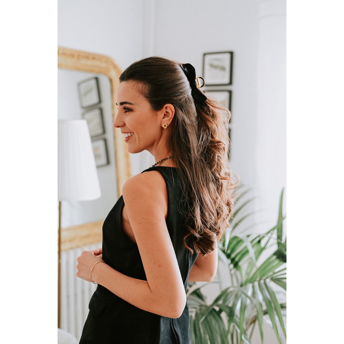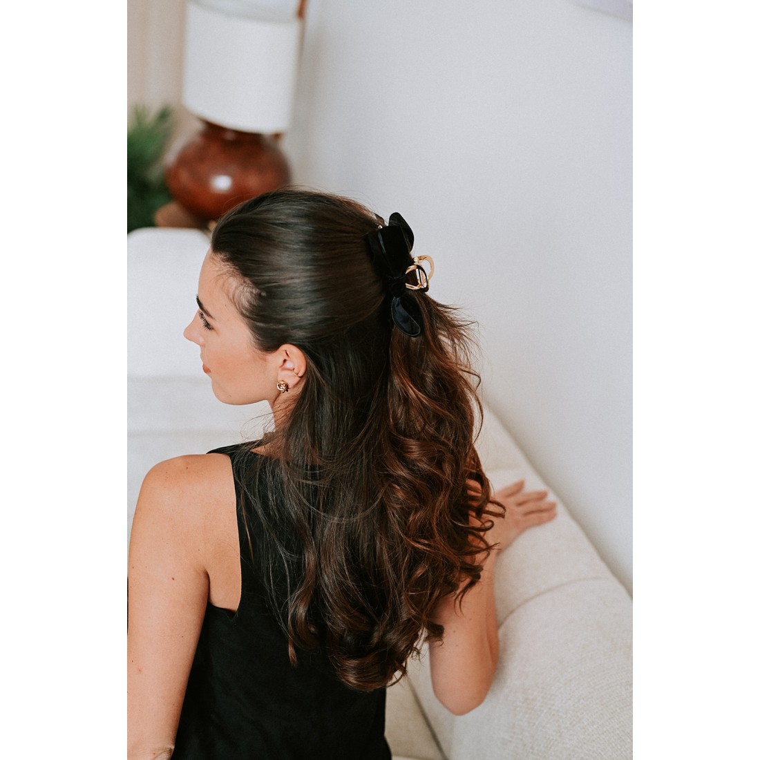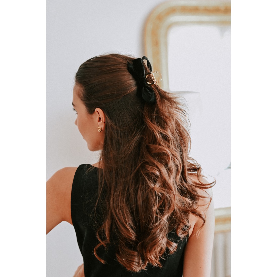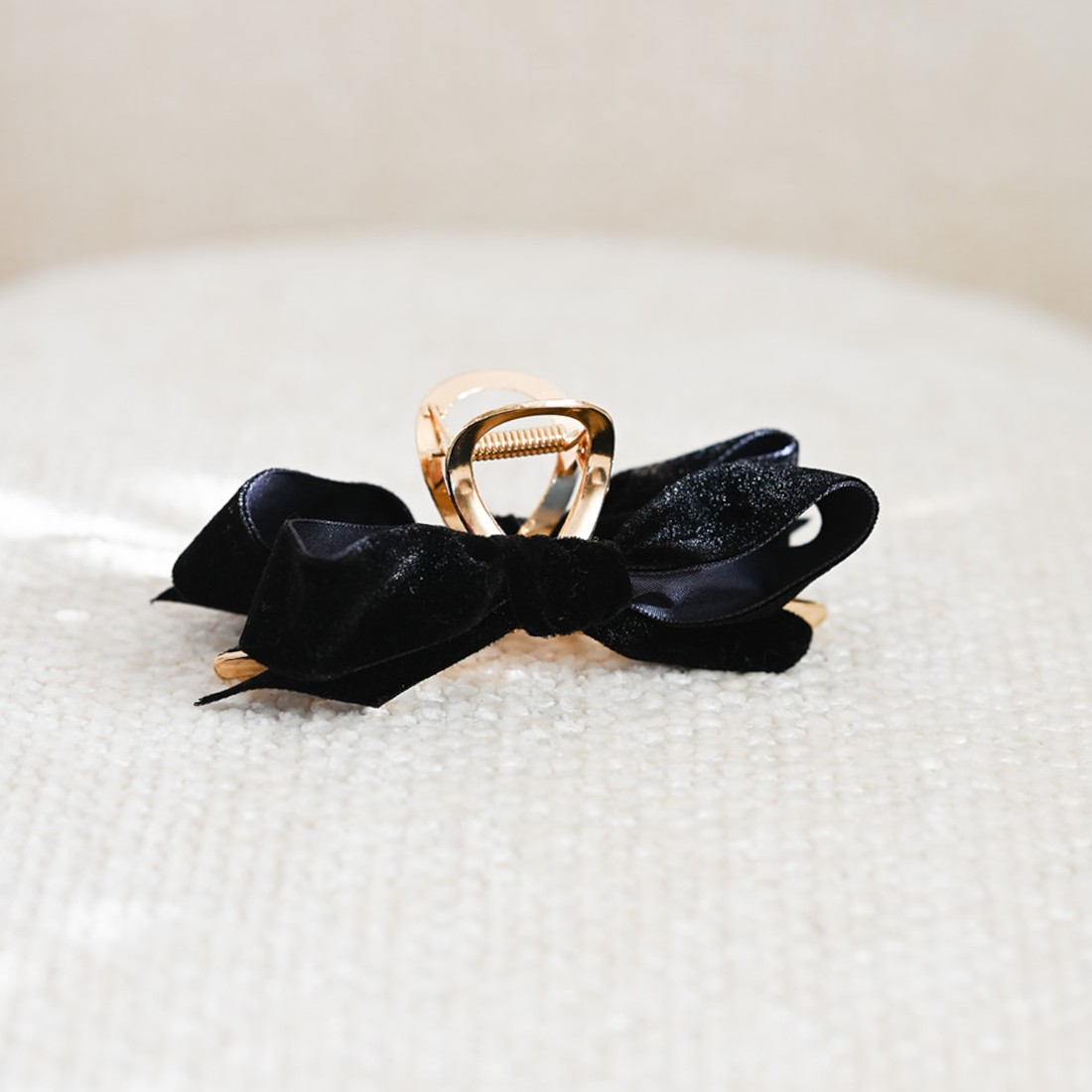 Jolie barrette dorée en acier inoxydable garnie de noeuds en velours noir.