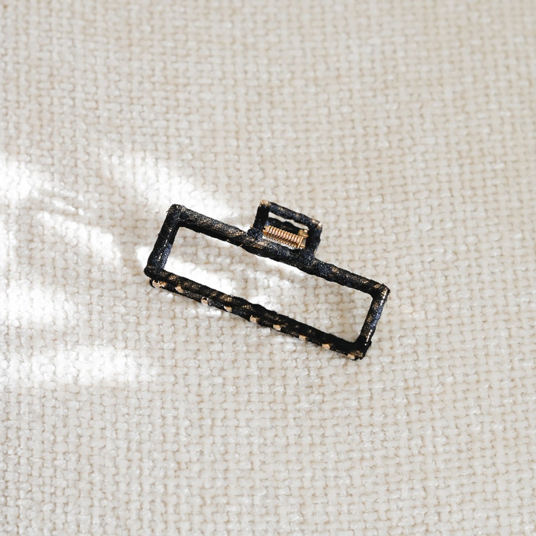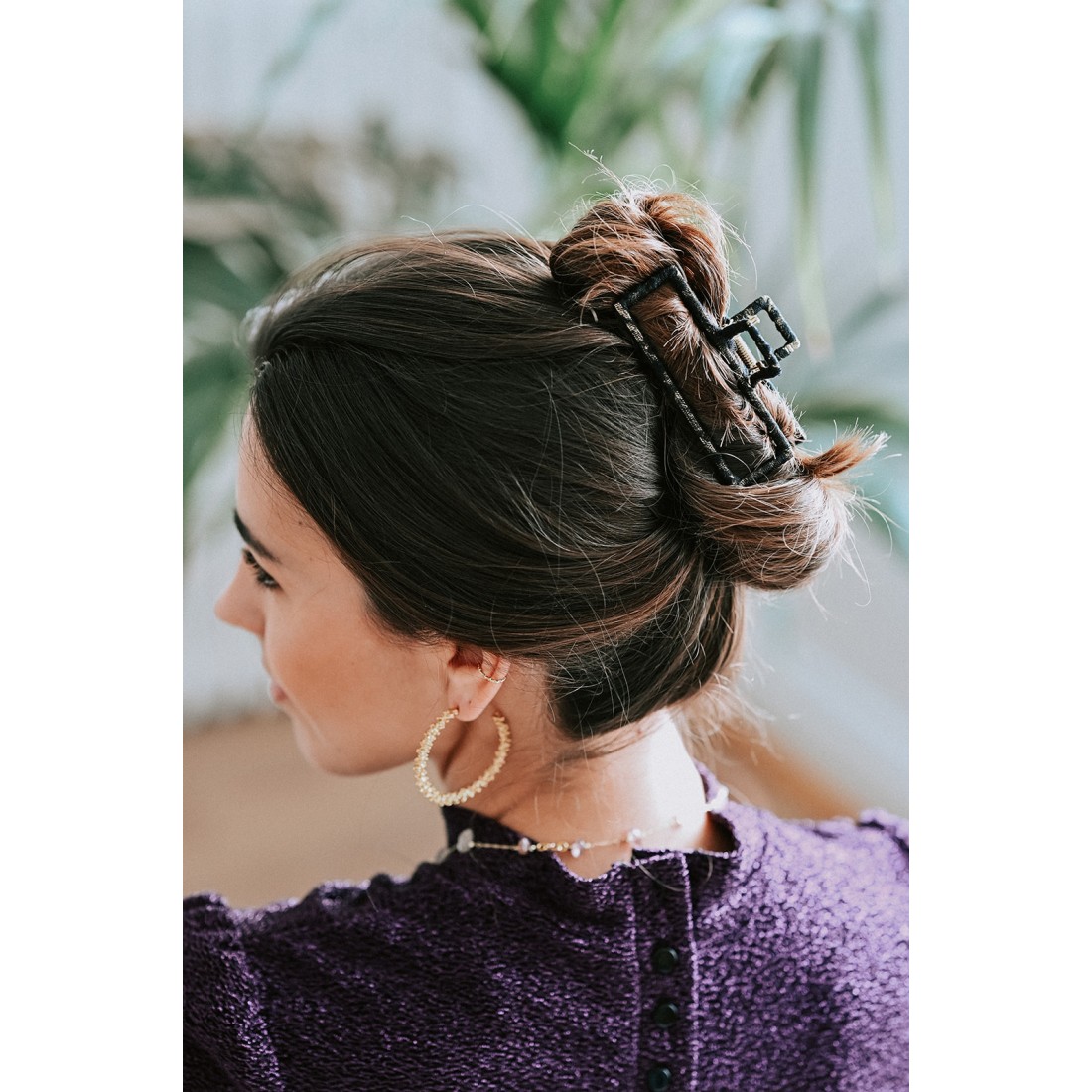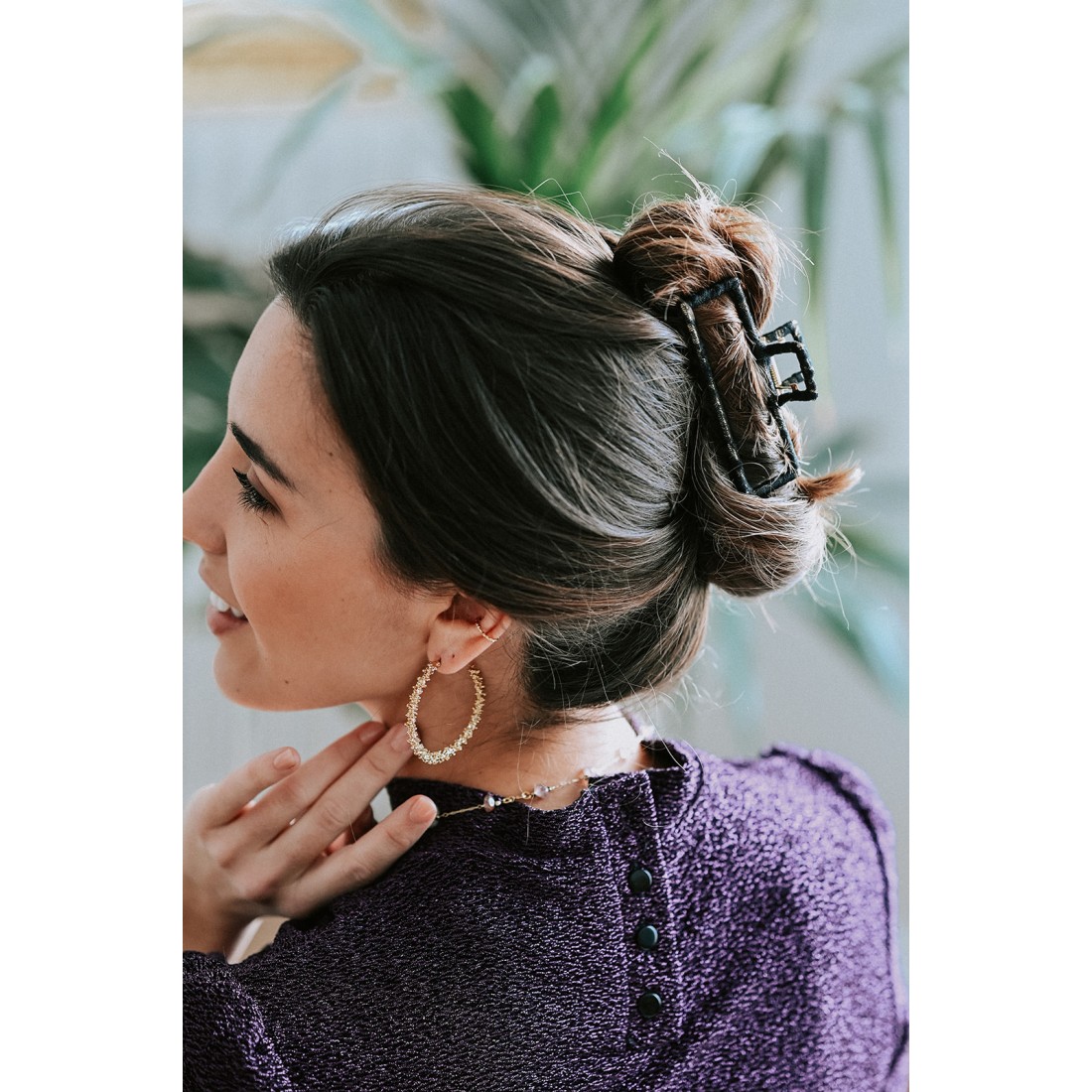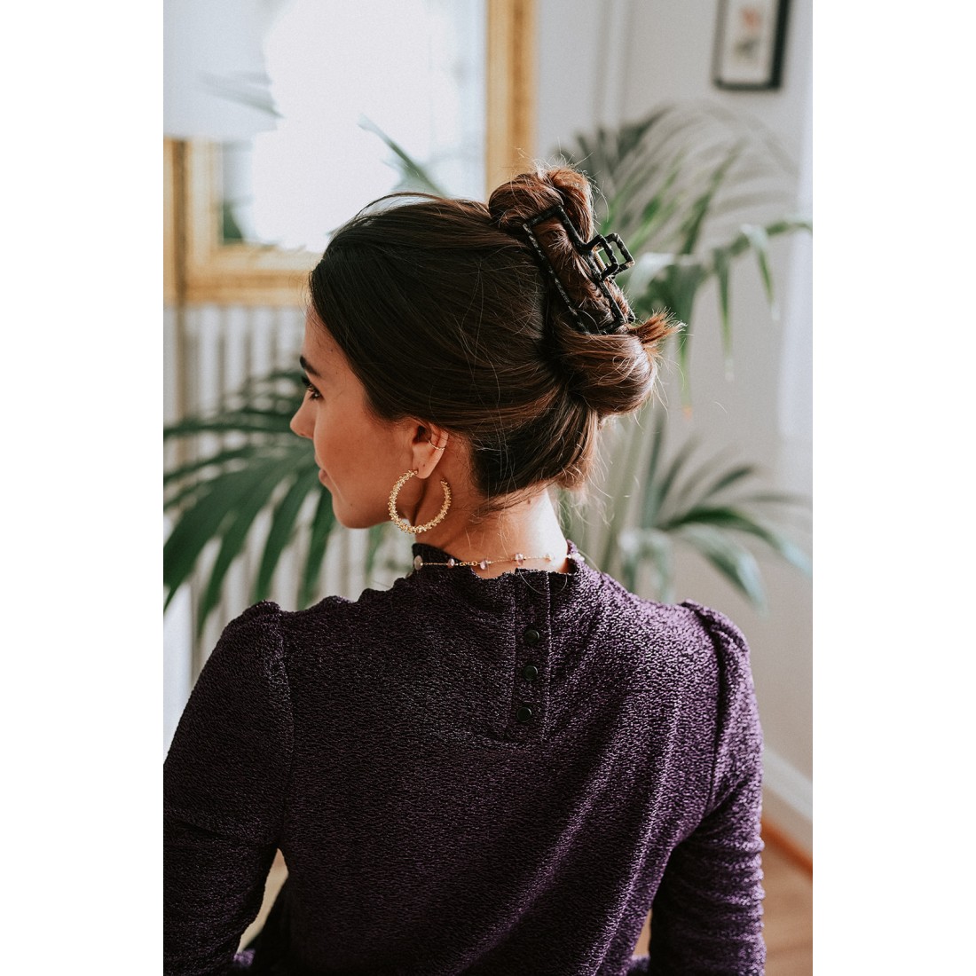 Barrette dorée en acier inoxydable entourée d'un tulle en plumetis noir.