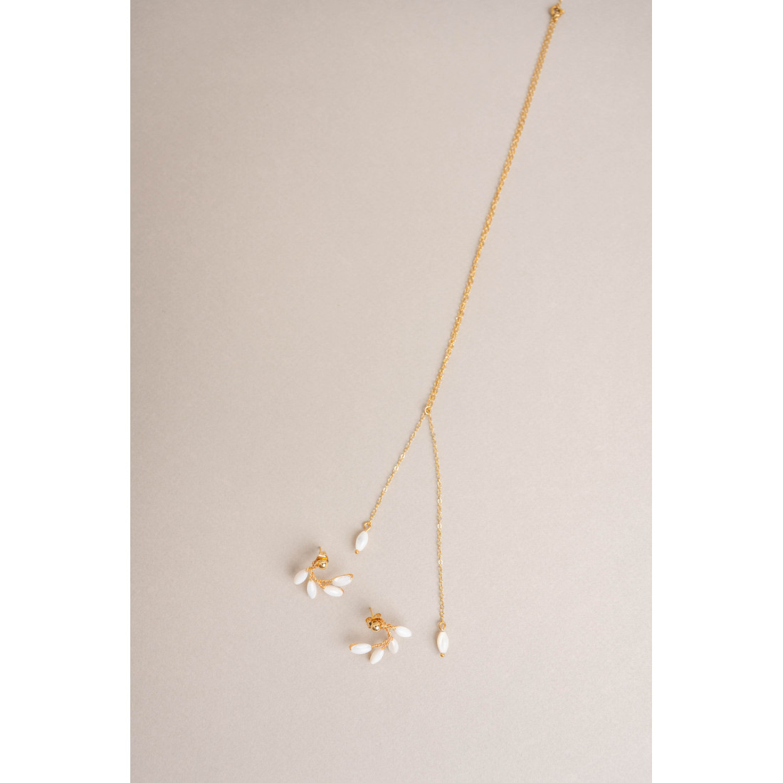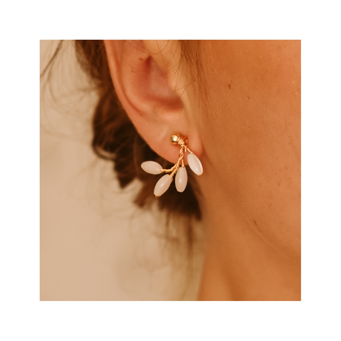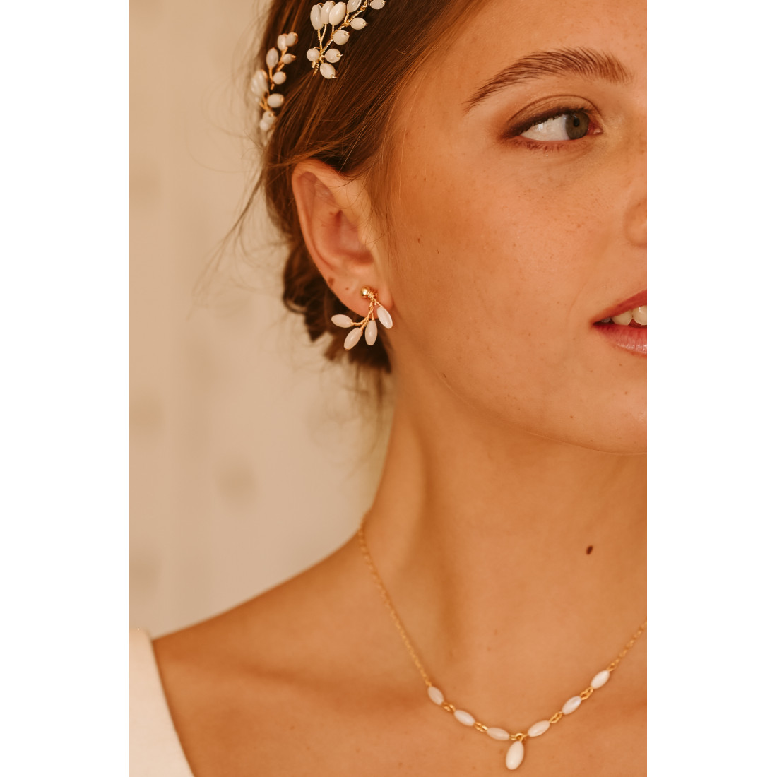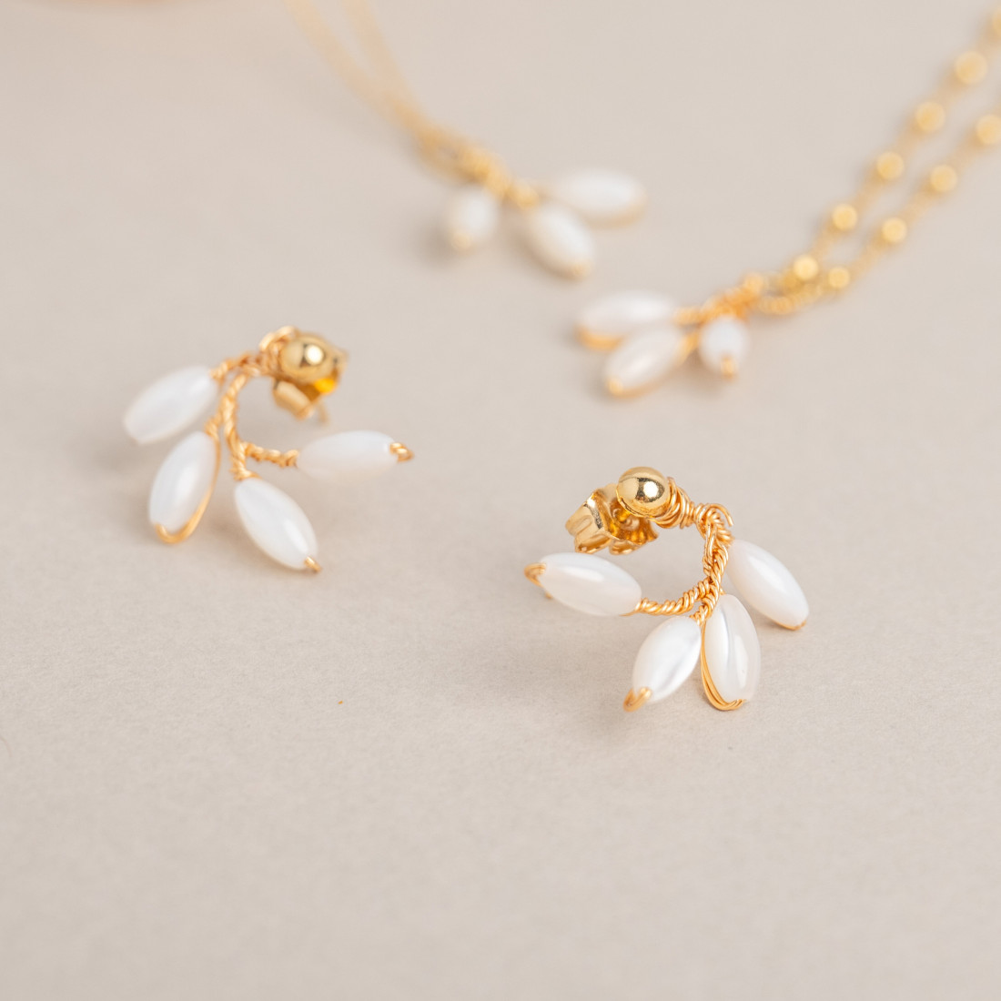 - Design organique : des perles de nacre disposées en épis, rappelant la délicatesse d'un feuillage printanier.