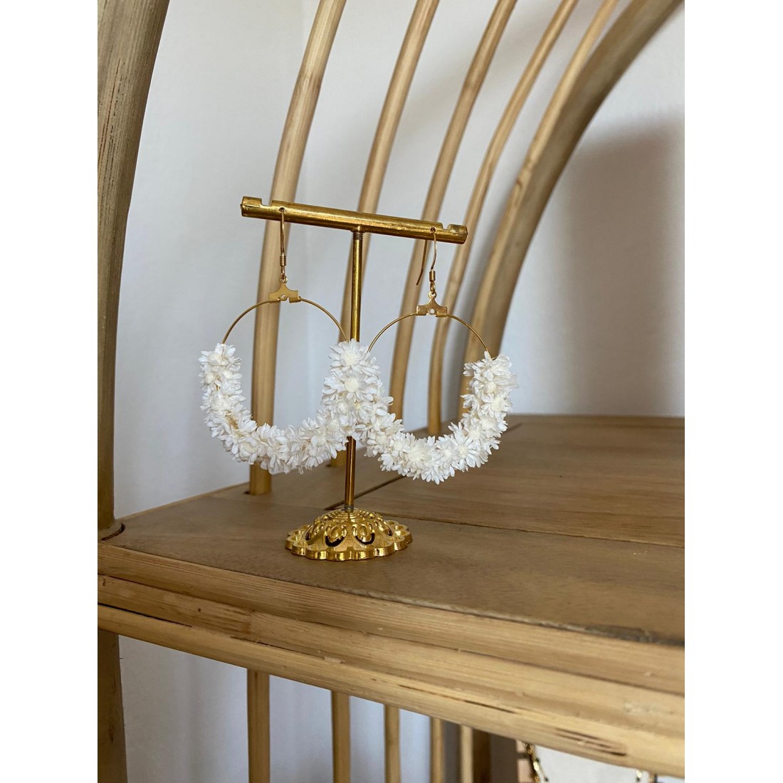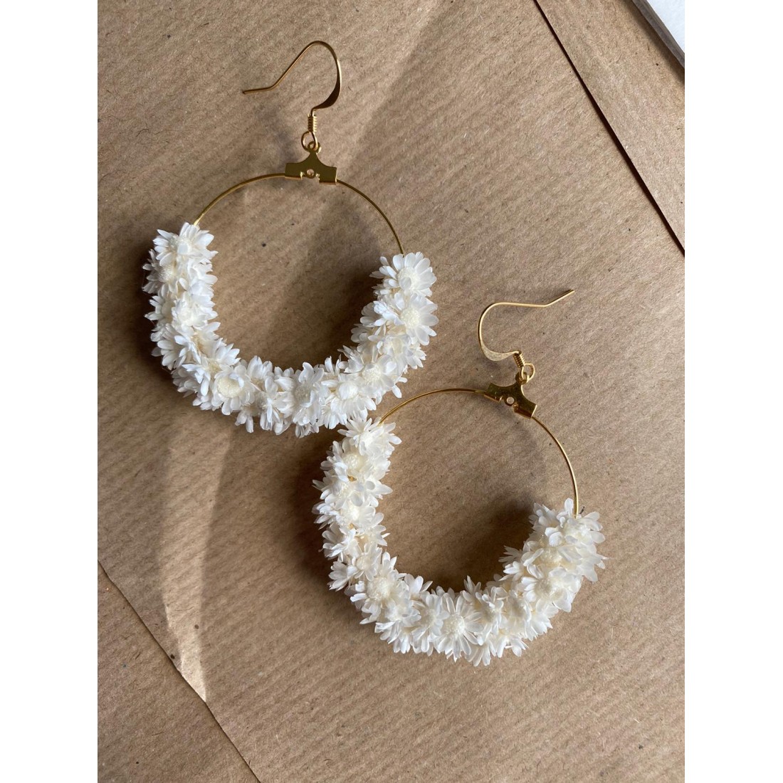 Jolies créoles ornées de mini fleurs de glixia séchées et teintes. Coloris au choix : blanc, crème, rose pâle, bleu ciel, noir, rouge, violet, fuschia, terracotta, bleu électrique, jaune, bleu orage.