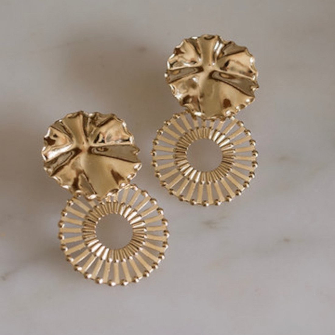 On craque pour ces jolies boucles d’oreilles pendantes dorées à l'or fin. Ces boucles d'oreilles dorées ornées de deux cercles délicatement travaillés sont entièrement made in France