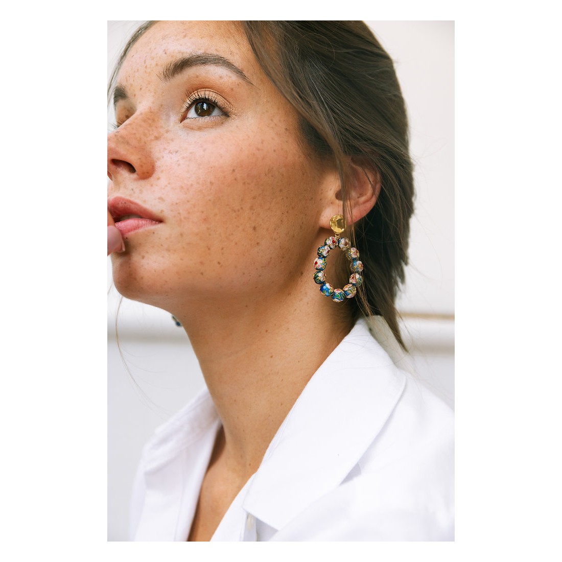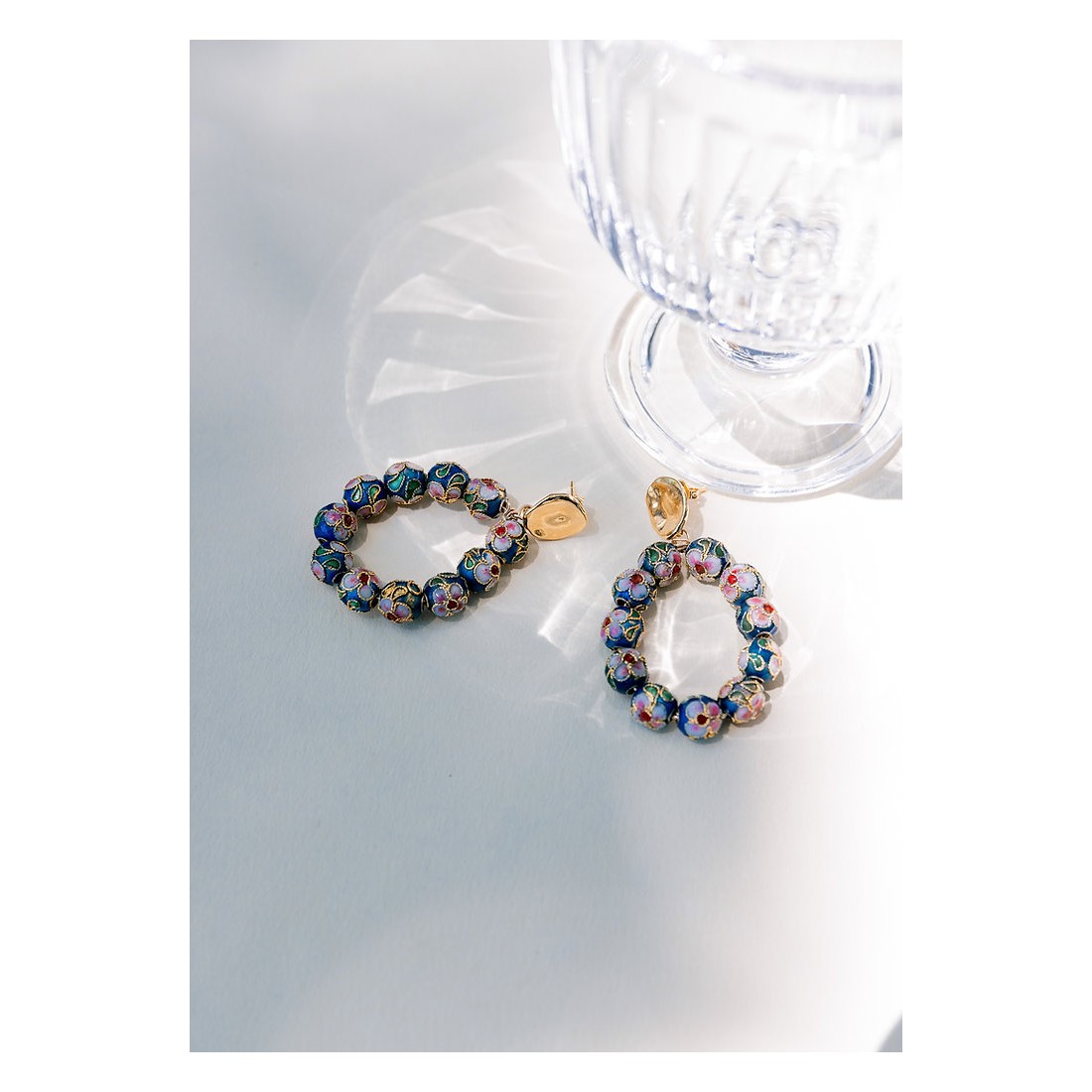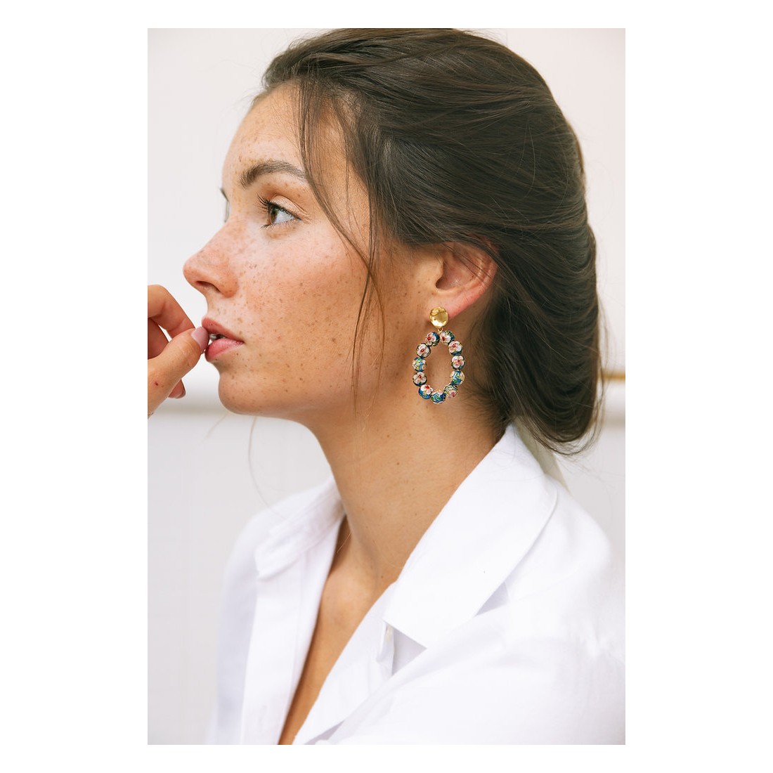 Boucles d'oreilles plaquées or 3 microns agrémentées de perles au détails fleuris. Ces jolies boucles d'oreilles sont entièrement confectionnées à la main, dans l'atelier Nantais de notre créatrice.