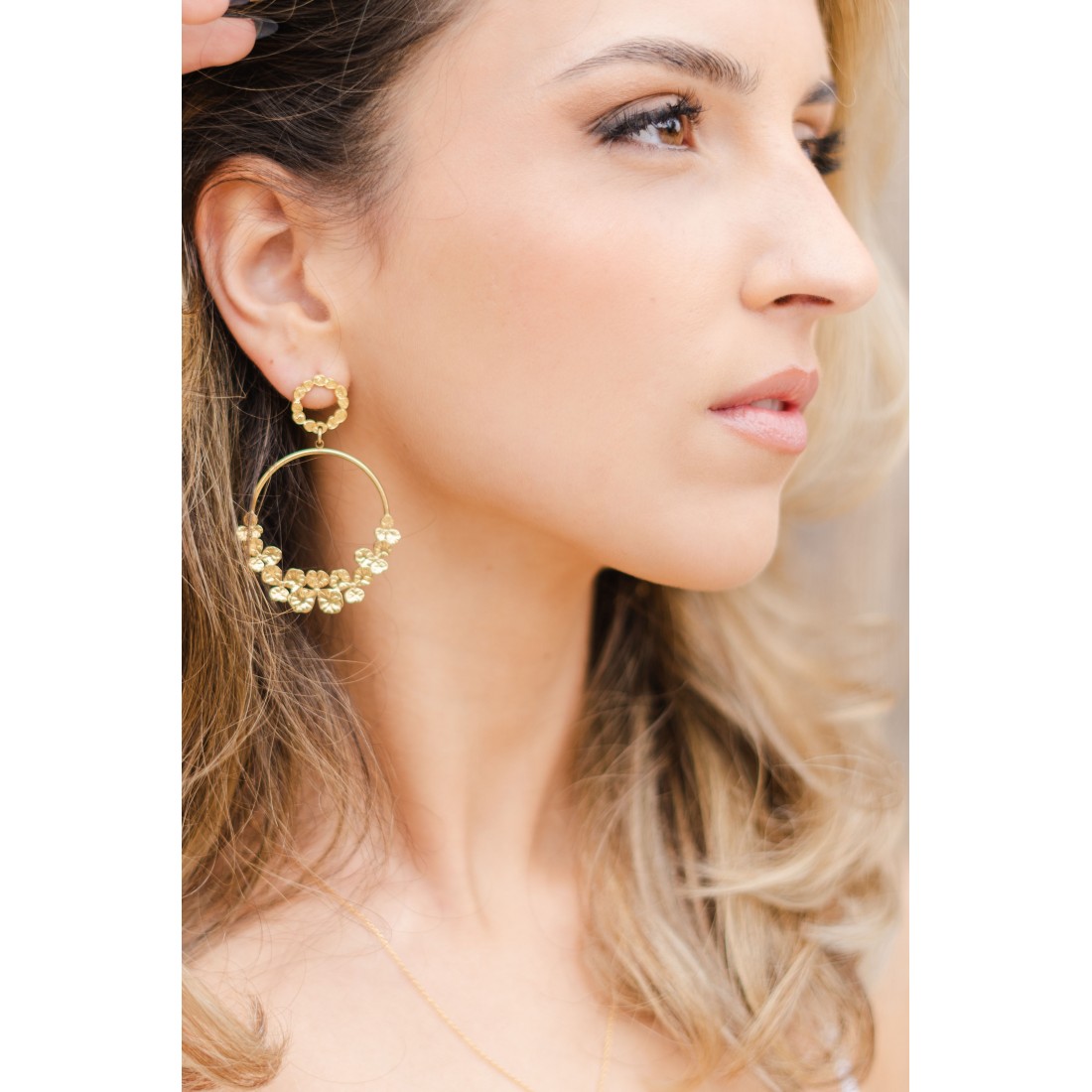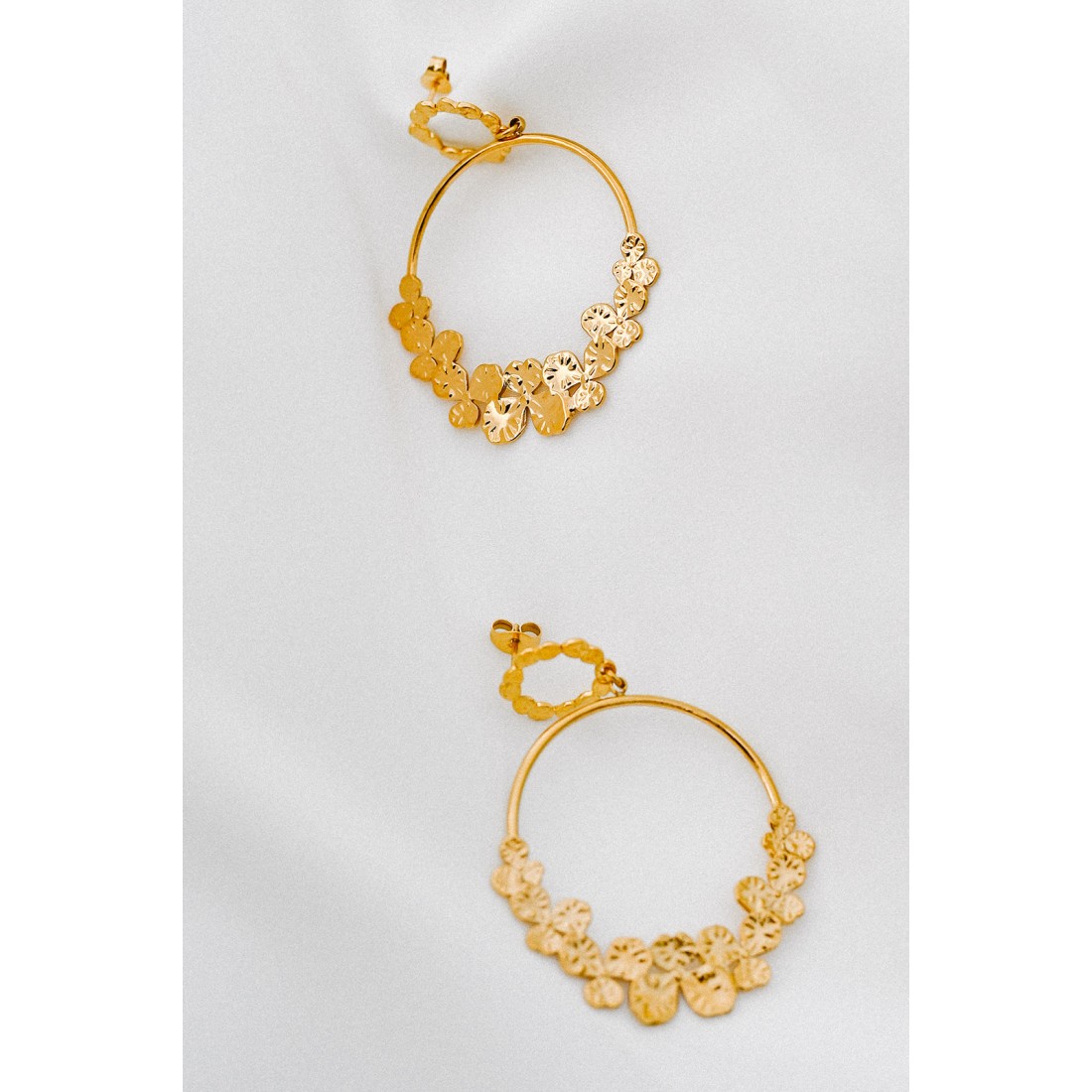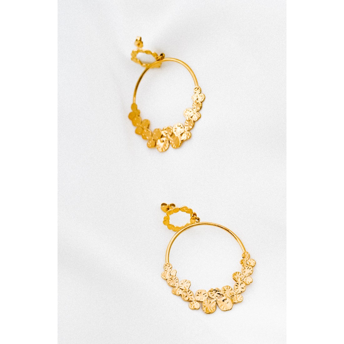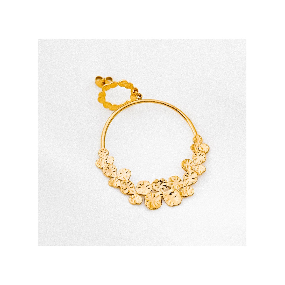 Oh les boucles coup de coeur ! Un joli clou d'oreille martelé & une fine créole habillée d'une cascade de pensées... Ces boucles d'oreilles dorées sont faites pour vous !
