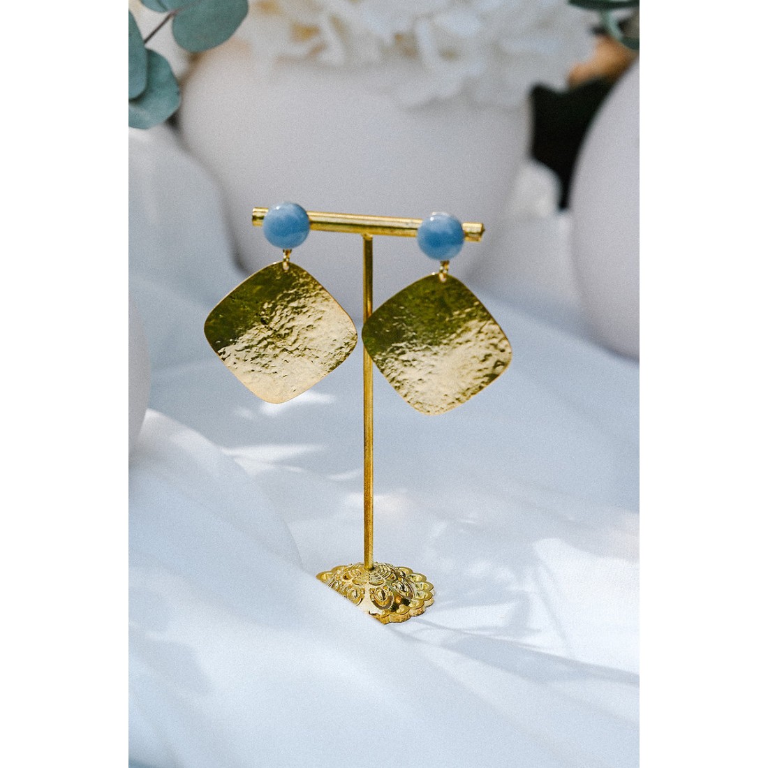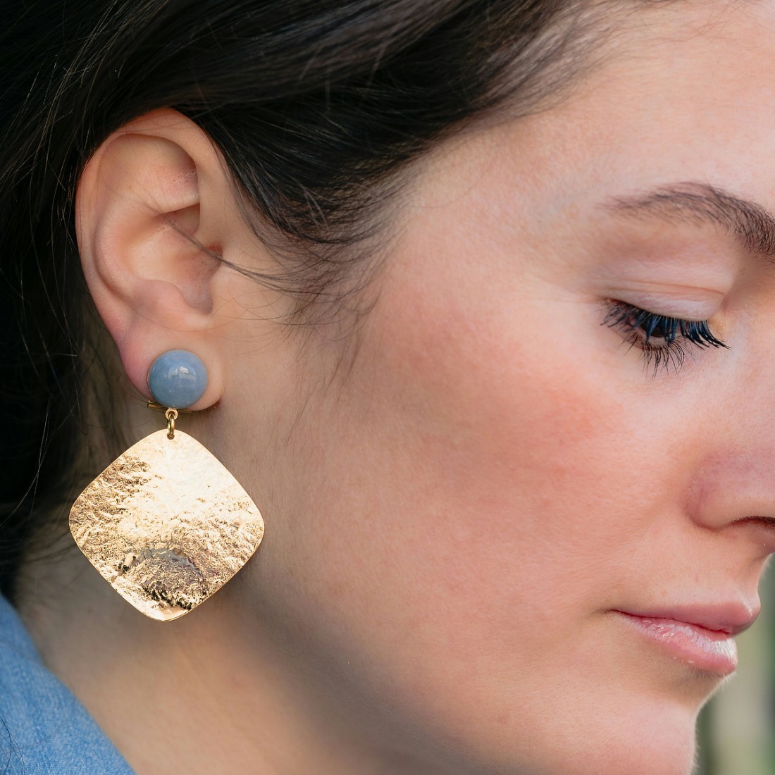 Boucles d'oreilles légèrement martelées dorées à l'or 24 carats, et ornées d'un cabochon pierre fine bleue (Angélite).
