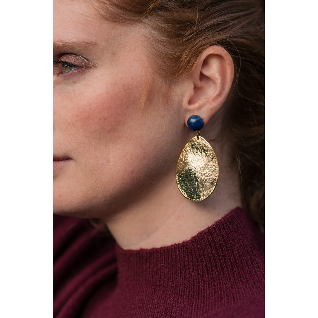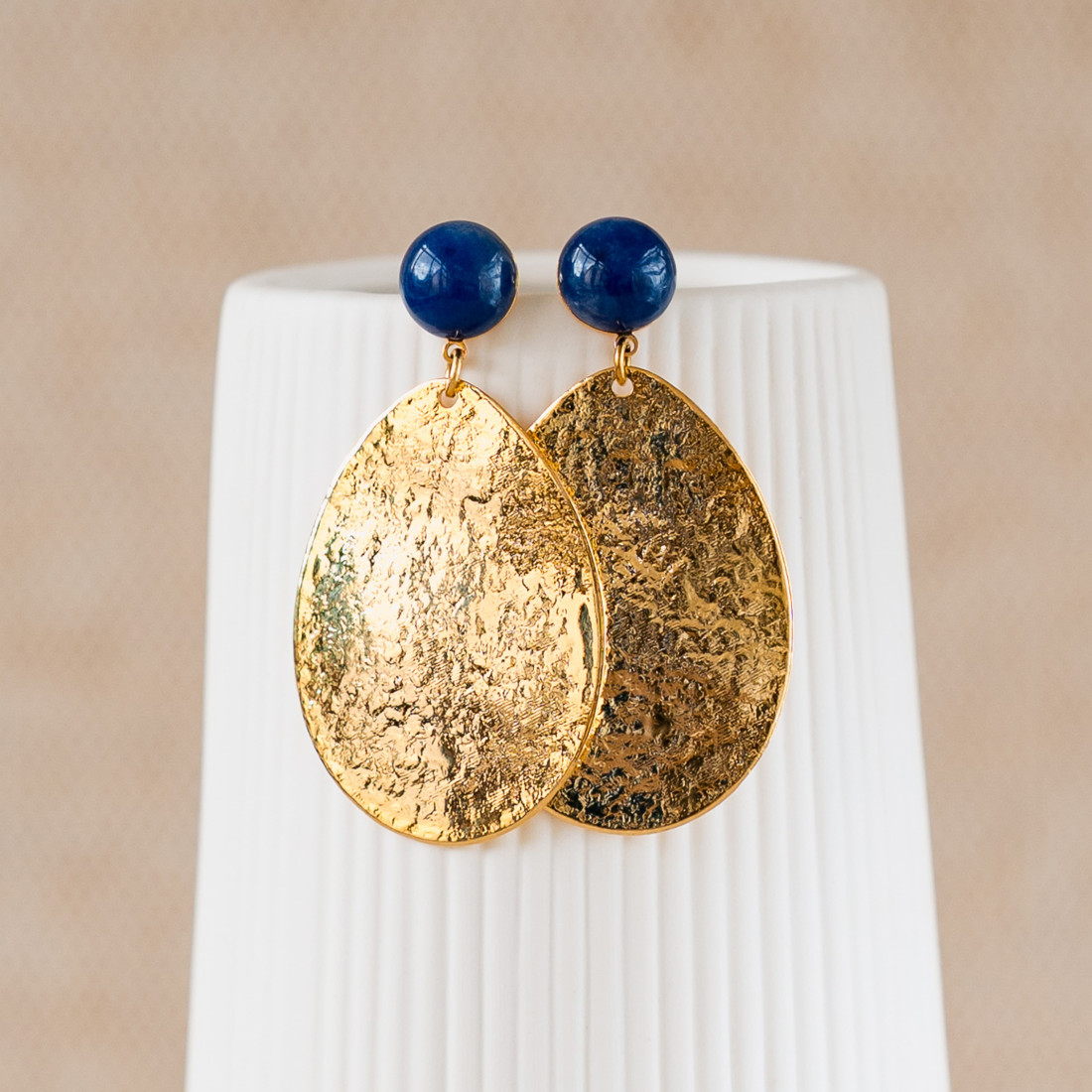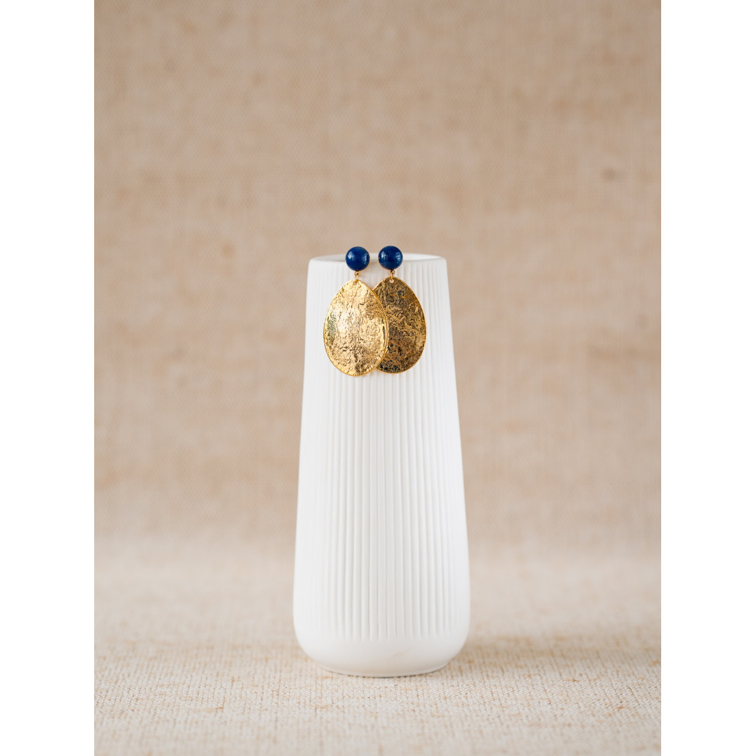 Comment résister au charme des boucles d'oreilles Marine : une sublime suspension martelée dorée à l'or 24 carats, surmontée d'un clou d'oreille orné d'un cabochon de sodalite bleue.