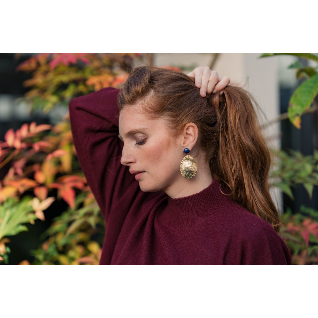 Ces boucles d'oreilles dorées, volumineuses mais très légères, s'adressent aux femmes en quête d'un bijou de caractère, qui sublime le port de tête et capte toute la lumière alentour.