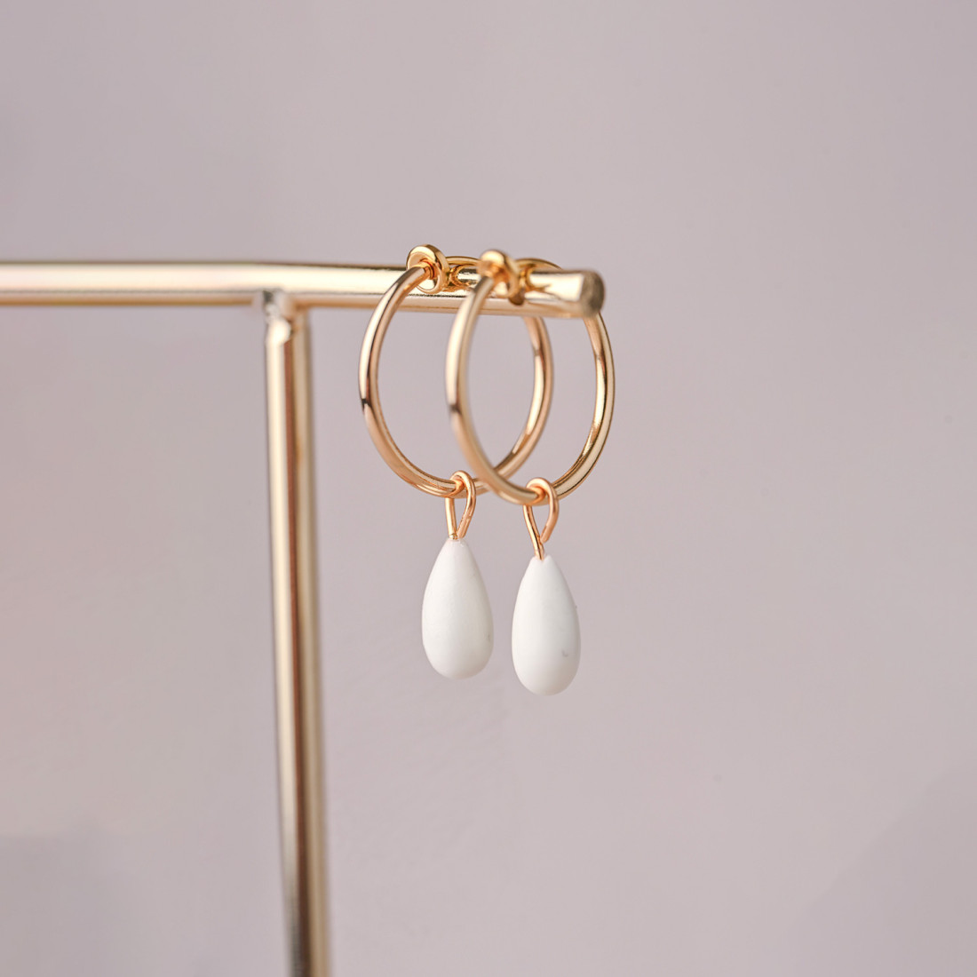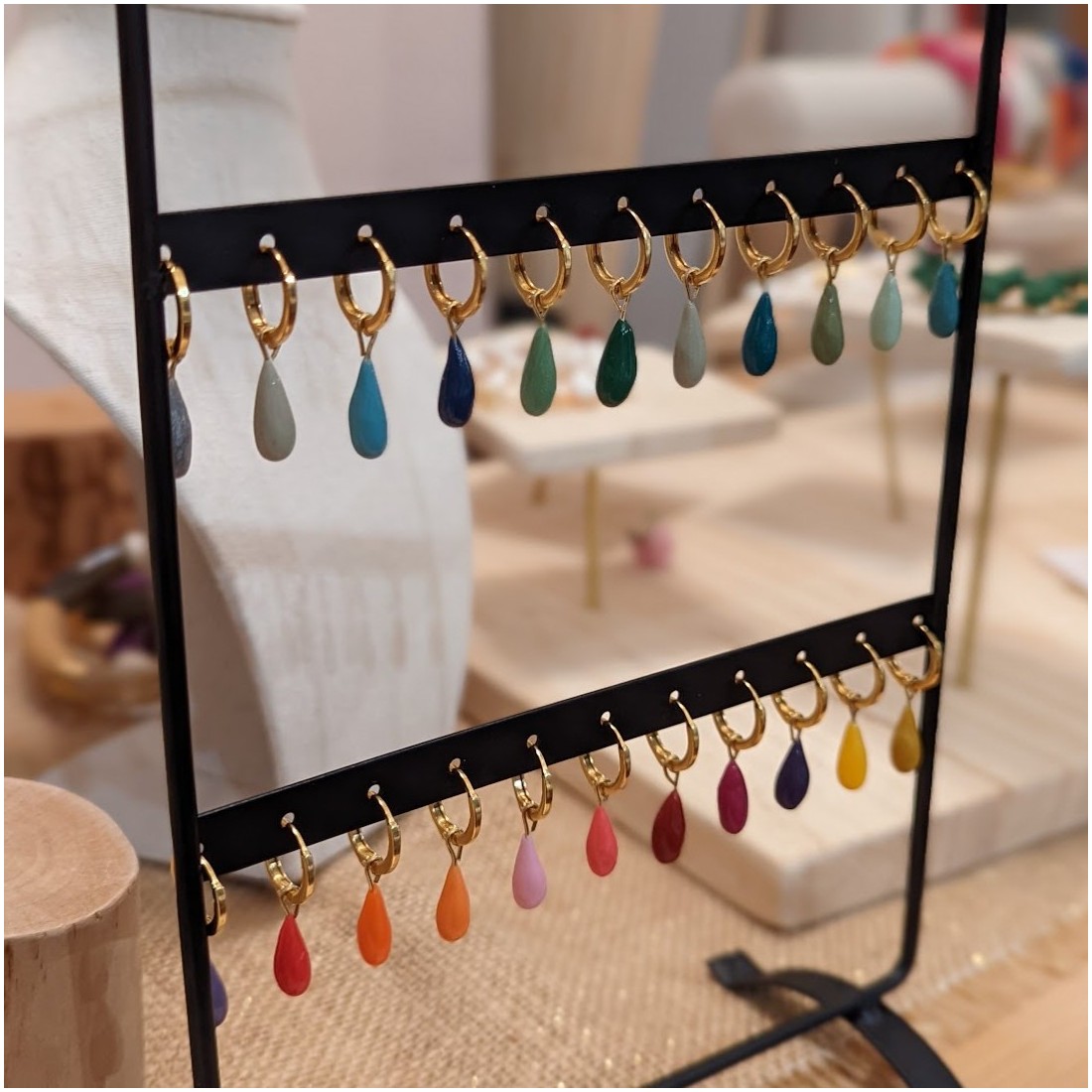 Gros coup de coeur pour ces créoles dorées à l'or fin sur clips et leurs gouttes colorées en porcelaine froide, interchangeables ! Créoles sur poussoir idéales pour les oreilles non percées.