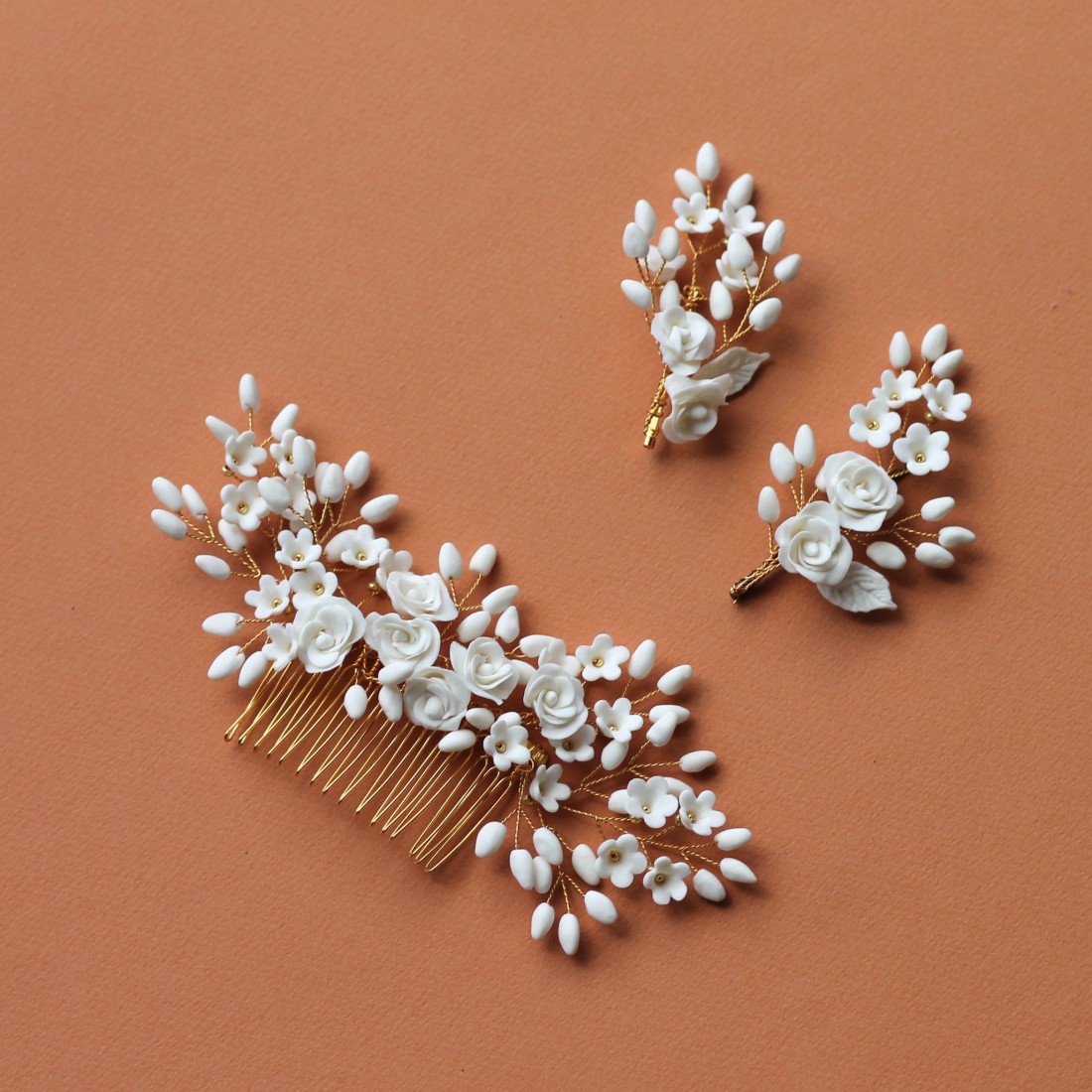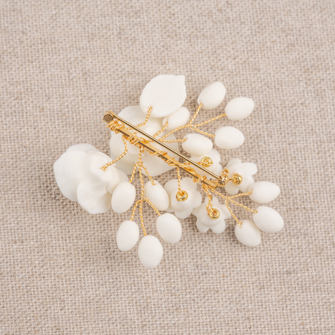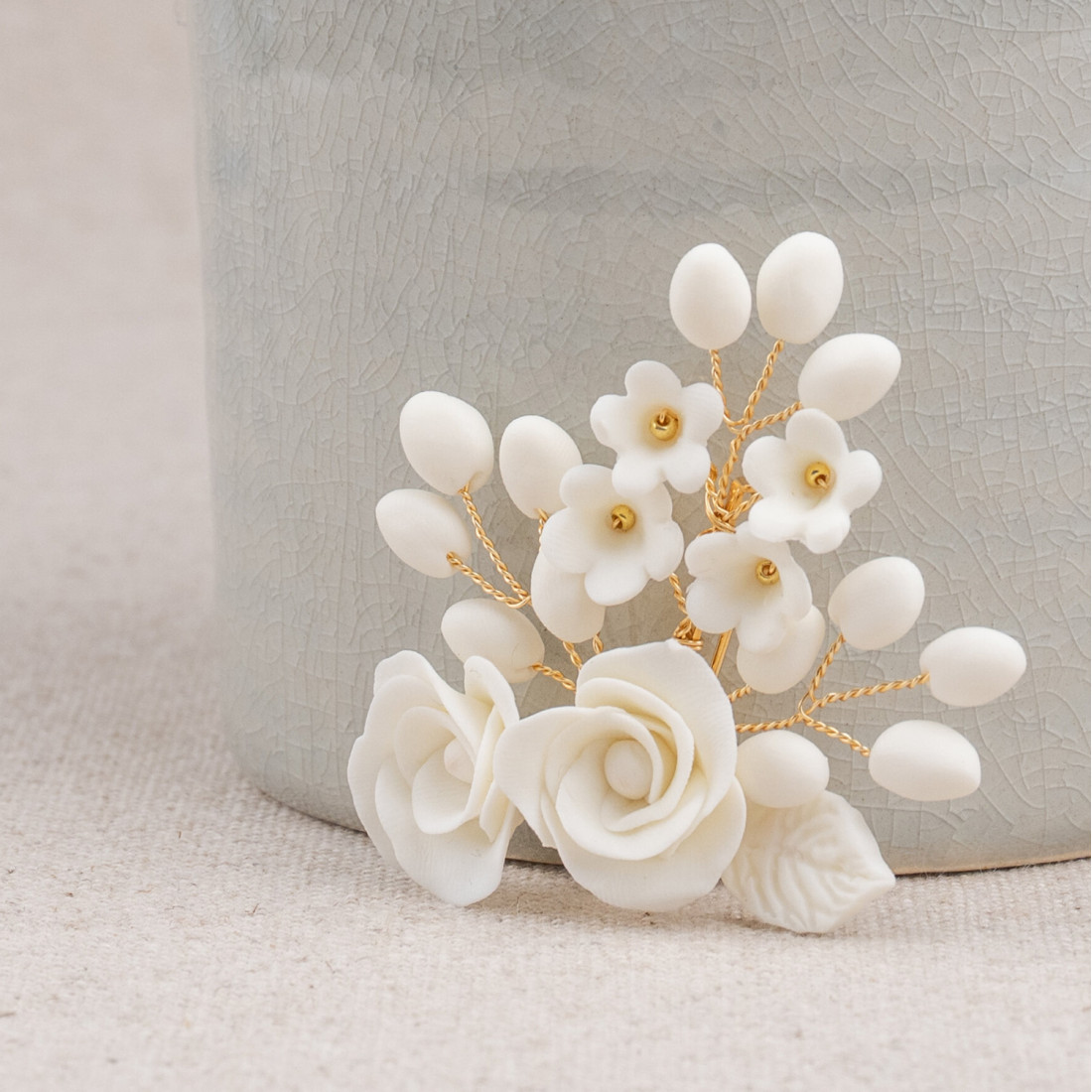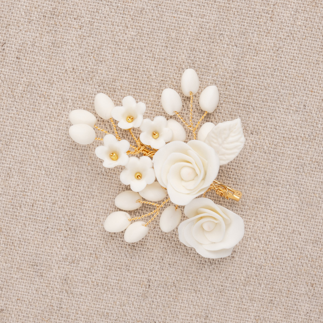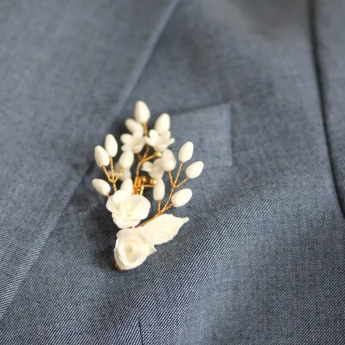 Boutonnière/broche ornée de fleurs, roses et bourgeons en porcelaine froide, entièrement façonnés à la main. Une création signée Les Perles de la Bastide - Coraly T Bijoux.