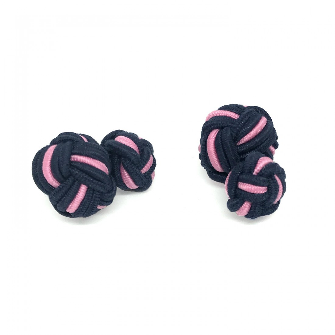 Boutons de manchette tressés en passementerie bleu marine et rose, forme originale pour ces boutons de manchette double emploi, à porter dans les deux sens