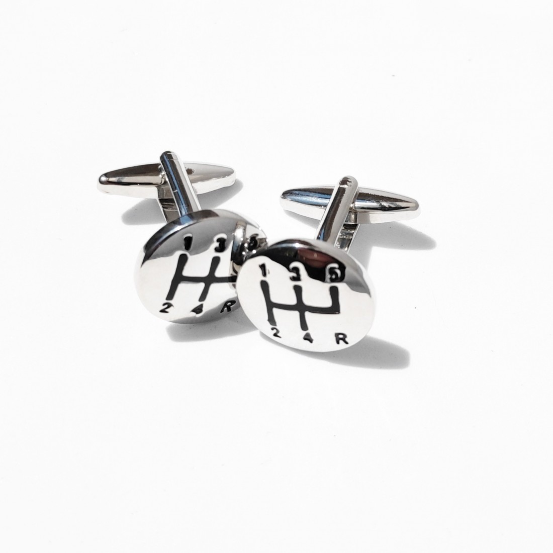 Boutons de manchette argentés, orné d'un levier de vitesse. Cadeau idéal pour les as de la route !