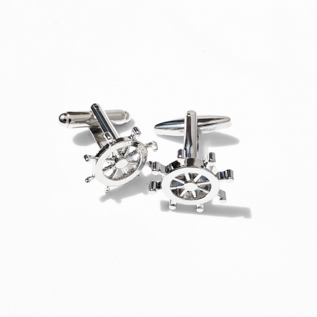 Boutons de manchette esprit marin en metal argenté, orné d'une barre à roue. Cadeau idéal pour les amoureux du grand large !