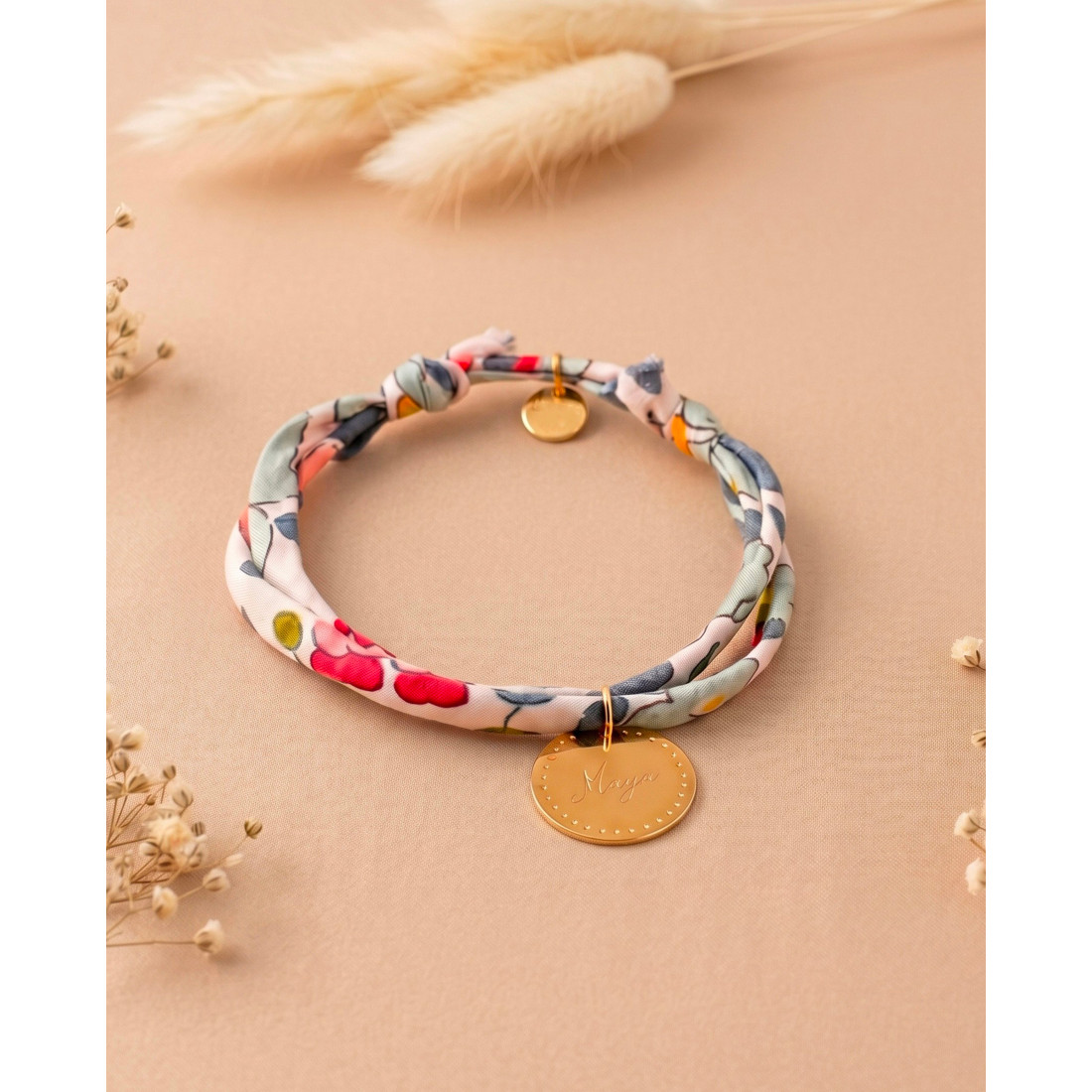 Ce bracelet est bien plus qu’un accessoire : c’est un bijou personnalisée, conçu pour durer. Le plaqué or 3 microns garantit une excellente tenue dans le temps, sans ternir. Le tissu liberty, quant à lui, apporte une touche bohème et romantique qui plaît à toutes les générations.