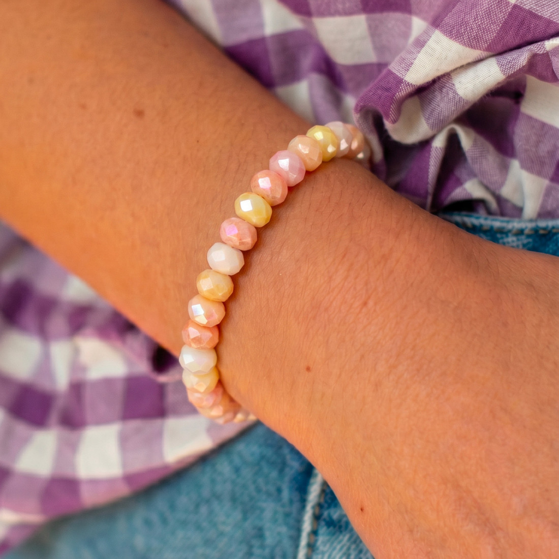 Dispo en 2 tailles, ce bracelet élastiqué est composé de magnifiques perles de verre aux teintes pastel dans un camaïeu de tons jaune et orange, qui rappellent les colliers de bonbons de notre enfance, pour un look pétillant et régressif.