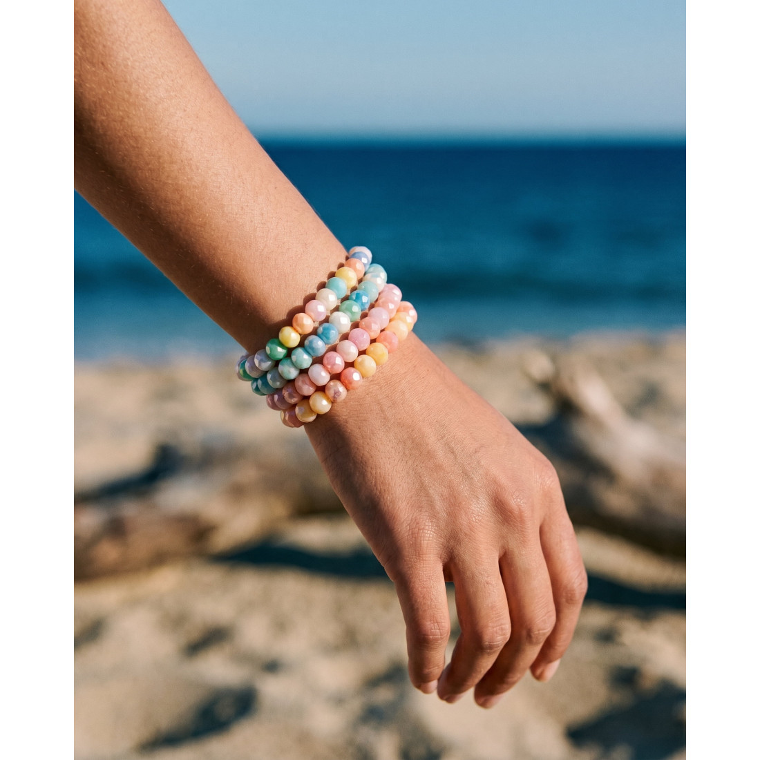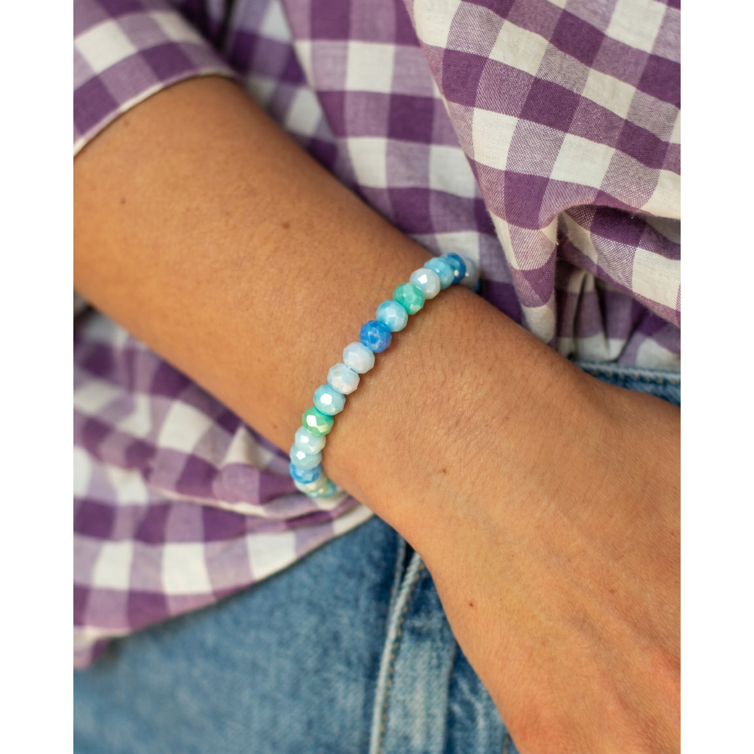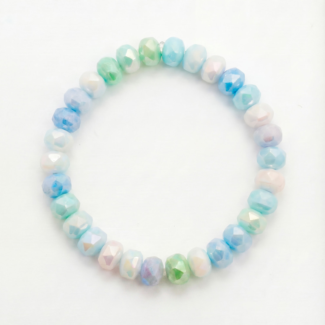 Dispo en 2 tailles, ce bracelet élastiqué est composé de magnifiques perles de verre aux teintes pastel dans un camaïeu de tons bleu et vert, qui rappellent les colliers de bonbons de notre enfance, pour un look pétillant et régressif.