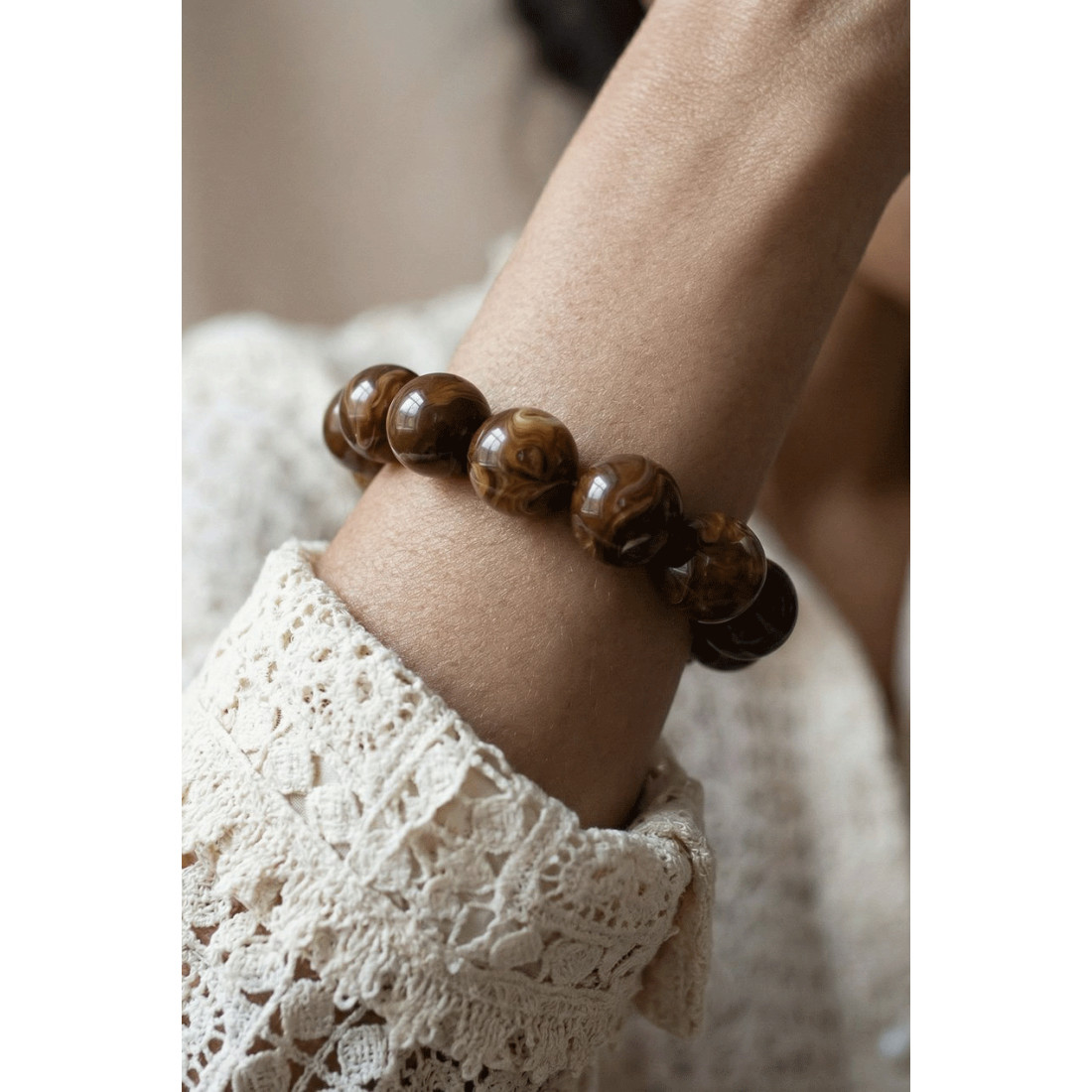 Ce bracelet en perles XXL joue sur des proportions généreuses pour créer un effet visuel immédiat. Les perles de 16 mm apportent du relief et donnent du caractère à l’ensemble, sans nécessiter d’autres accessoires.