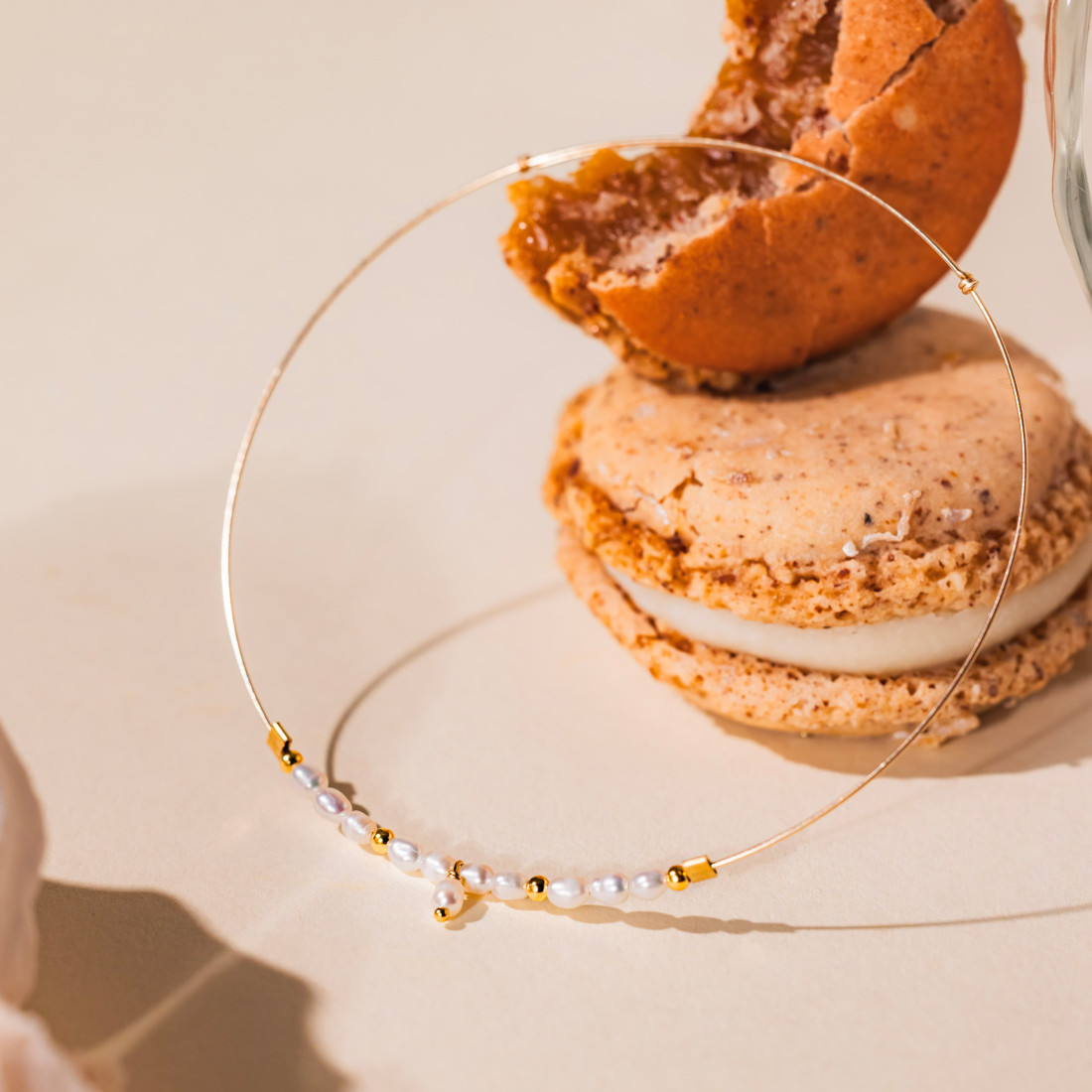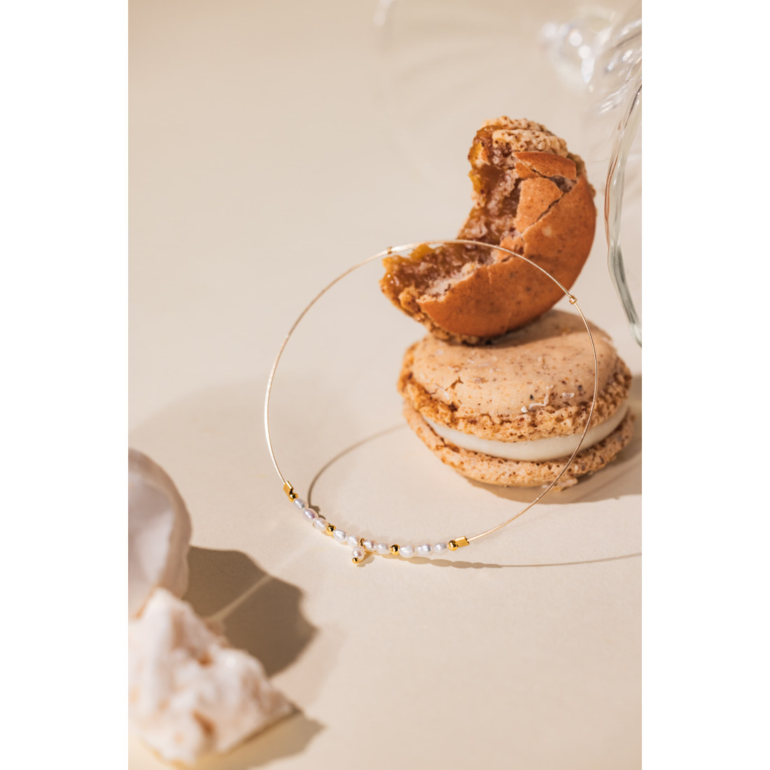 Un jonc élégant, ponctué de perles d’eau douce et perles dorées, imaginé pour apporter un léger mouvement scintillant à votre poignet, que vous le portiez seul ou combiné à d’autres bracelets.