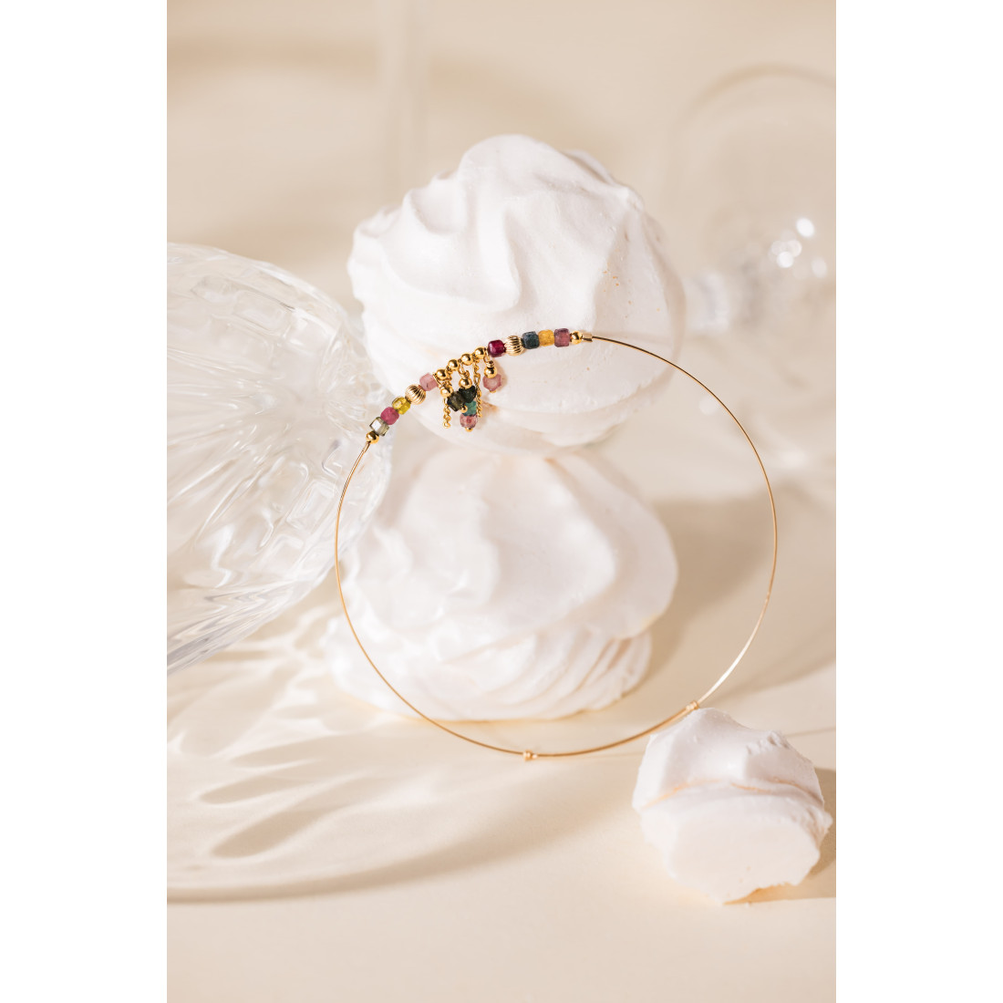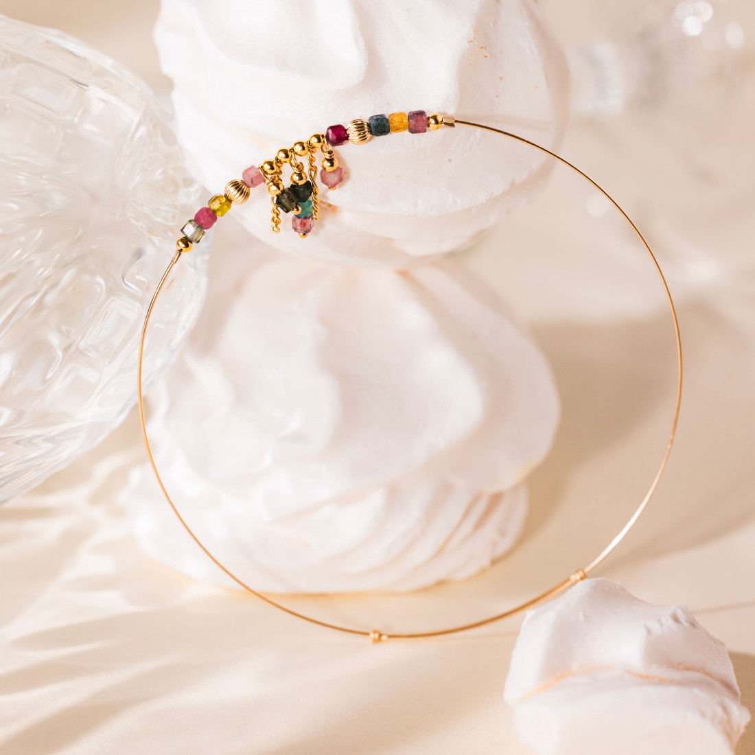 Un jonc délicat, ponctué de tourmalines multicolores et de fines pampilles dorées, imaginé pour apporter un mouvement scintillant à votre poignet, que vous le portiez seul ou combiné à d’autres bracelets.