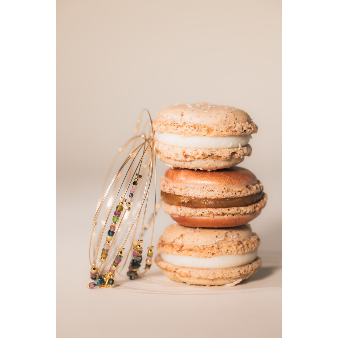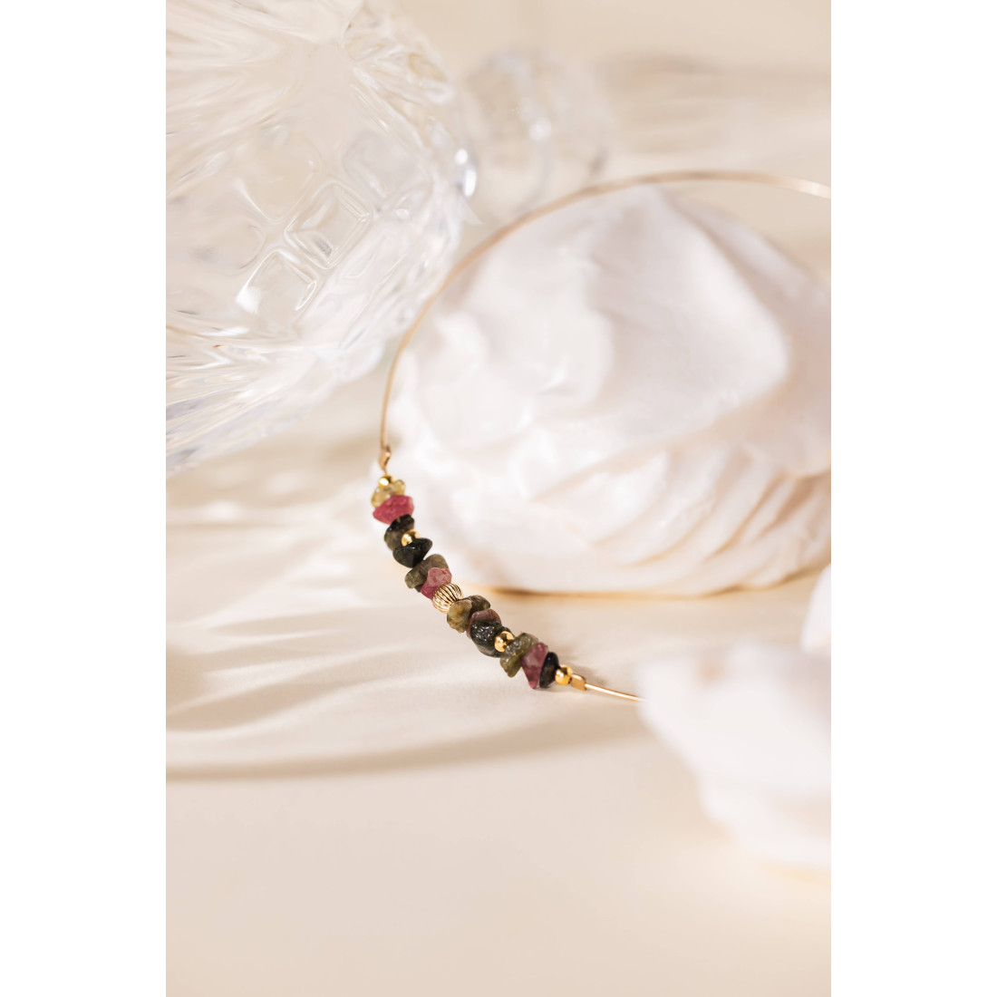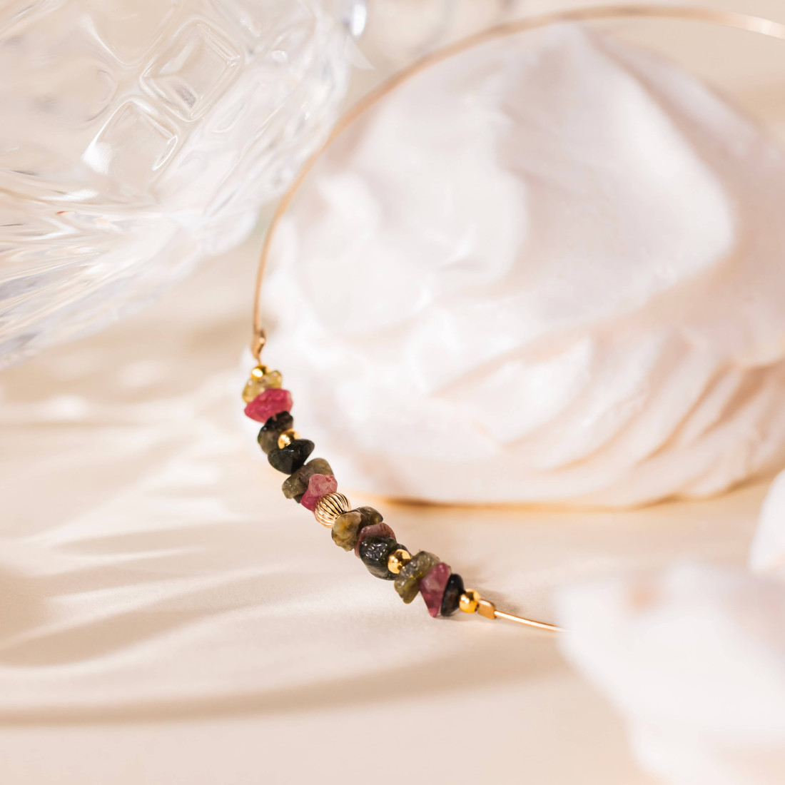 Un jonc élégant, ponctué de tourmalines multicolores et de fines pampilles dorées, imaginé pour apporter un mouvement scintillant à votre poignet, que vous le portiez seul ou combiné à d’autres bracelets.