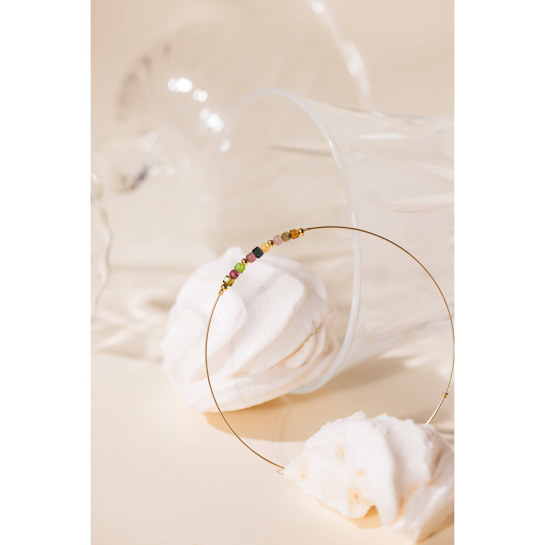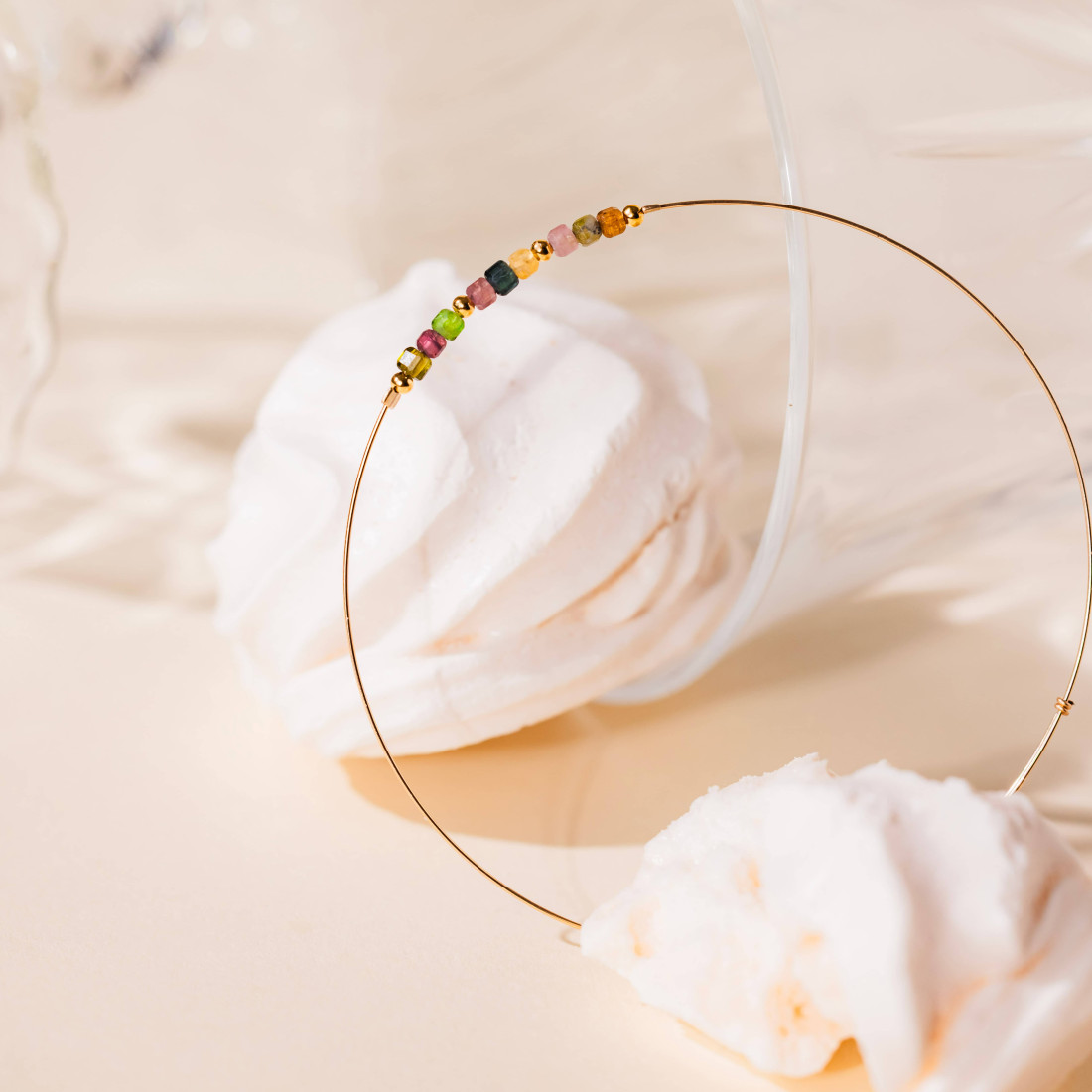 Un jonc élégant, ponctué de tourmalines multicolores et de fines perles dorées, imaginé pour apporter un mouvement scintillant à votre poignet, que vous le portiez seul ou combiné à d’autres bracelets.