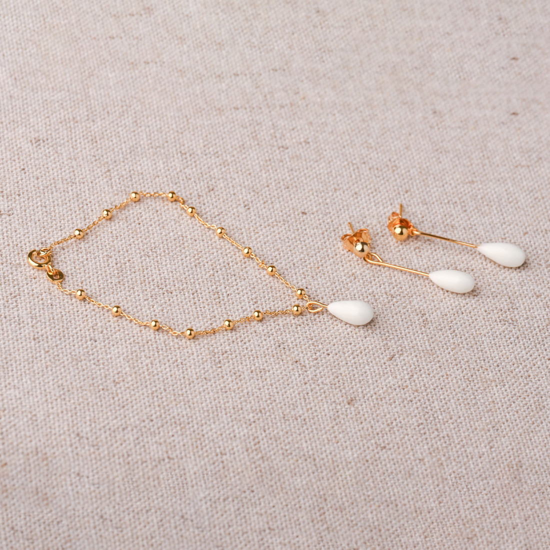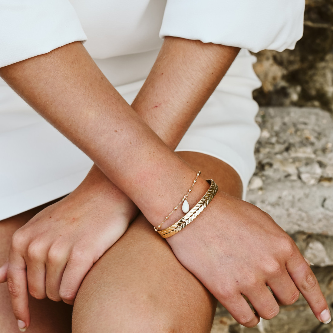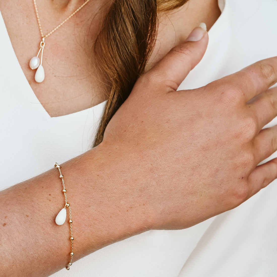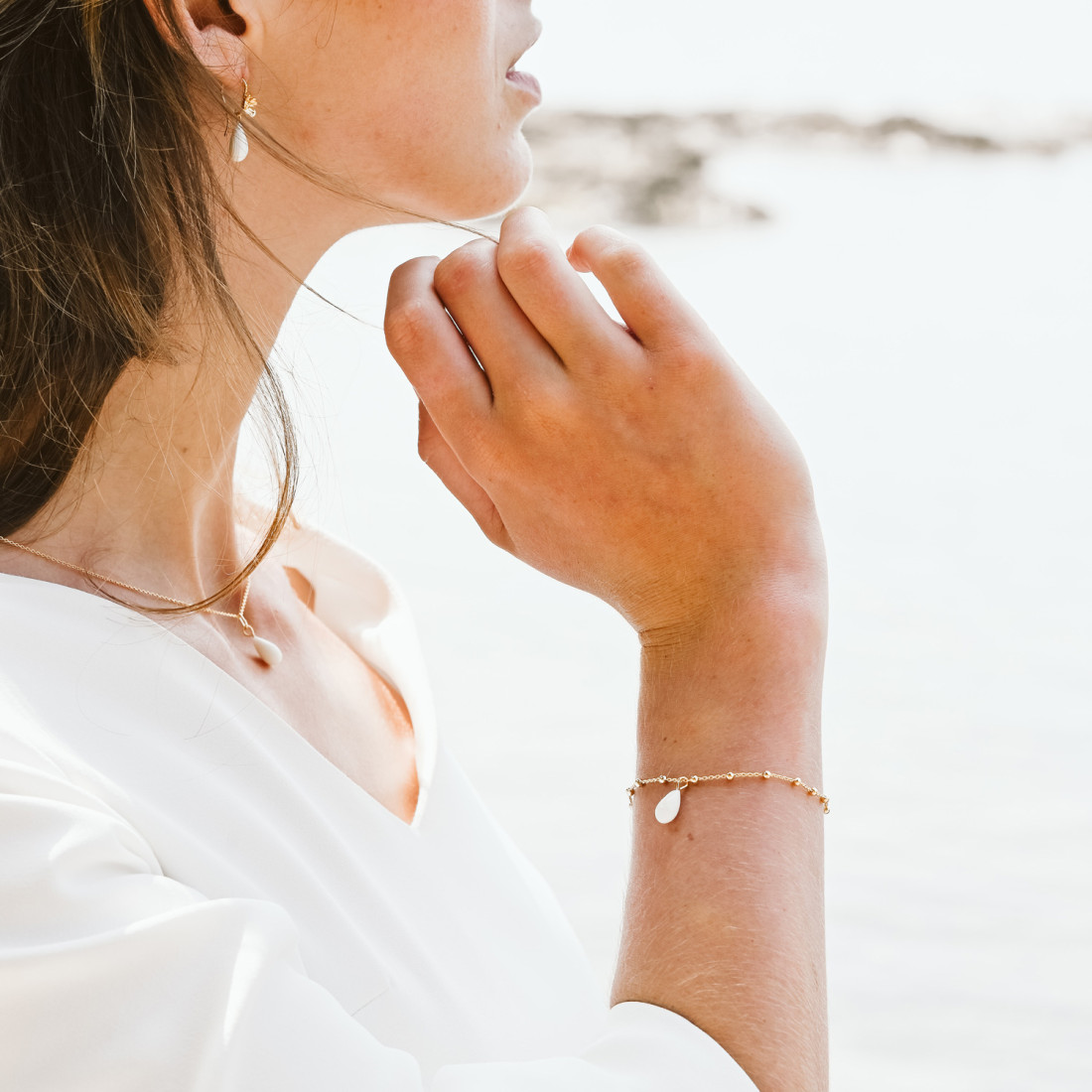 Joli bracelet chaîne boule plaqué or ou argent orné d'un bourgeon en porcelaine froide, entièrement façonnés à la main, et d'une perle d'eau douce. Une création signée Les Perles de la Bastide - Coraly T Bijoux.