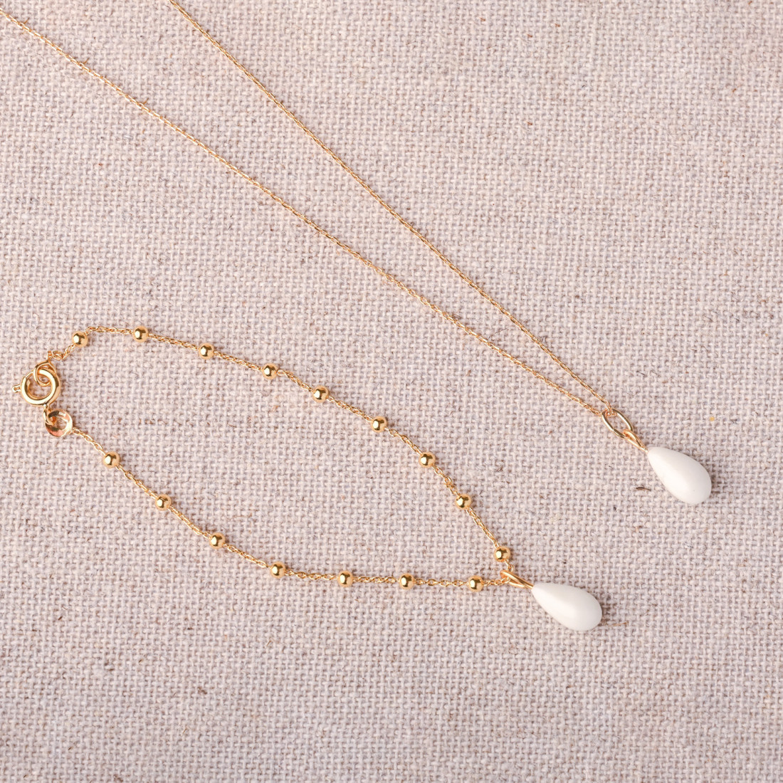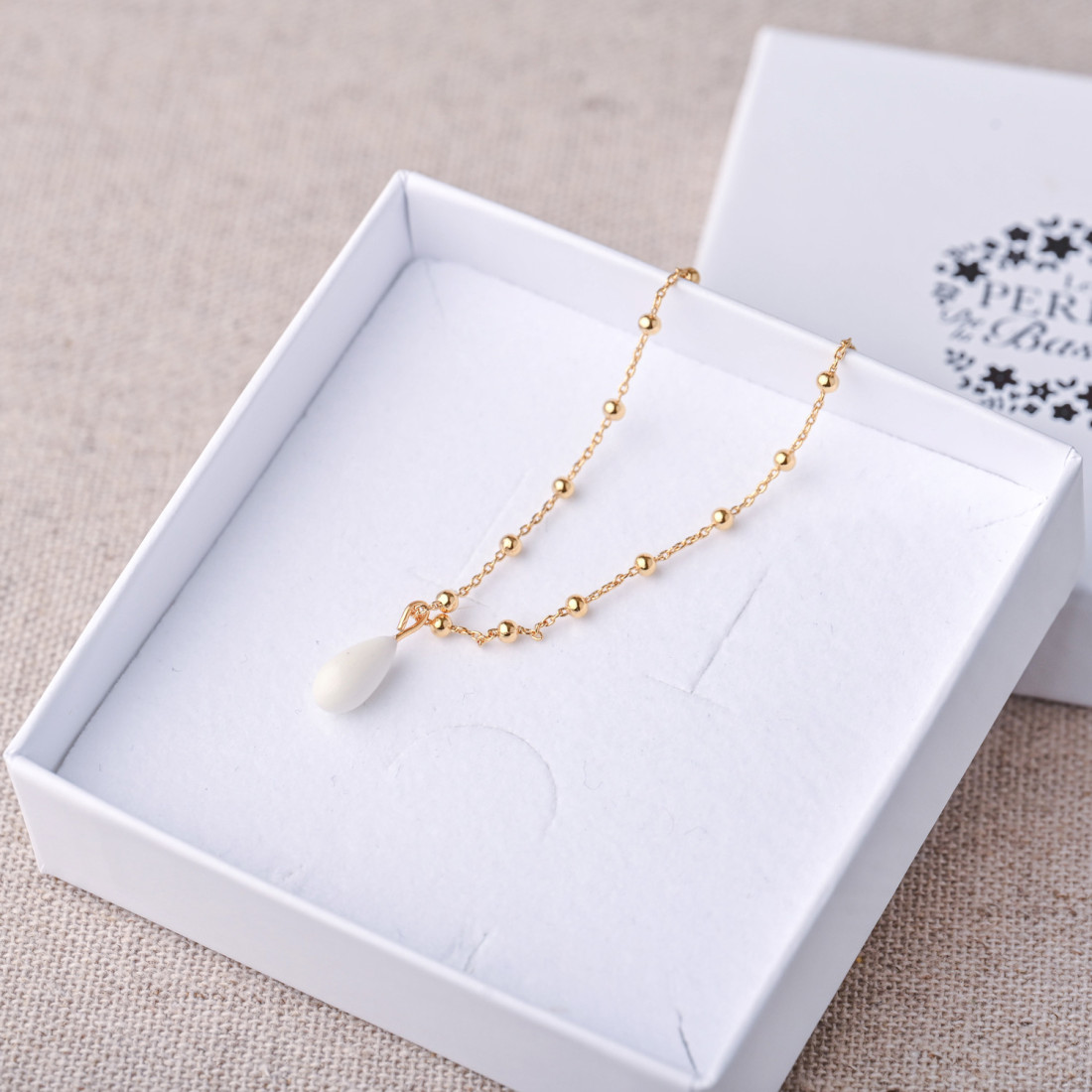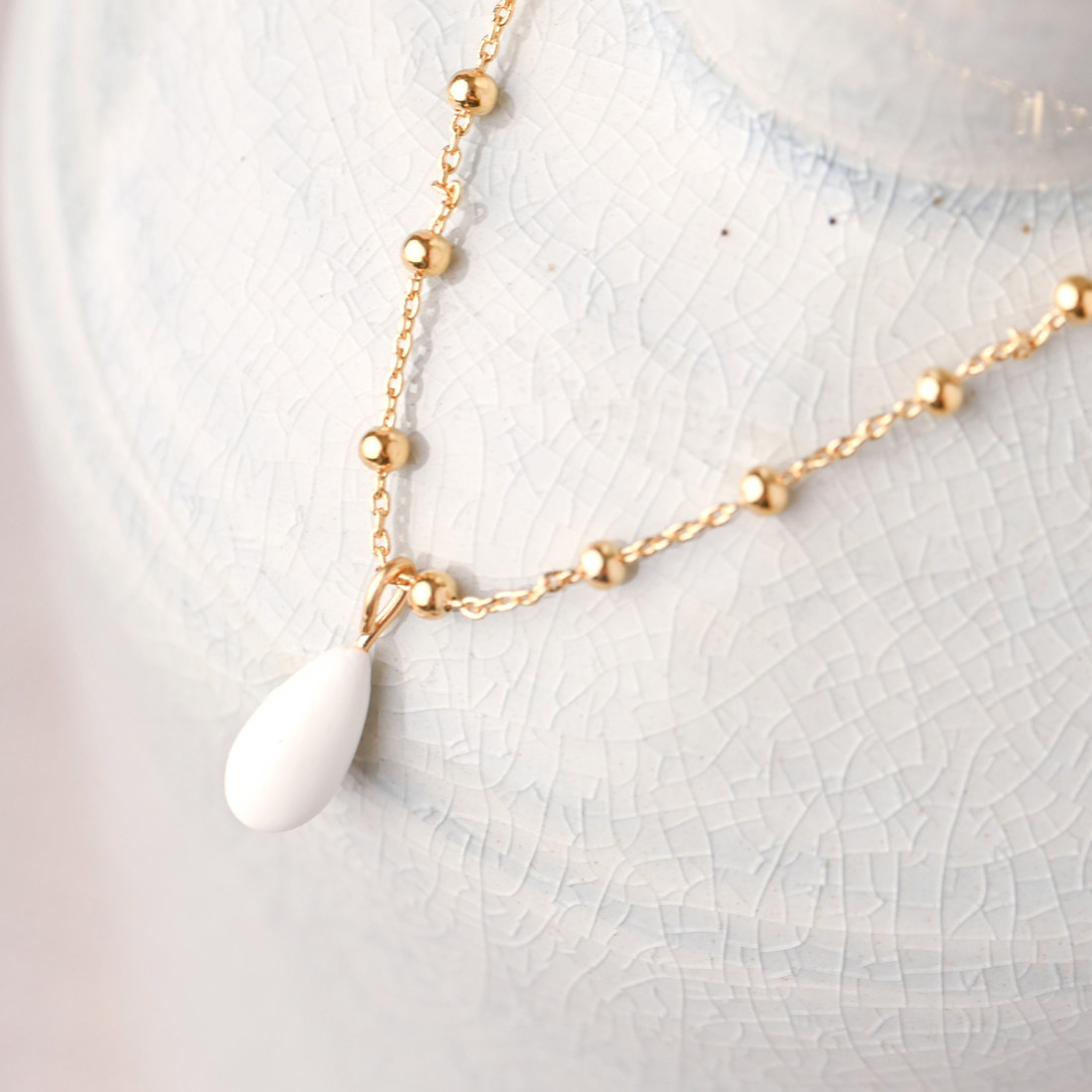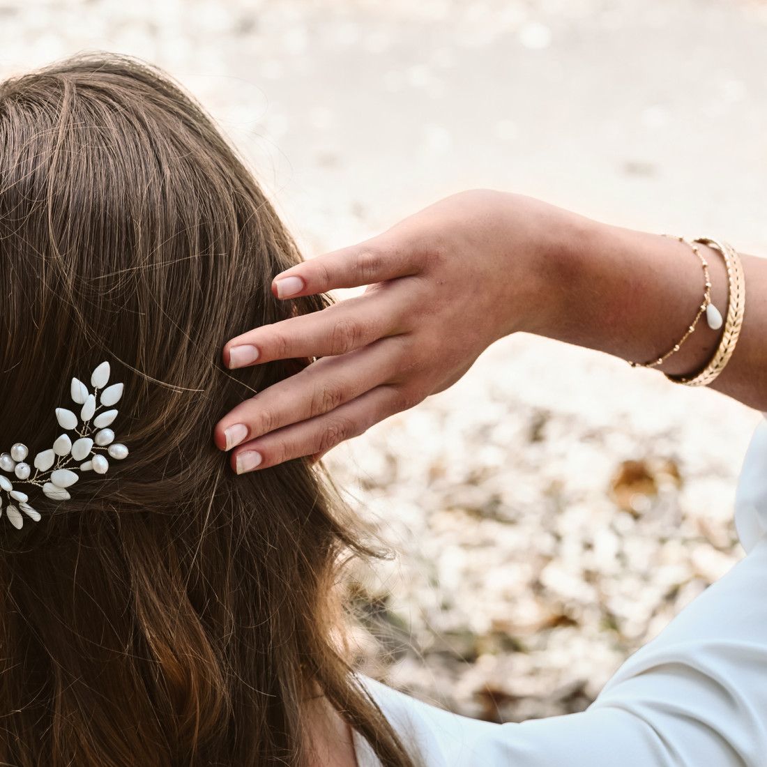 Joli bracelet chaîne boule plaqué or ou argent orné d'un bourgeon en porcelaine froide, entièrement façonnés à la main, et d'une perle d'eau douce. Une création signée Les Perles de la Bastide - Coraly T Bijoux.