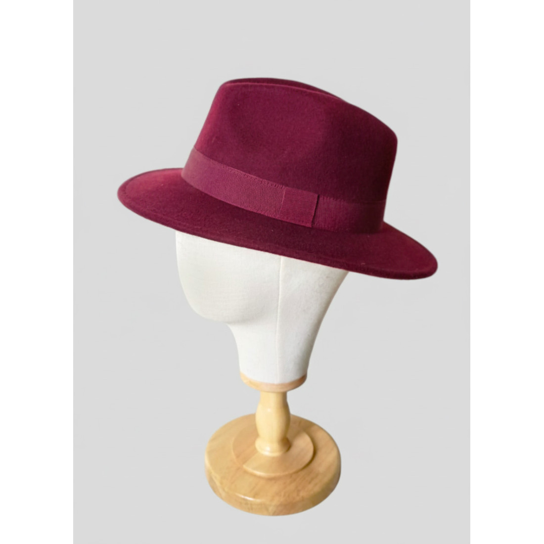 Indispensable de la saison, ce chapeau en feutre de laine bordeaux fabriqué à la main en Italie s'habille d'un joli ruban de lin fleuri de fleurs bordeaux et blanches.