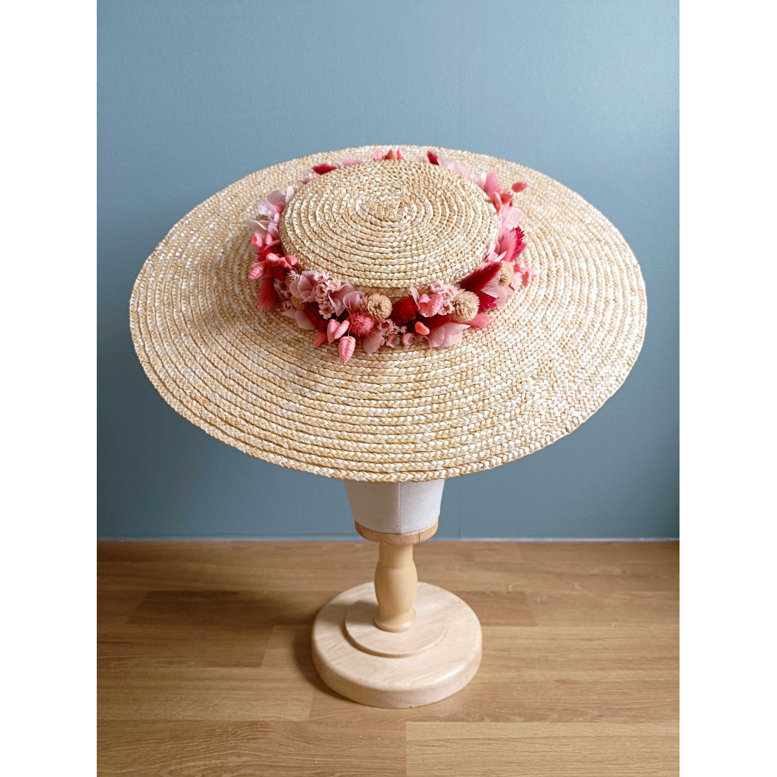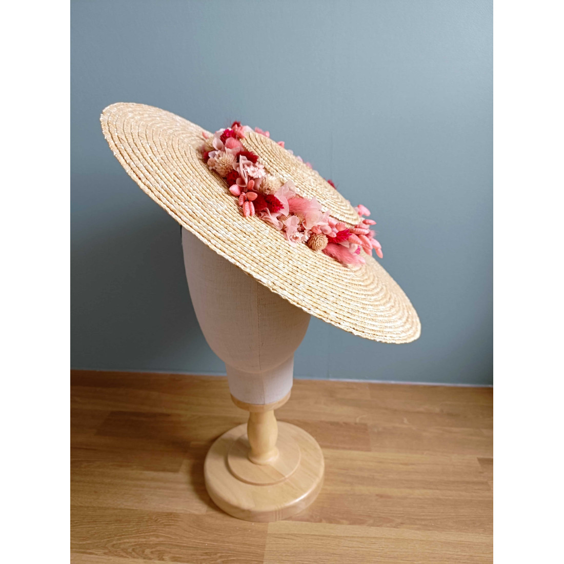 Chapeau en paille naturelle tressé à la main en France, orné d'un assemblage de fleurs séchées et stabilisées rose pâle, fuchsia, bordeaux. Ces nuances de rose illumineront votre tenue !