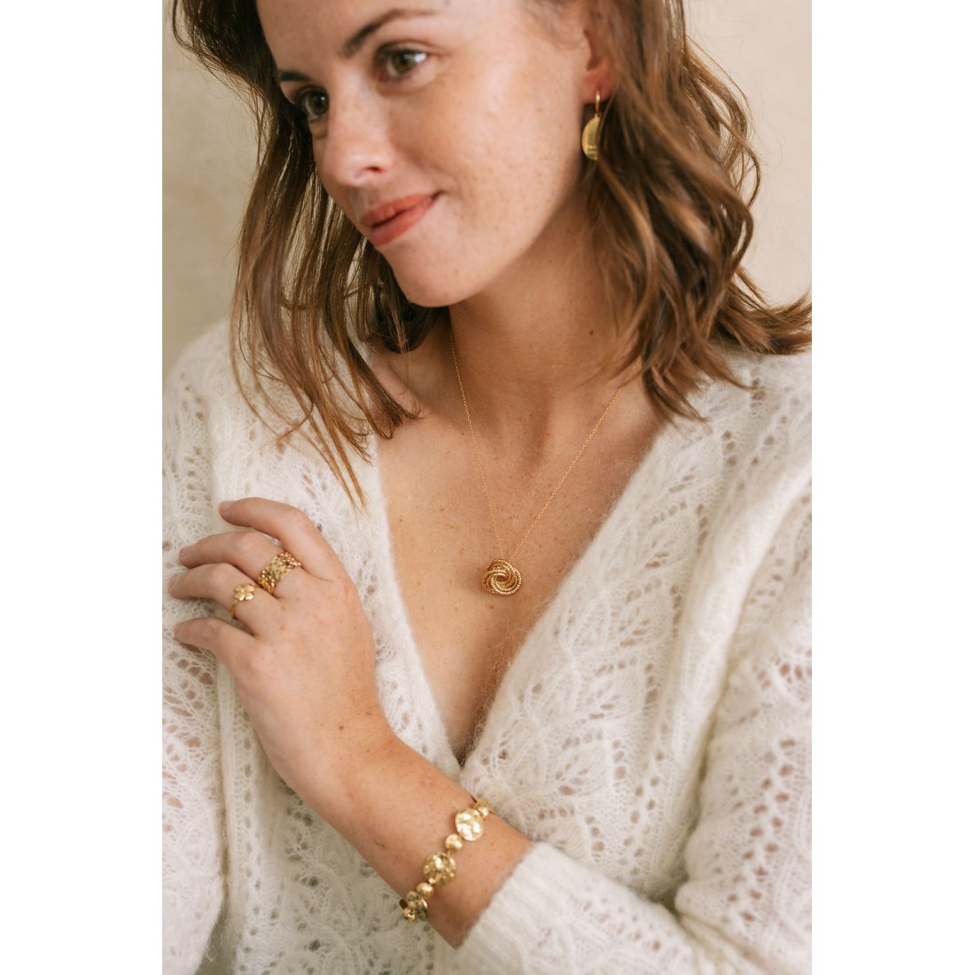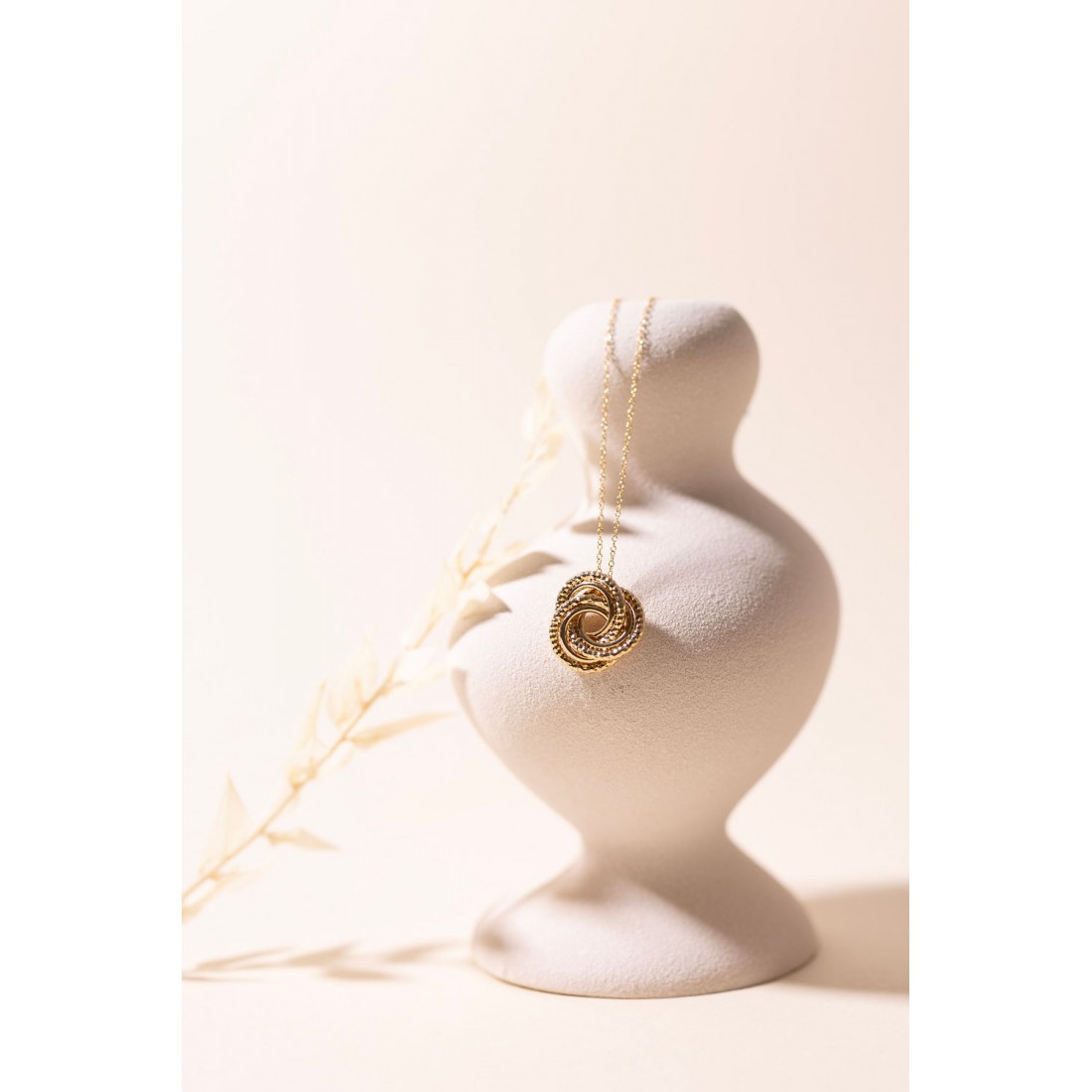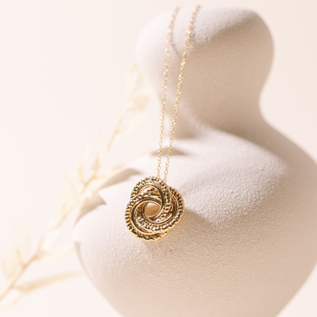 Joli collier doré à l'or fin 24 carats composé d'un pendentif de plusieurs anneaux texturés et entrelacés symbolisant l'union et l'attachement, monté sur une chaine simple.