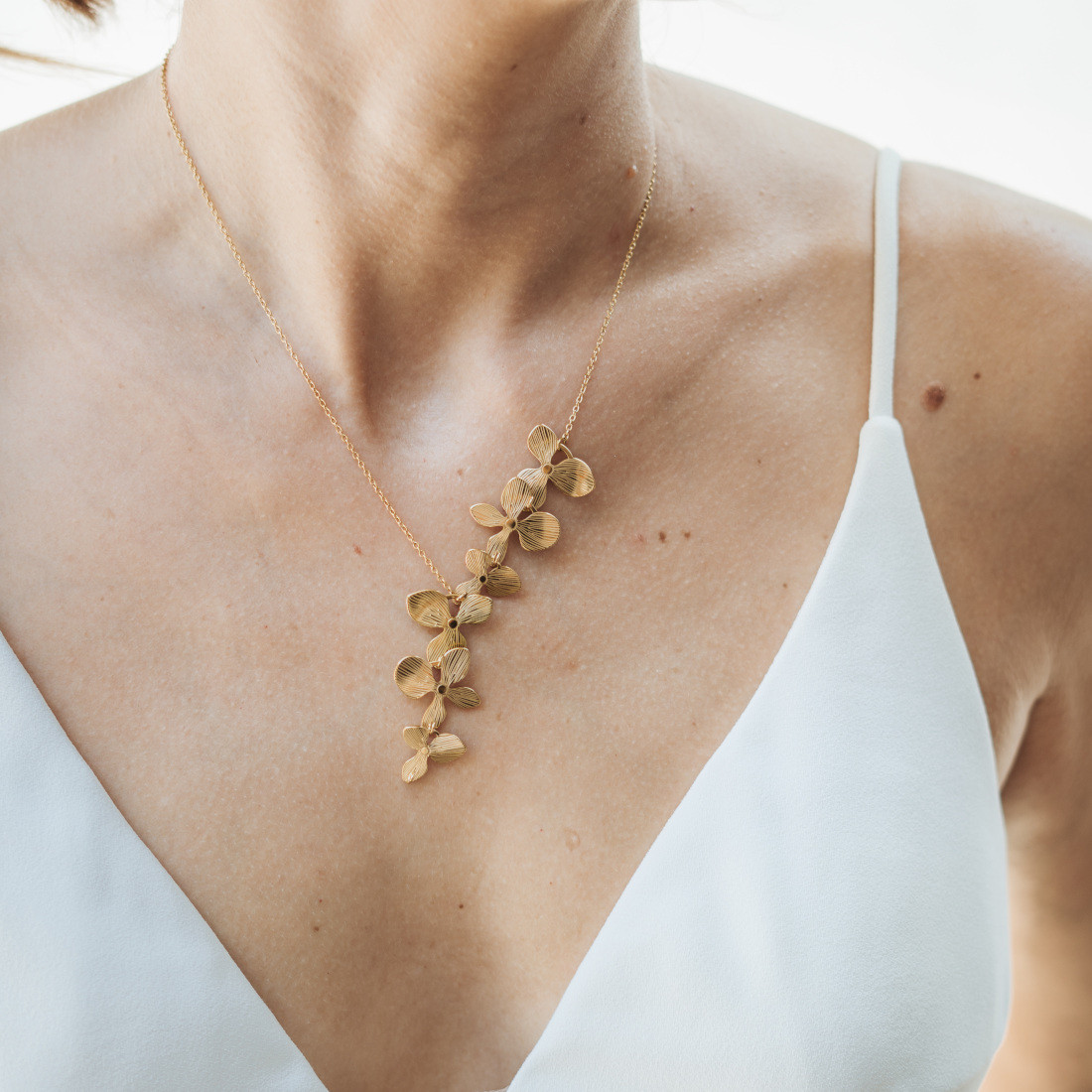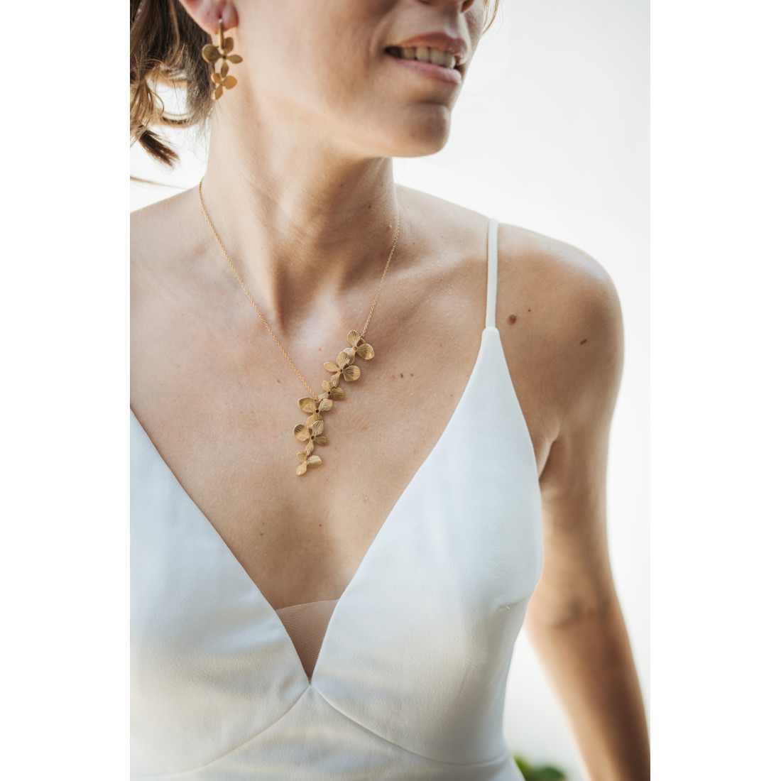 Joli collier asymétrique composé de fleurs dorées en acier inoxydable montées sur une chaine et d'une perle d'eau douce en option. Ce collier fleuri doré est idéal pour sublimer votre tenue de mariage.