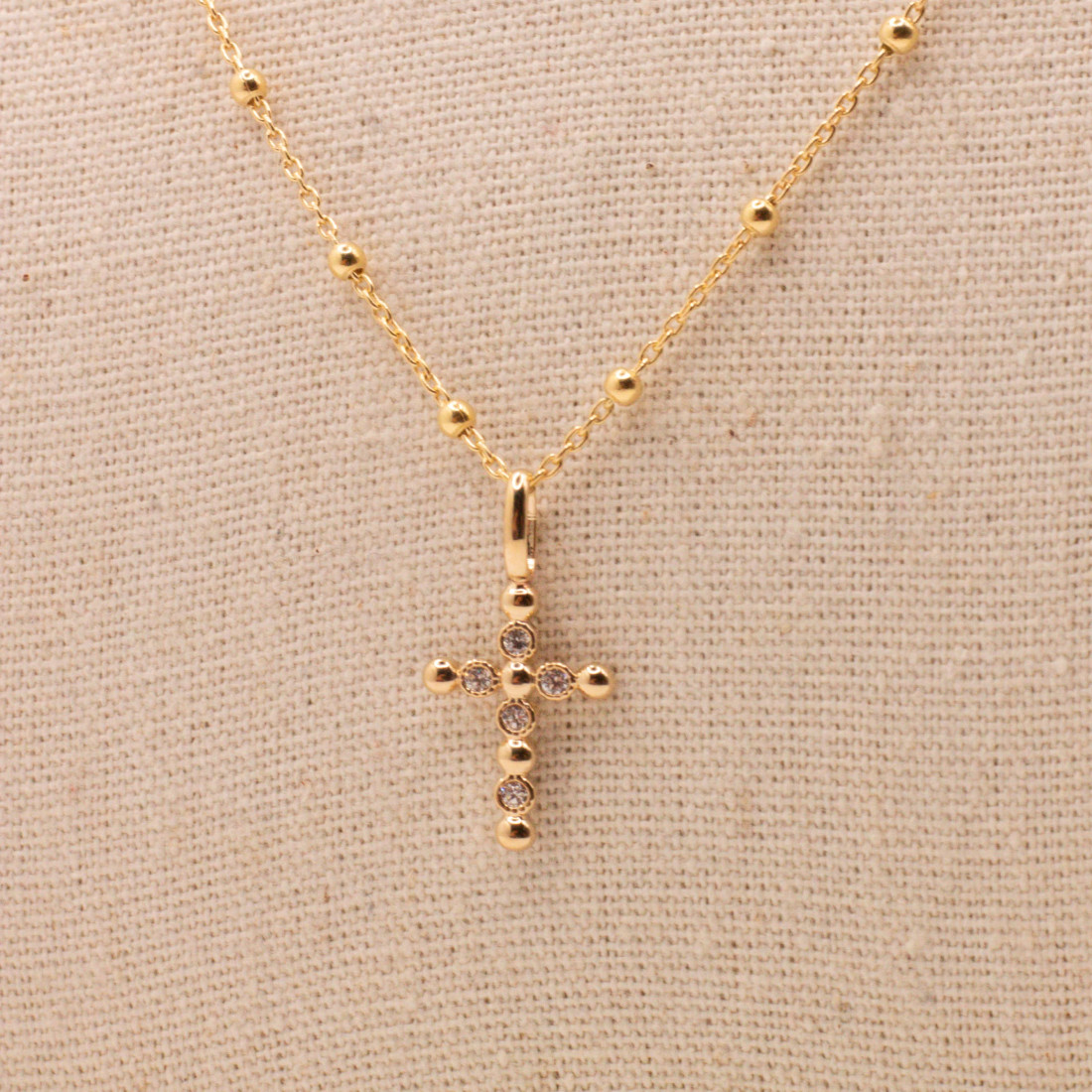 Collier Croix boules & zircons - pendentif croix - Comptoir Doré