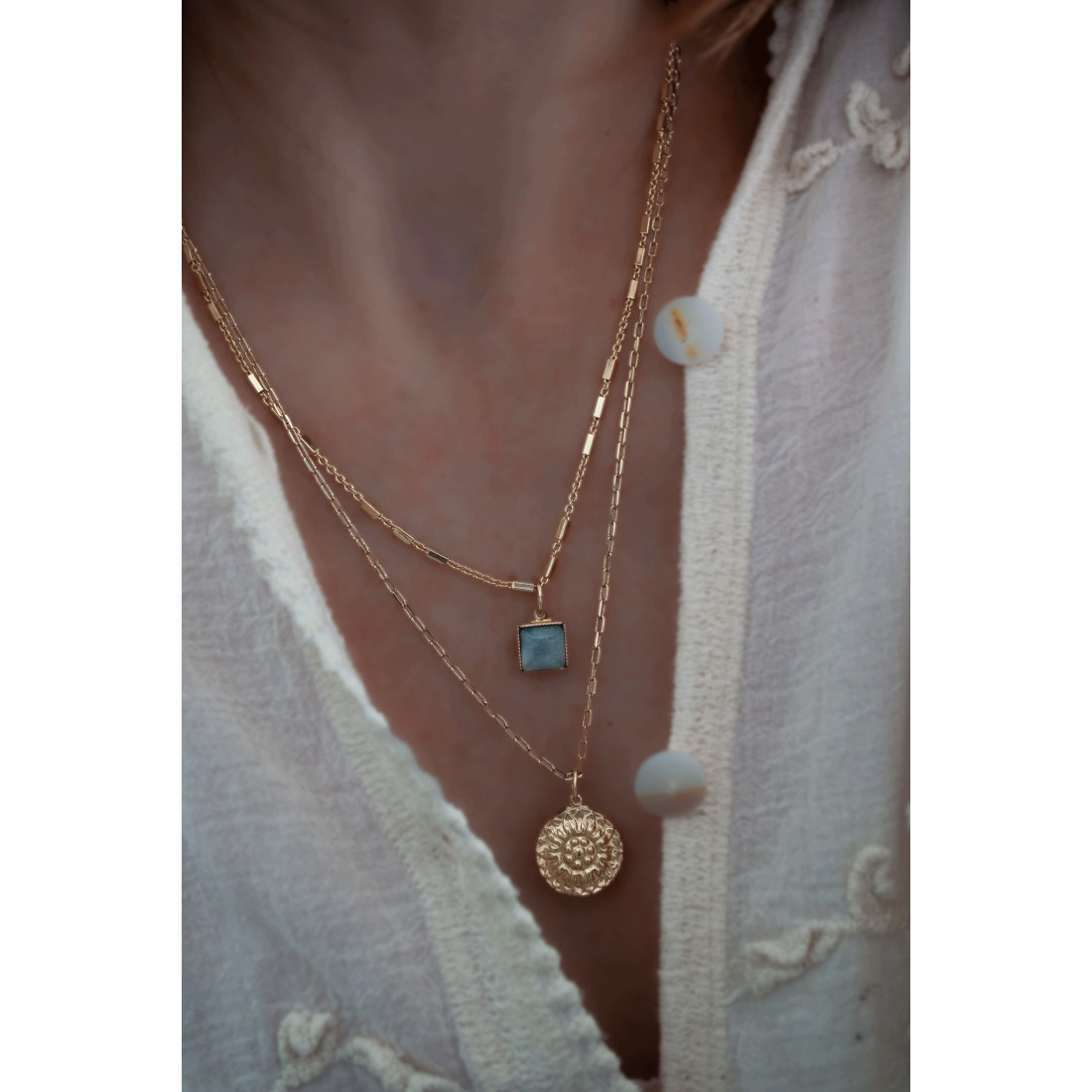 Réalisé en laiton recouvert d’or fin 24 carats (3 microns), le collier ne noircit pas et conserve son aspect dans le temps.