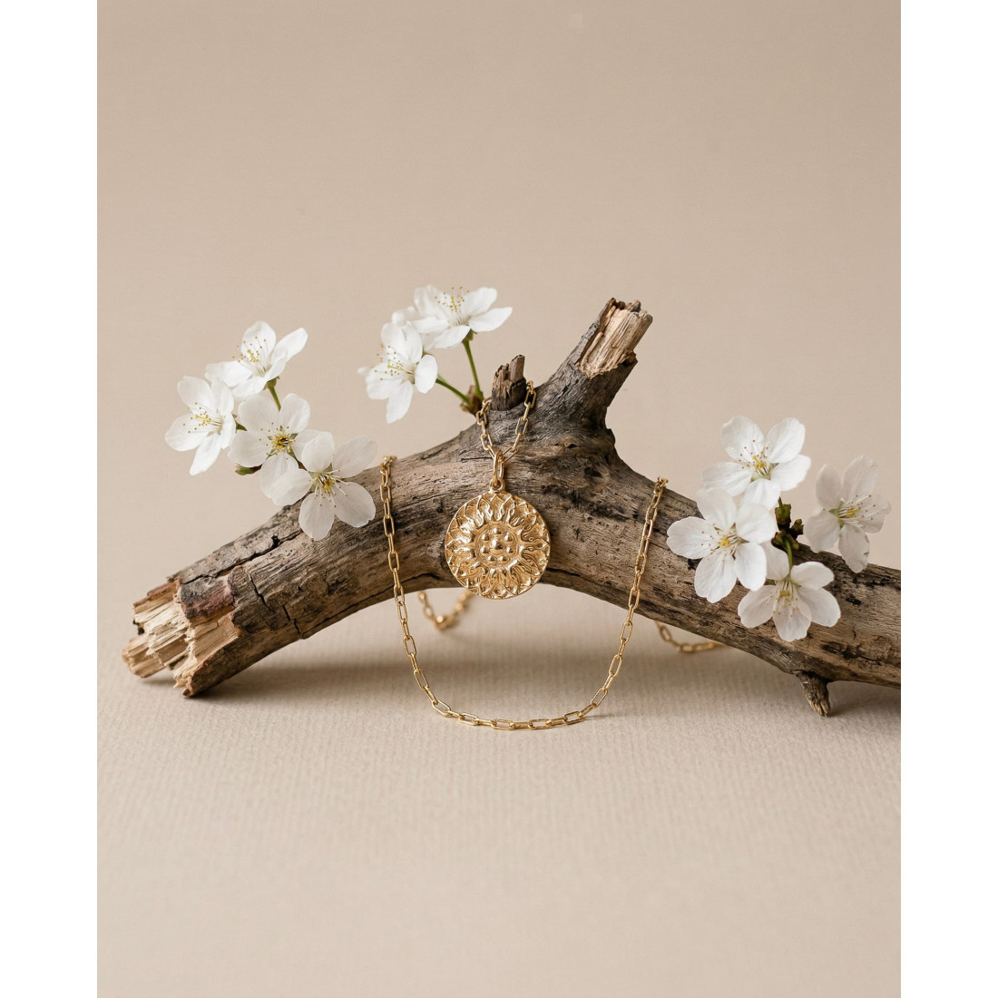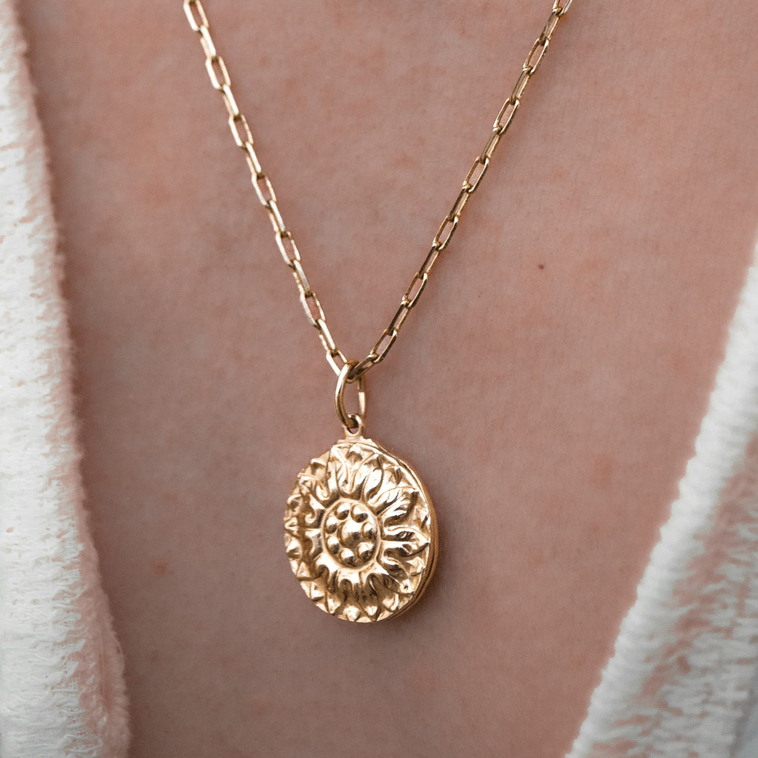 Le collier Bloom met en avant un pendentif rond au motif floral, travaillé en relief pour créer un jeu de texture discret. Les détails du motif apportent du caractère sans rendre le bijou trop présent.