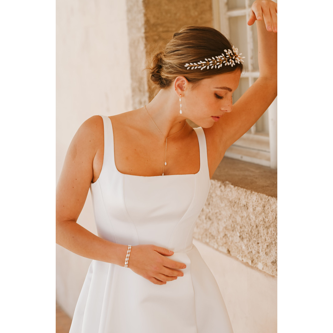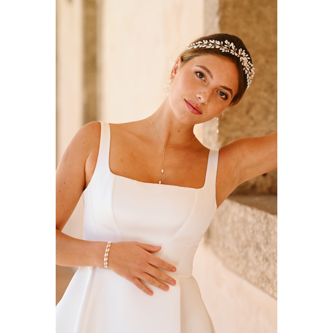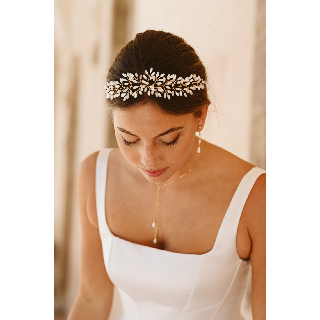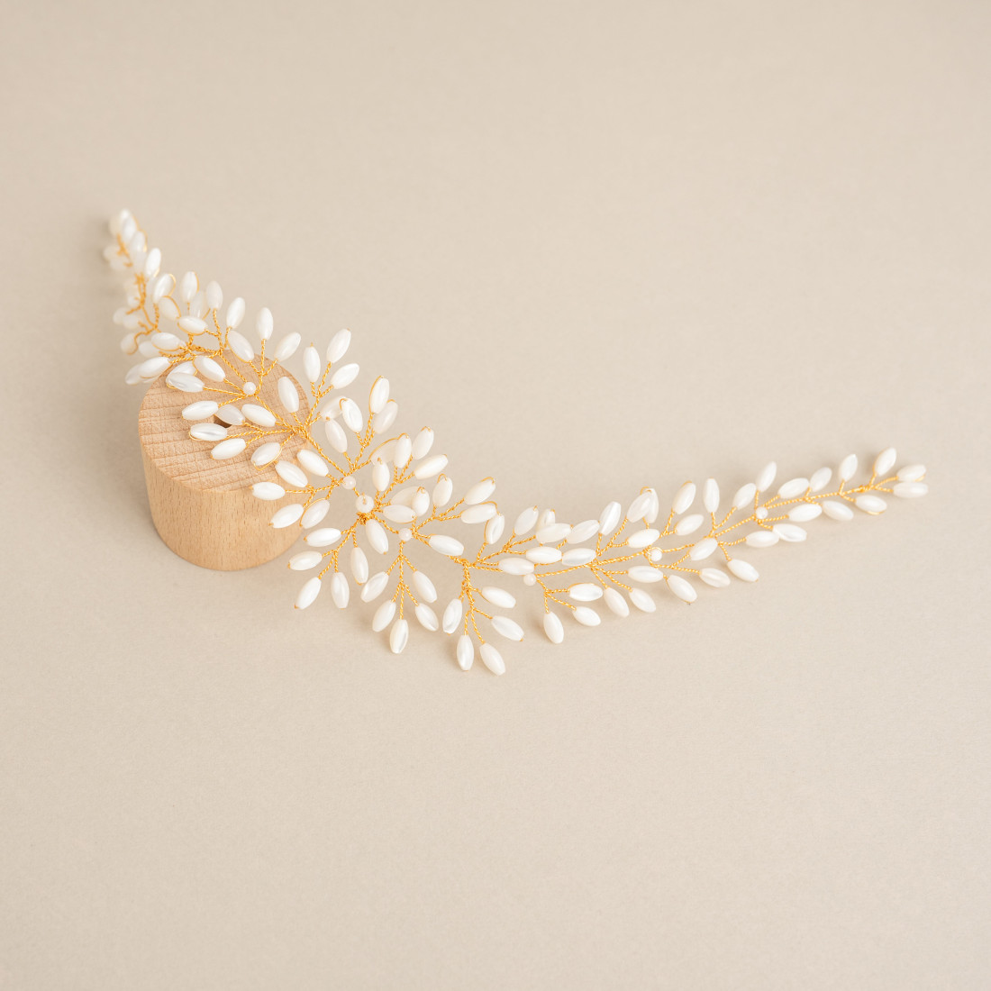Le bandeau Capucine ne se contente pas d'accessoiriser : il transforme votre allure. Les perles de nacre, taillées en navettes, forment un feuillage lumineux qui capte la lumière.