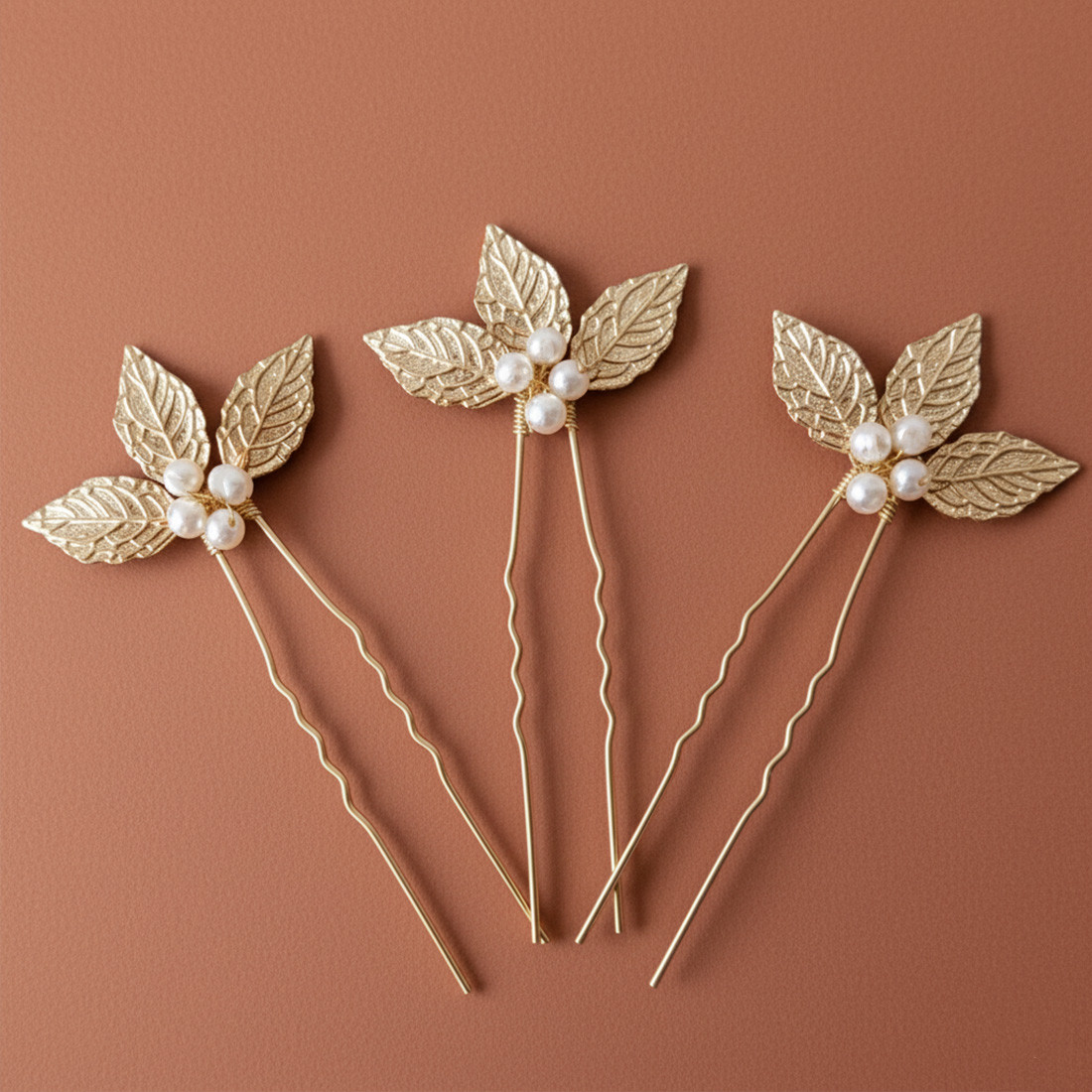 Lot de 3 épingles à chignon ornées de 3 petites feuilles dorées et de perles d'eau douce.