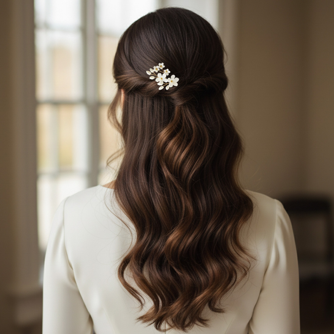 Joli pic à cheveux en porcelaine froide orné de petites fleurs blanches entièrement façonnées à la main. Nous recommandons de les porter en nombre impair dans votre coiffure (idéalement 3, 5 ou 7).