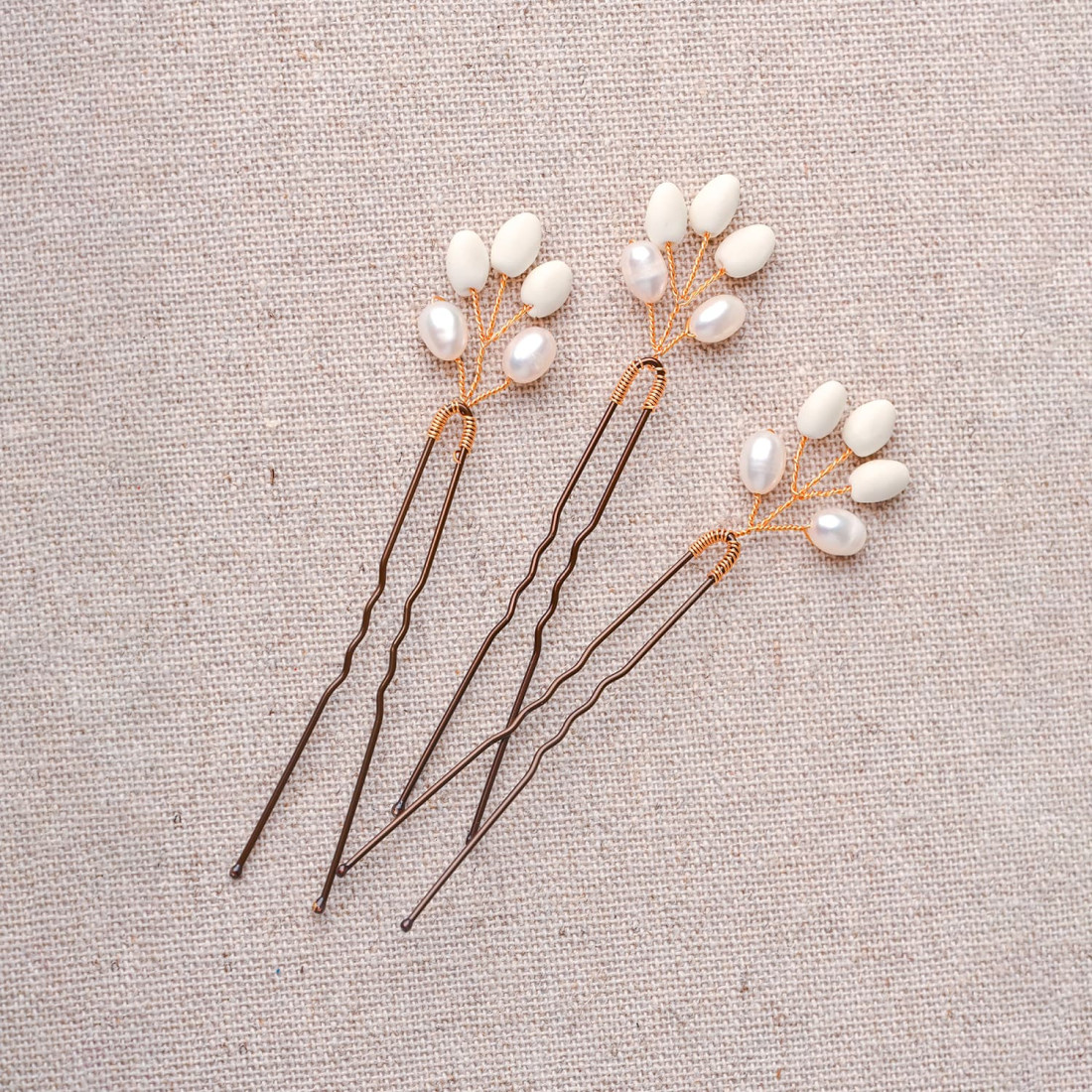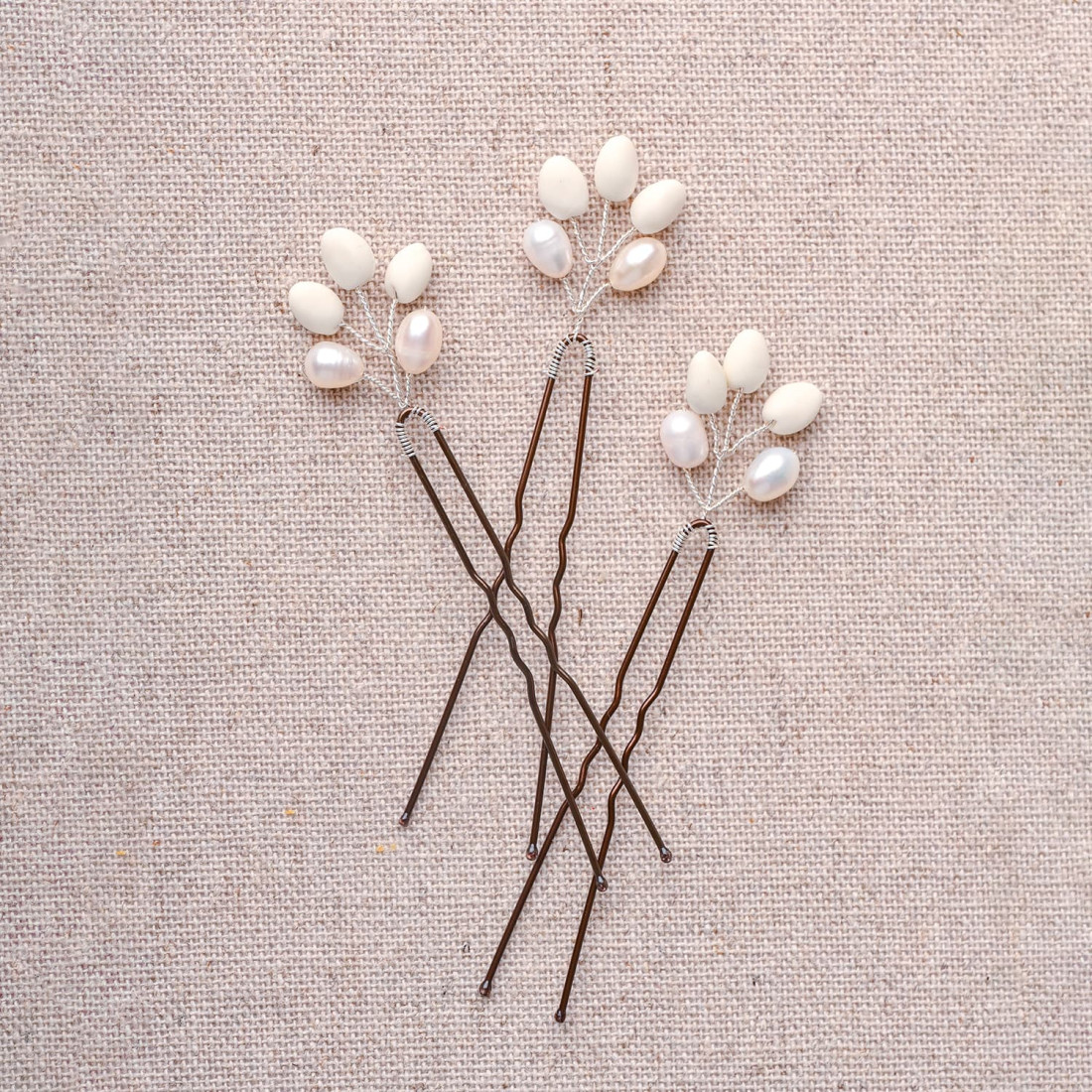 Lot de 3 jolis pics à chignon en porcelaine froide et perles d'eau douce. Base argentée ou dorée, bourgeons dans les tons blancs. Ces épingles à chignon sont l'accessoire cheveux idéal pour une magnifique coiffure de mariage.