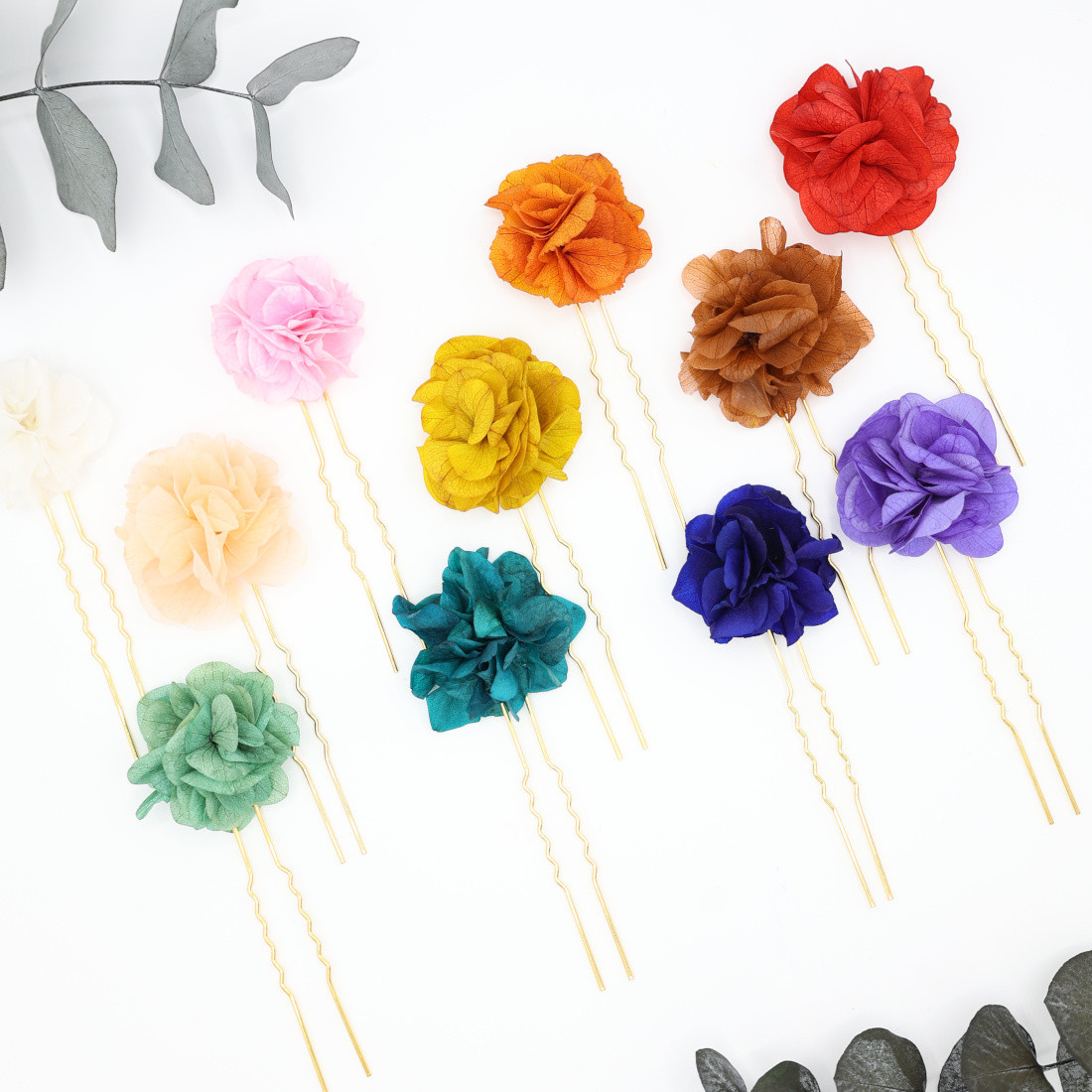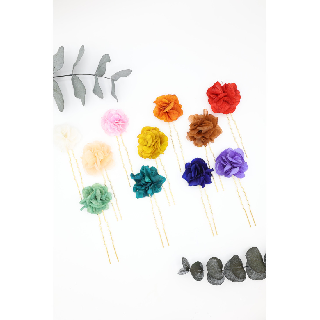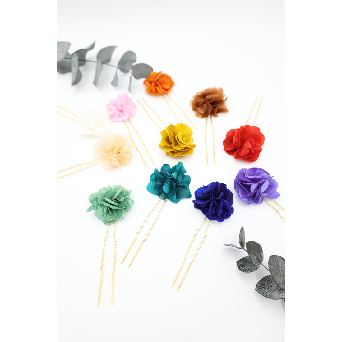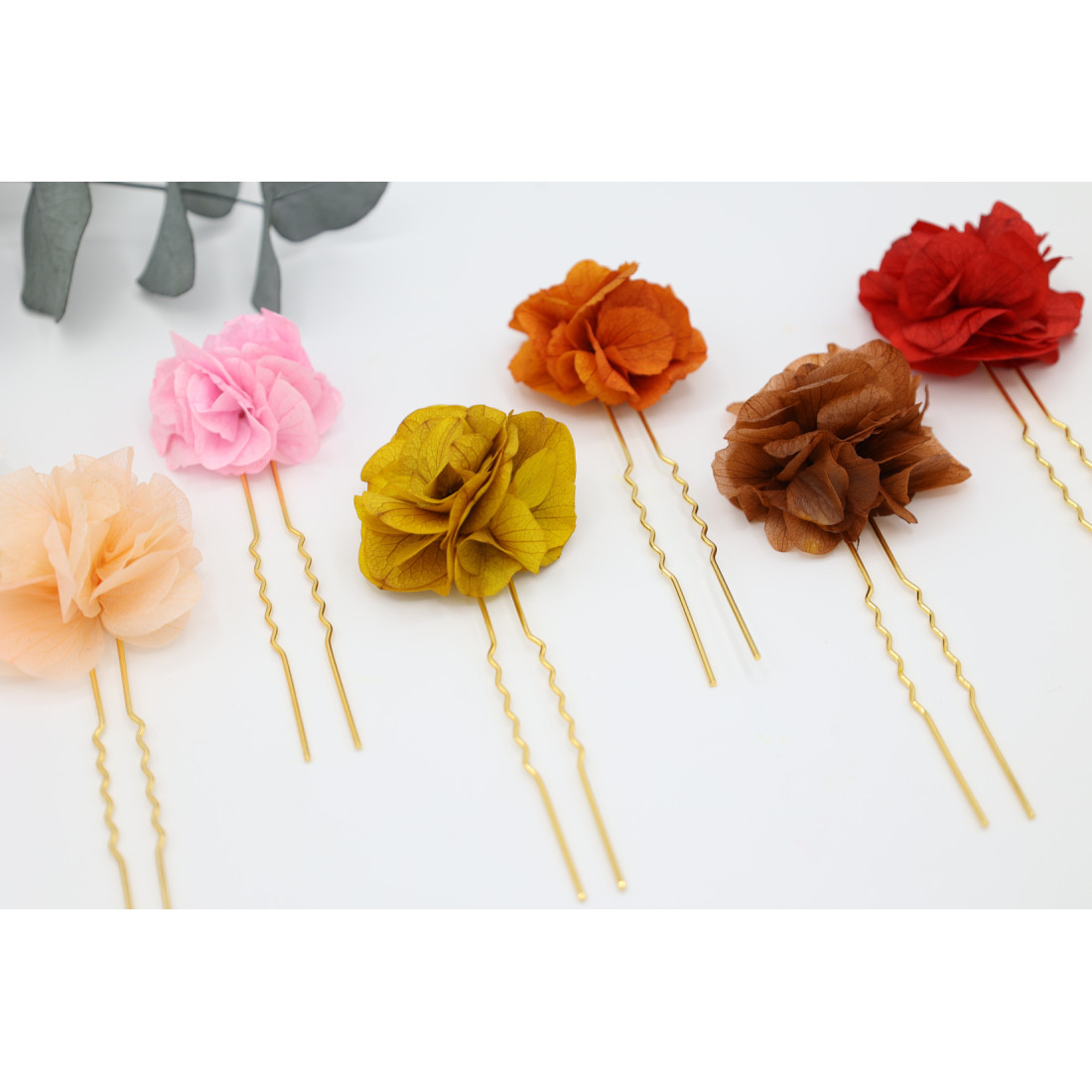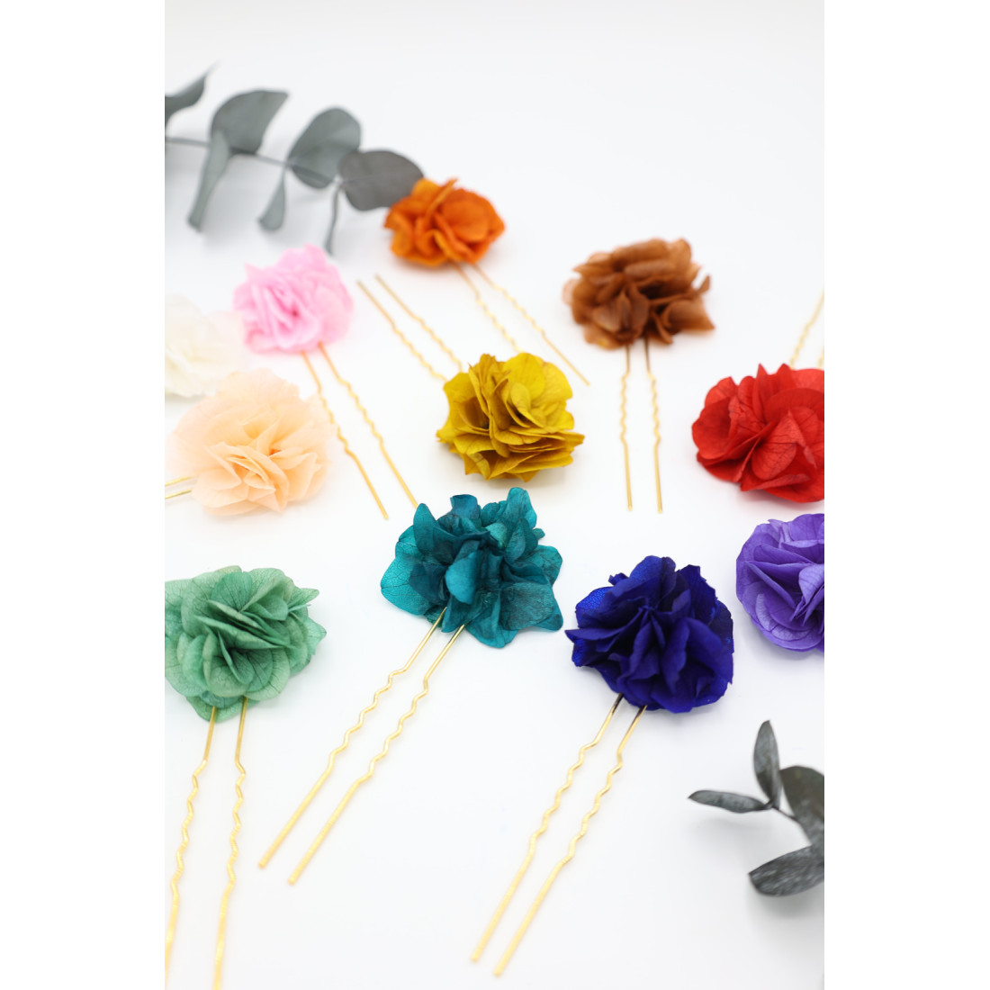 Jolie épingle à cheveux ornée d'une fleur d'hortensia colorée et stabilisée, assemblée à la main. Les fleurs sont éternelles, c'est à dire stabilisées, afin de ne jamais vieillir ou ternir avec le temps.