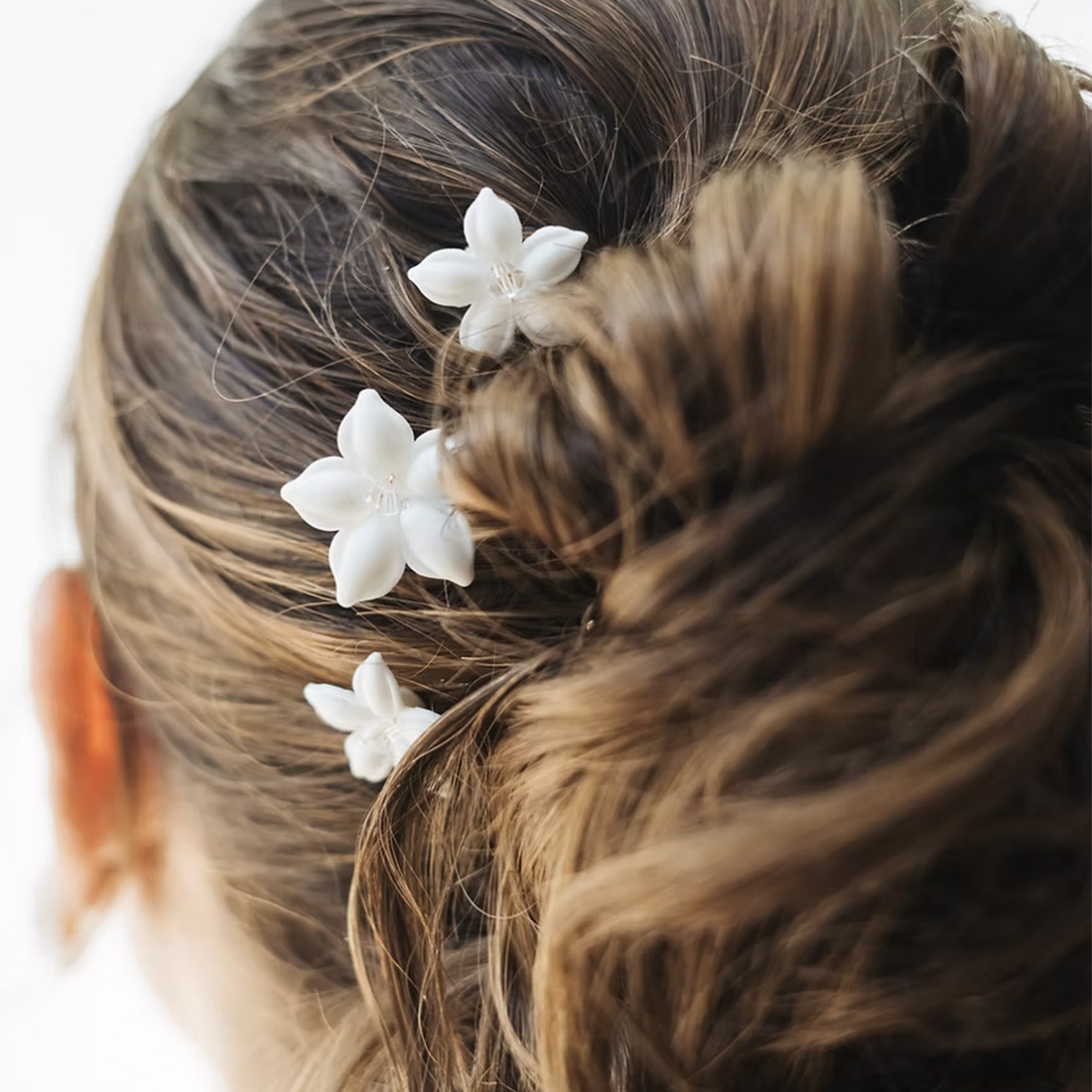 Sublimez votre coiffure de mariée avec ces épingles à cheveux ornées d'une fleur blanche en porcelaine, assemblées à la main. Un lot de 3 épingles comprend 3 piques à cheveux orné d'une fleur : 1 grande, 1 moyenne, 1 petite.