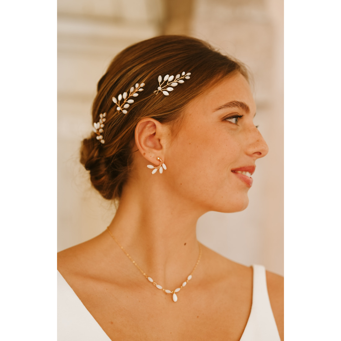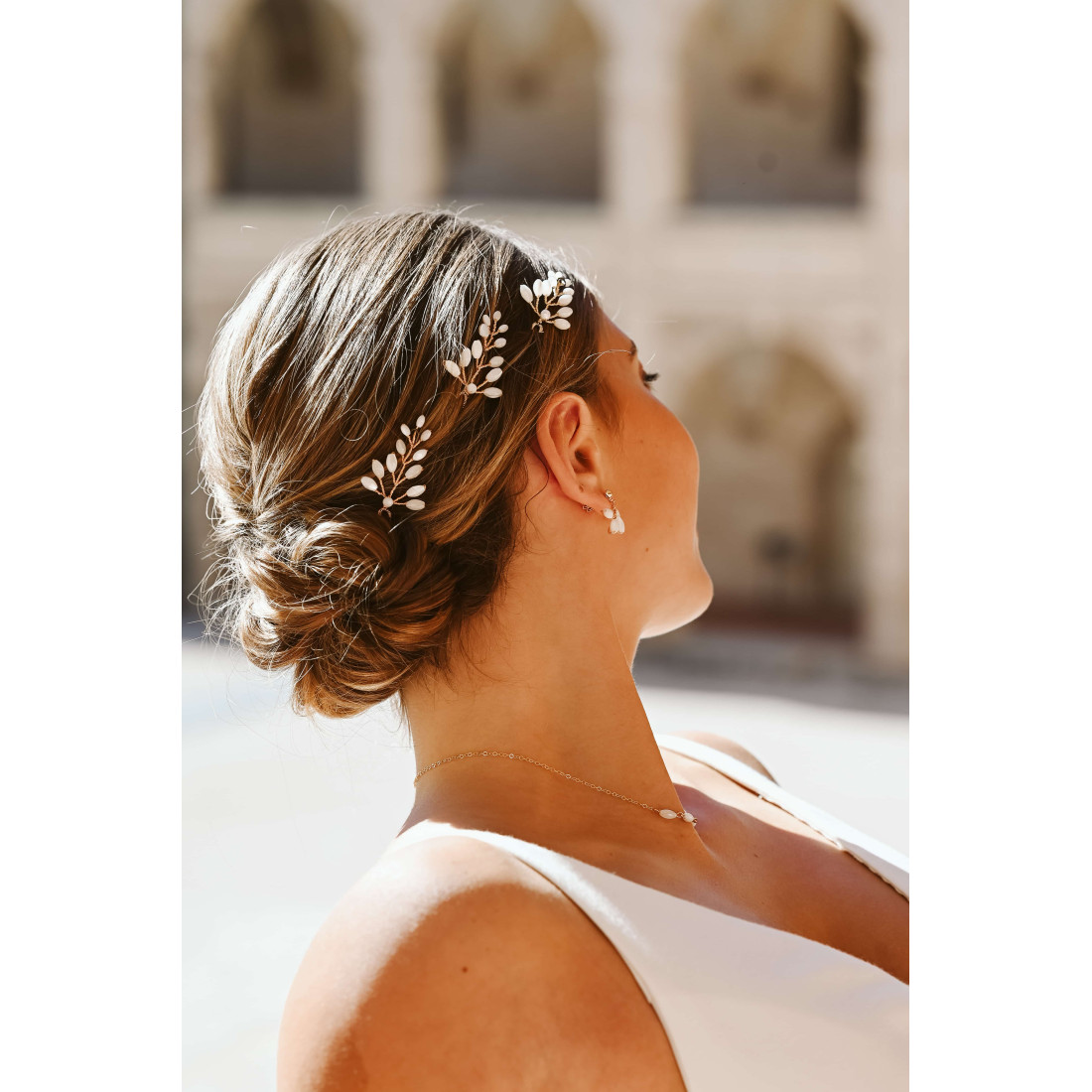 Sublimez votre coiffure de mariée tout en délicatesse avec les Pics à cheveux Demeter, un lot de 3 épingles à chignon de mariée entièrement fabriquées à la main. Ces pics cheveux mariée sont ornés de jolies perles de nacre, montées sur un fil torsadé, idéal pour accessoiriser votre coiffure de mariée.