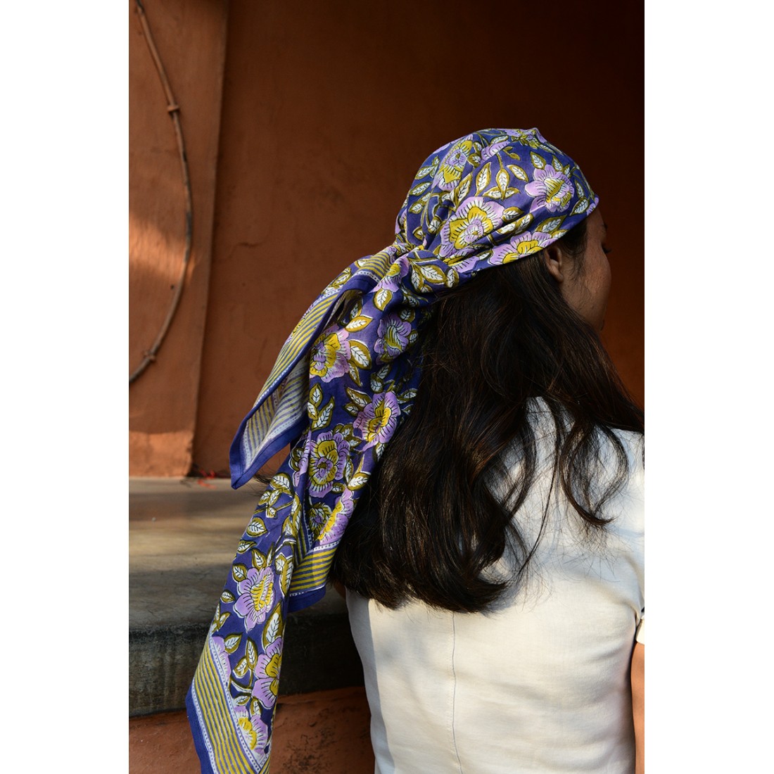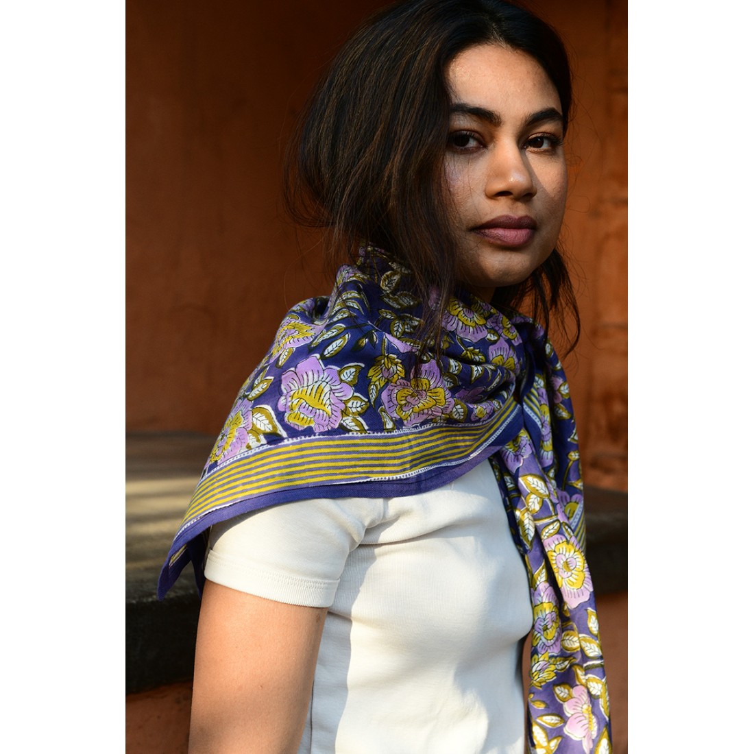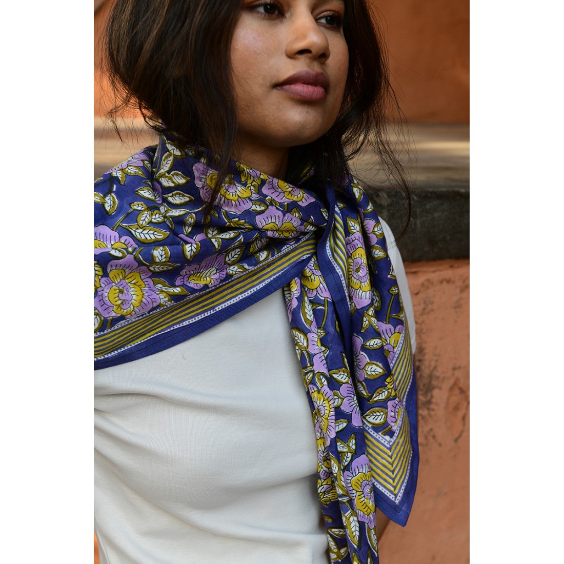 Grand foulard en blockprint indien, modèle 113 Bleu.