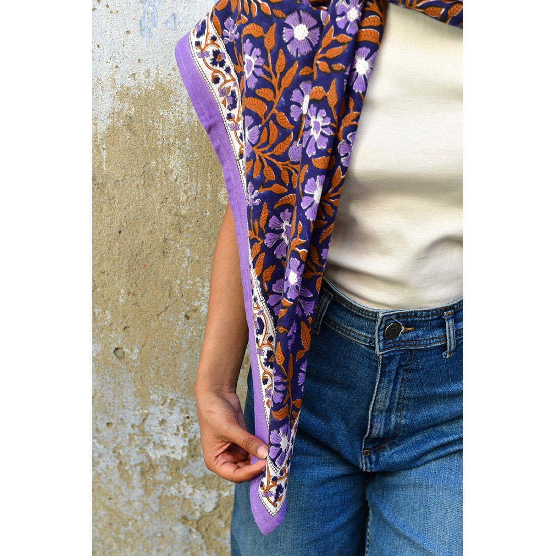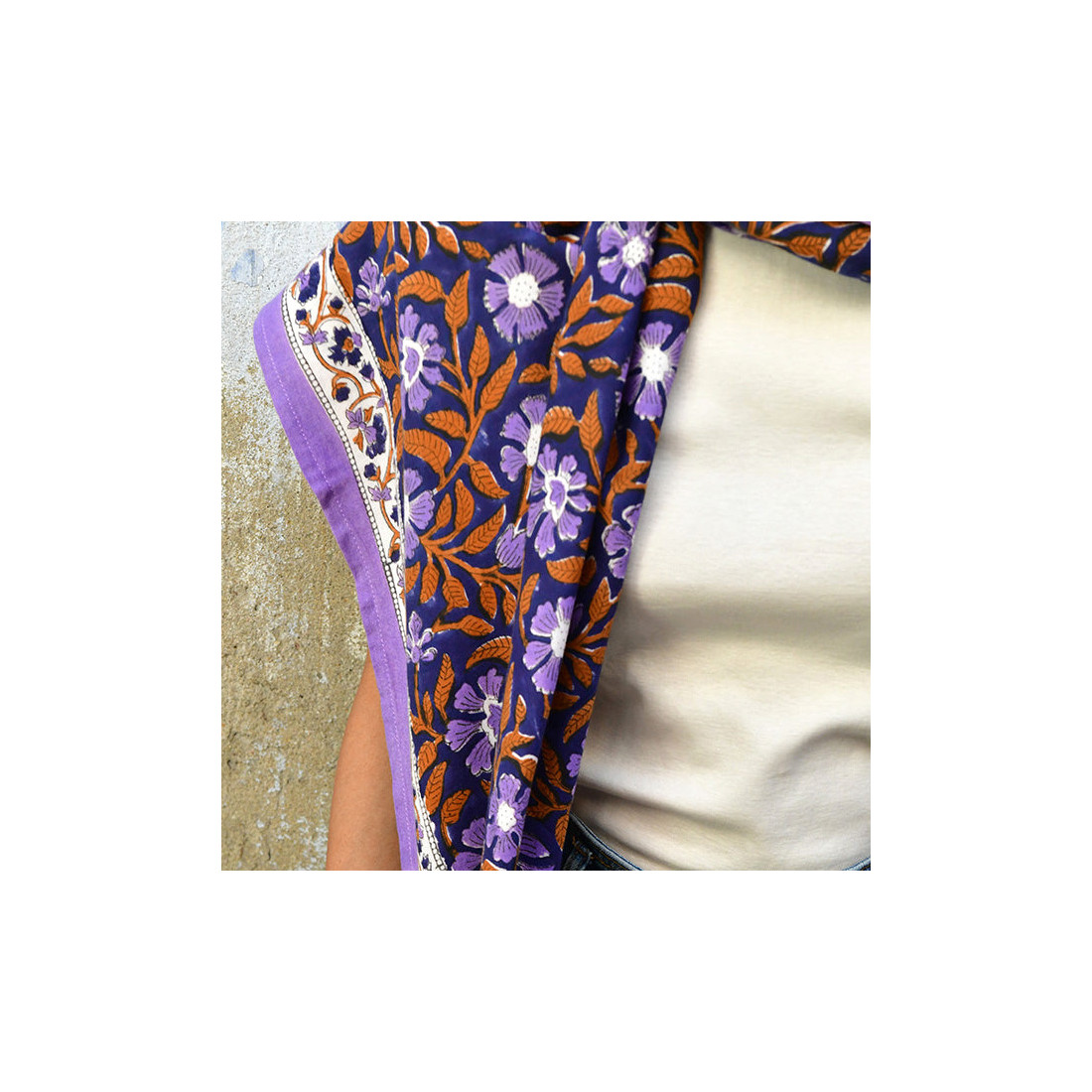 Grand foulard en blockprint indien, modèle 115 Nuit, bordure et motifs lilas, notes d'orange et fond bleu nuit.