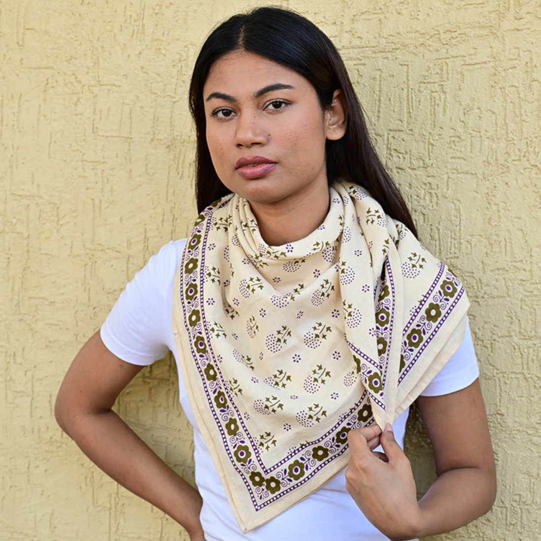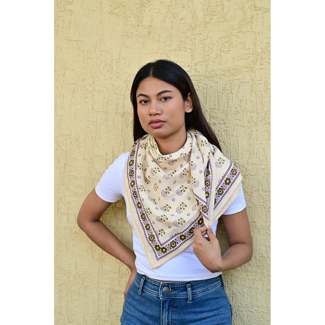 Réalisé exclusivement en 100% twill de coton indien, ce carré de 100x100 cm allie douceur et durabilité. Sa fibre naturelle laisse respirer la peau, rendant ce foulard agréable à porter en toute saison en en faisant un compagnon idéal, été comme hiver.