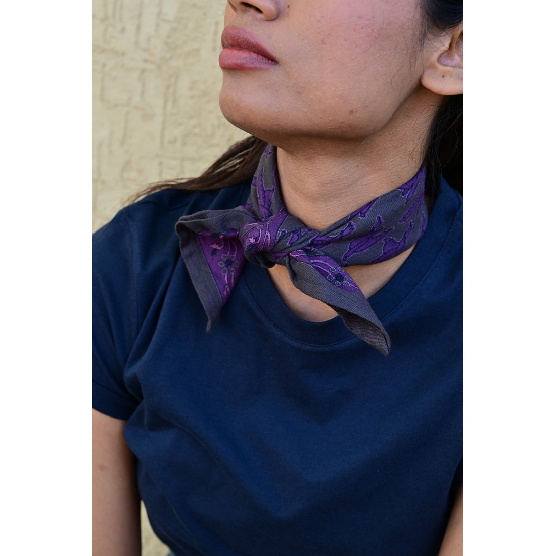 Donnez du caractère à votre allure avec le petit foulard Mercure Grisaille de Byzantine. Ce carré généreux de 50x50 cm est fabriqué en 100% twill de coton indien, un tissu résistant et d'une grande douceur. Sa particularité ? Une impression artisanale réalisée selon la technique du blockprint : les motifs d'oiseaux violets sont appliqués à la main avec des tampons en bois et des encres d’origine végétale. Léger et facile à porter, ce petit foulard se noue de mille façons pour sublimer vos tenues quotidiennes. Une pièce unique qui mise sur les matières naturelles pour donner une touche preppy-chic à votre tenue.