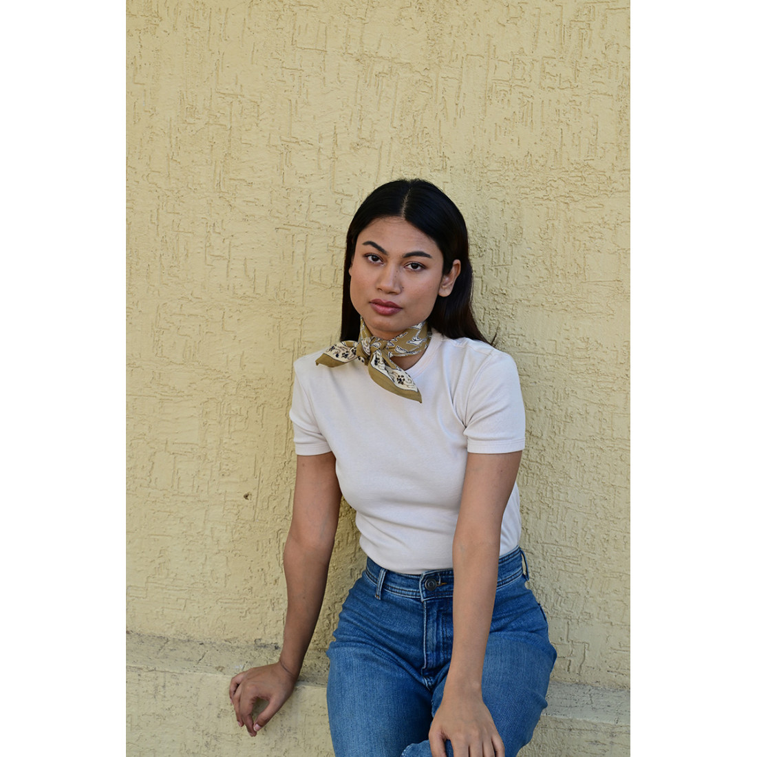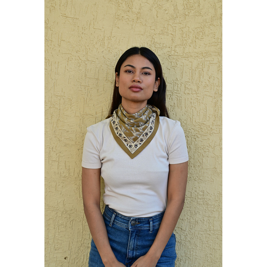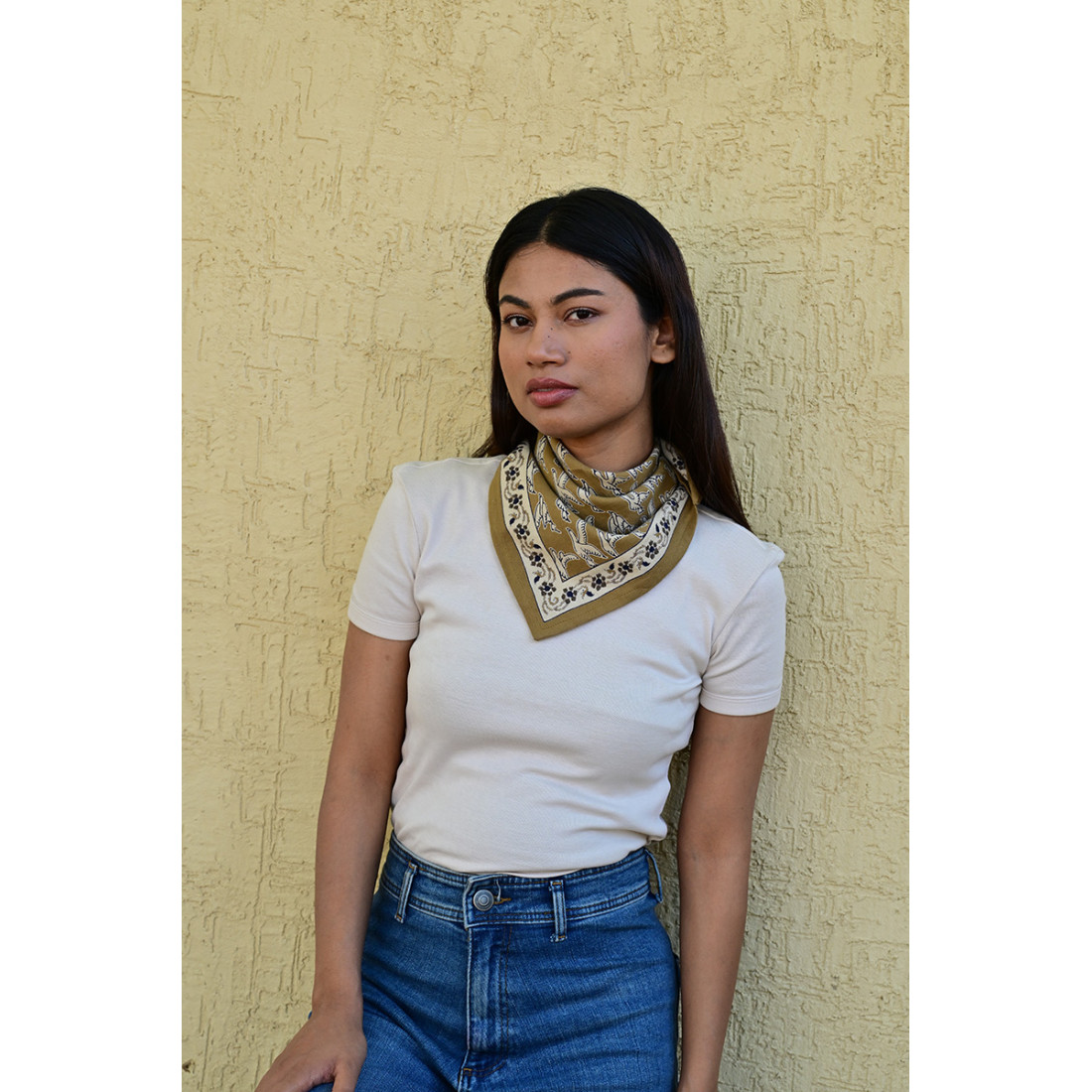 Femme portant le petit foulard Mercure Bistre 50x50 cm noué autour du cou.